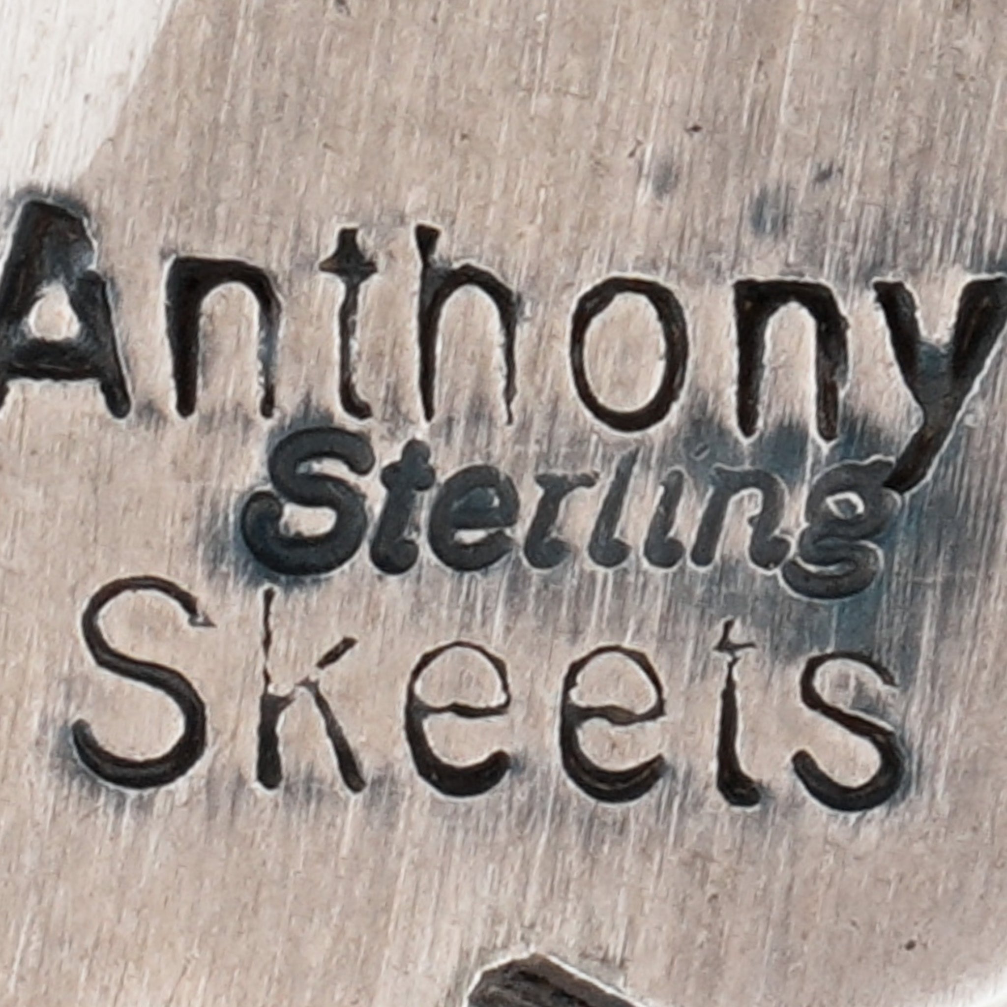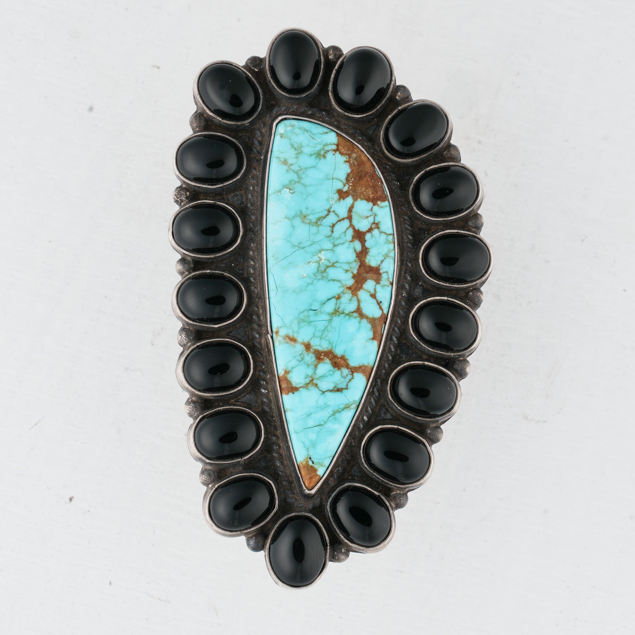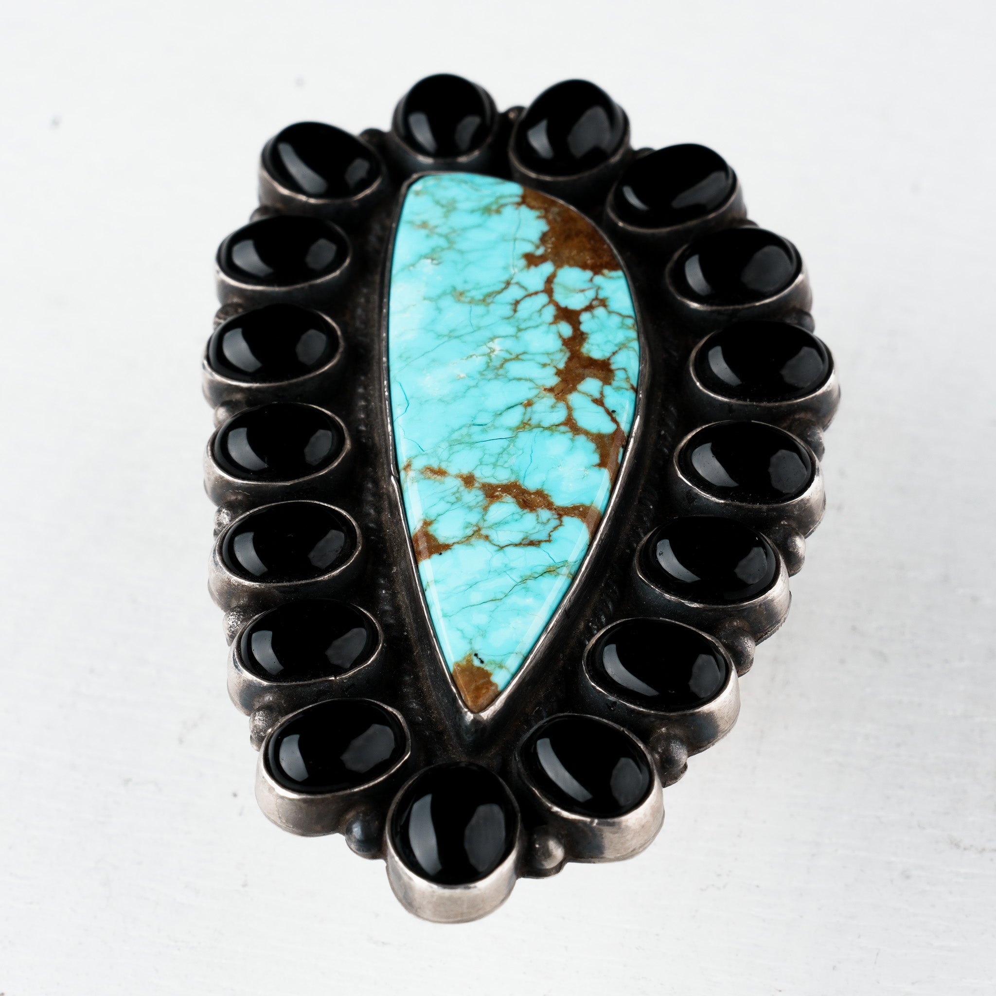 Accomplished artisan Anthony Skeets presents a stunning celebration of Number Eight Turquoise and black onyx. Each hand-cut stone is carefully set in a sterling silver background with a satin finish. An elegant yet bold piece, this ring is an eye-catching addition to any wardrobe.