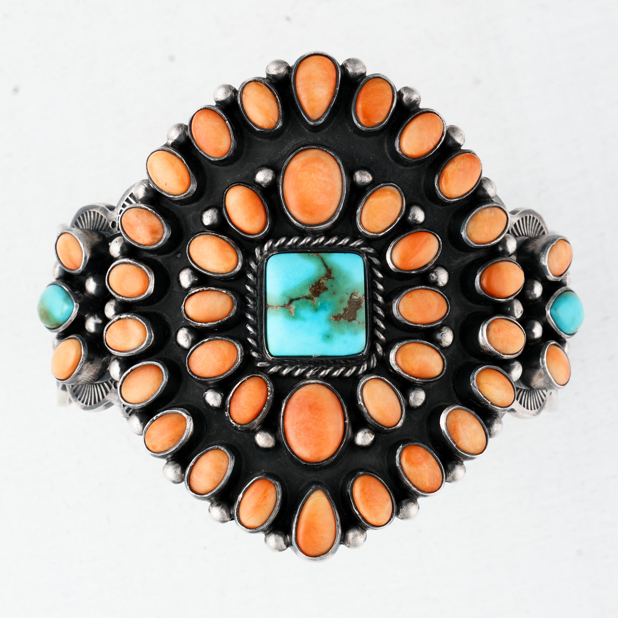 Arranged in a cluster style, Sonoran Gold Turquoise and spiny oyster shell are wrapped in stamped sterling silver. Hand-crafted by Murphy Platero, this vibrant cuff is a celebration of natural materials. Oxidated sterling silver adds depth between the stones that compose the face of this stunning cuff, while polished sterling silver adds brightness to the cuff's sides. An eye-catching work of art, this is a bold piece sure to be loved for generations.
