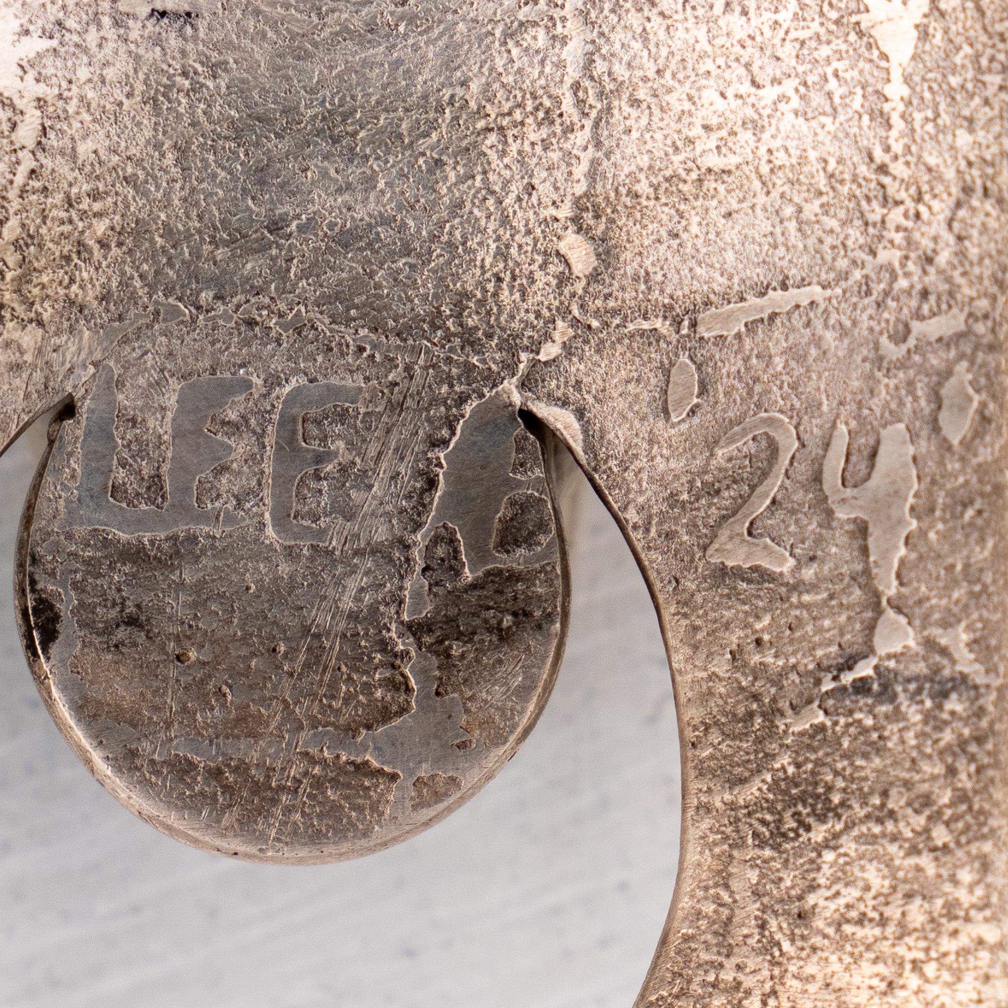 Constructed from tufa cast sterling silver, this beautiful cuff handcrafted by Lee Begay is full of texture. A unique Egyptian Turquoise stone dips into hollow of the naja at the center of this cuff, flanked by subtle yet impactful silver-work. With its vibrant blue turquoise and the texture offered by tufa casting techniques, this cuffs full of depth.