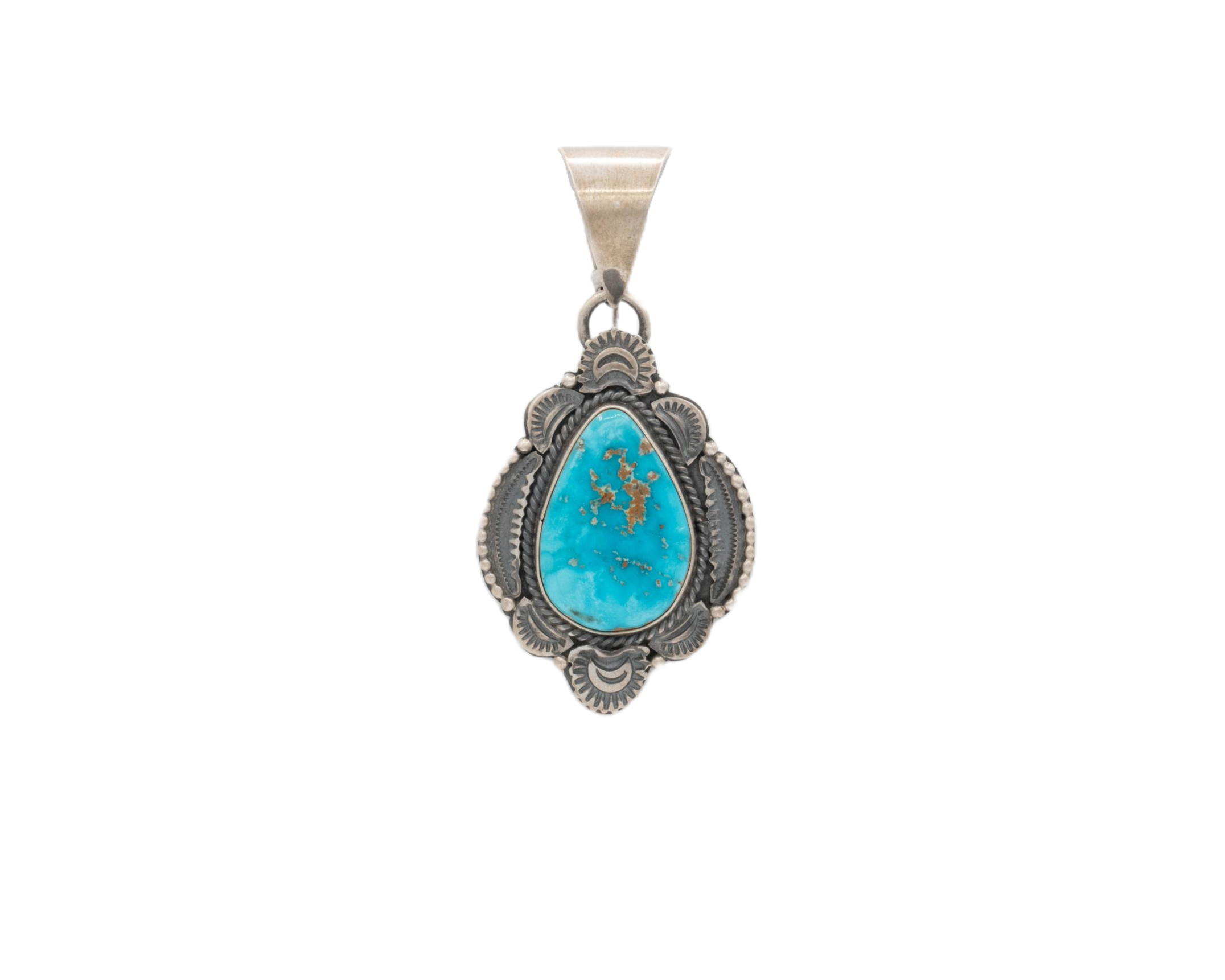 This gorgeous pendant was crafted by the acclaimed Navajo artists Michael and Rosita Calladitto. Featuring a stunning Blue Ridge Turquoise stone wrapped in twisted sterling silver, this pendant is a unique, eye-catching piece. Hand-stamped designs decorate the edges along with silver drop accents to create a beautiful depth of design.