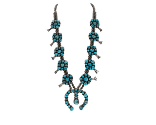 This stunning squash blossom necklace was lovingly crafted by Navajo artist Wilson Dawes. Rich blue Kingman Turquoise stones hold center place, wrapped in a sterling silver setting and even further elevated by silver drop accents and twisted wire details. With the turquoise stones' rich hues and Dawes' skilled craftsmanship, this piece is a statement work of wearable art.