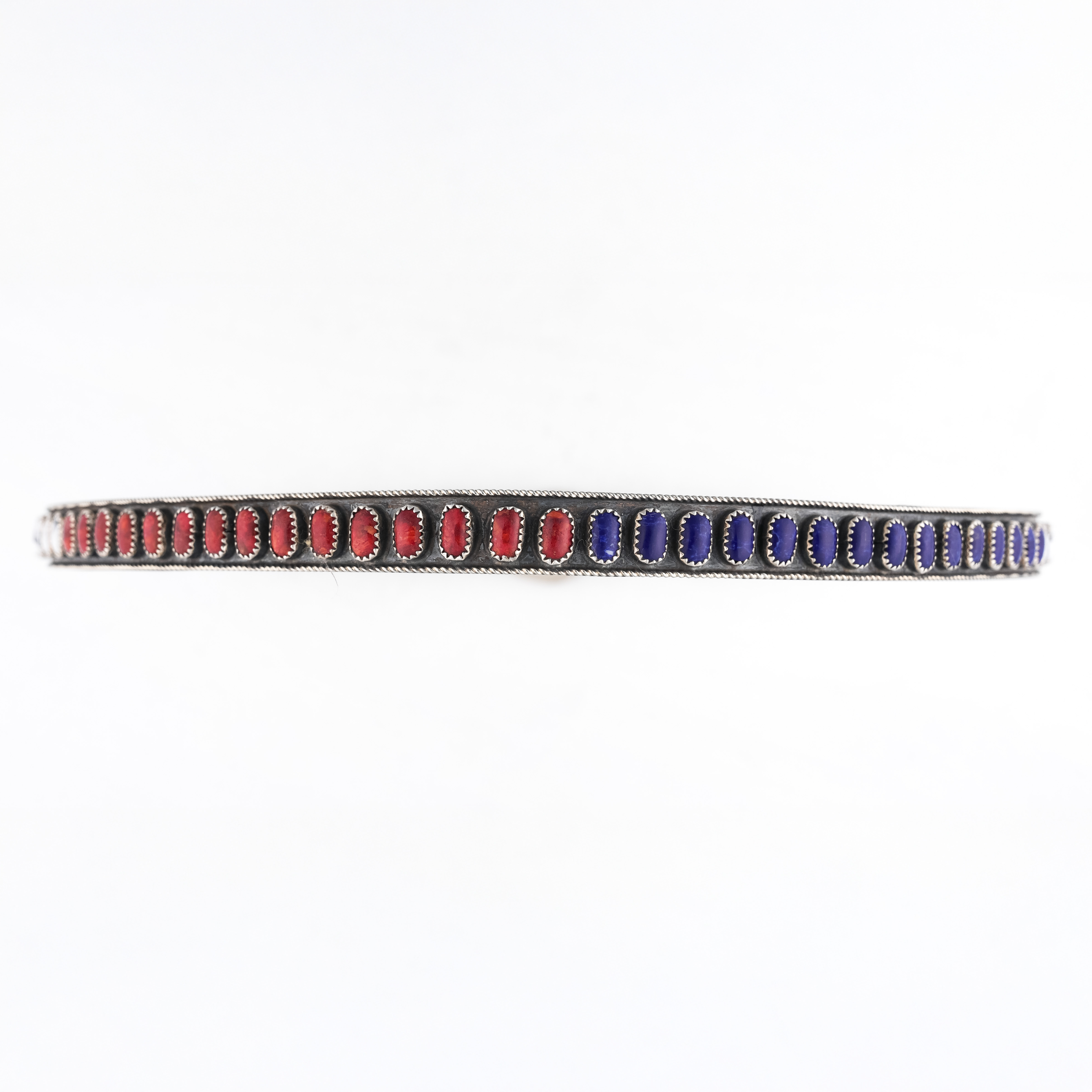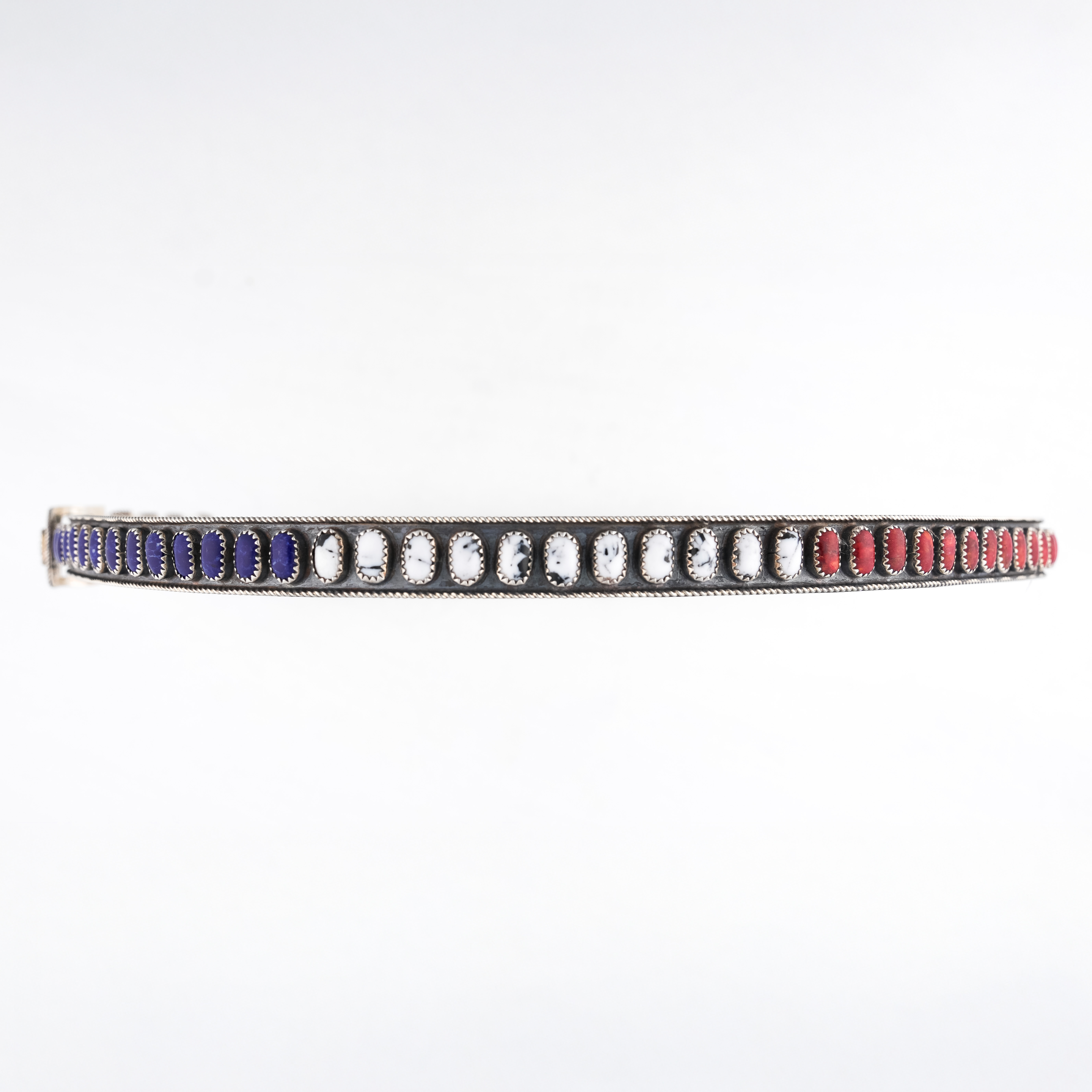 Polished White Buffalo Turquoise, deep blue lapis, and vibrant red coral fill this hat band with earth’s natural beauty. Handcrafted by T.J.F., twisted wire details lines the band’s edges and sawtooth bezels add flair to elevate the featured stones. This is an eye-catching piece perfect for any occasion.