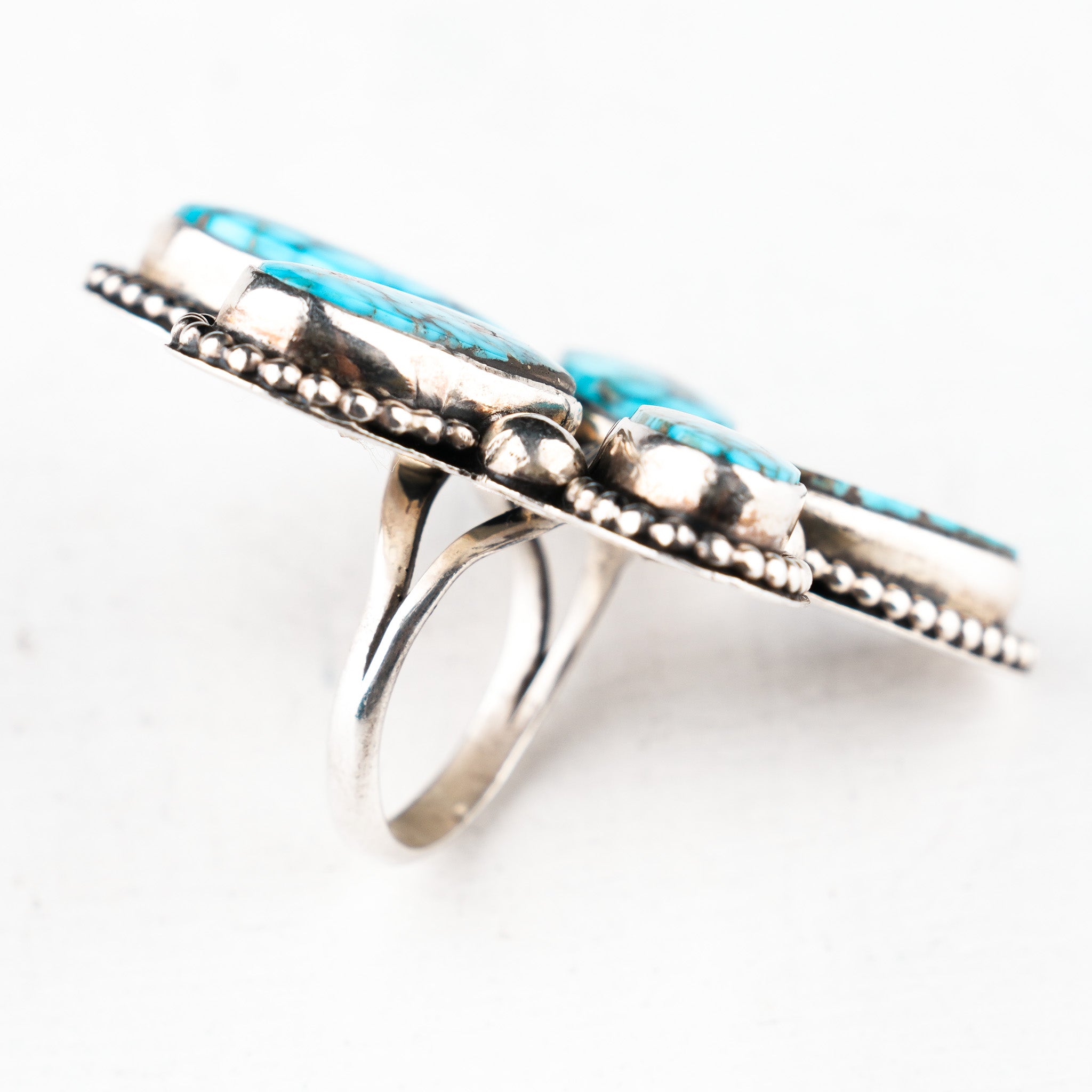 Five hand-cut Birdseye Kingman Turquoise stones take center-stage in this ring crafted by Mary Ellen. Arranged in a traditional star shape, each Birdseye Kingman Turquoise stone presents a unique blend of bright blue, vibrant green, and earthy matrix set in sterling silver embellished with hand-made silver drops. This is a truly unique ring!