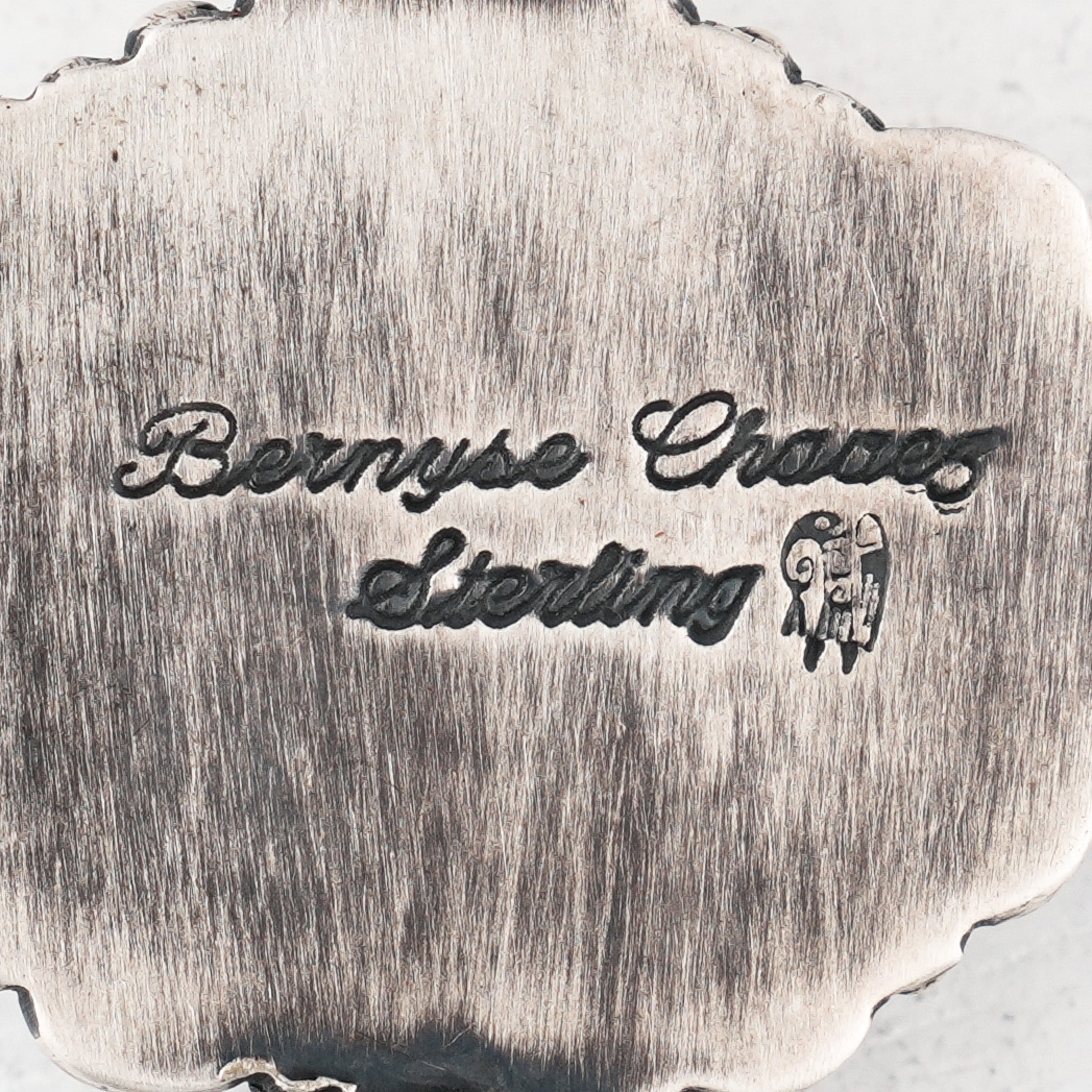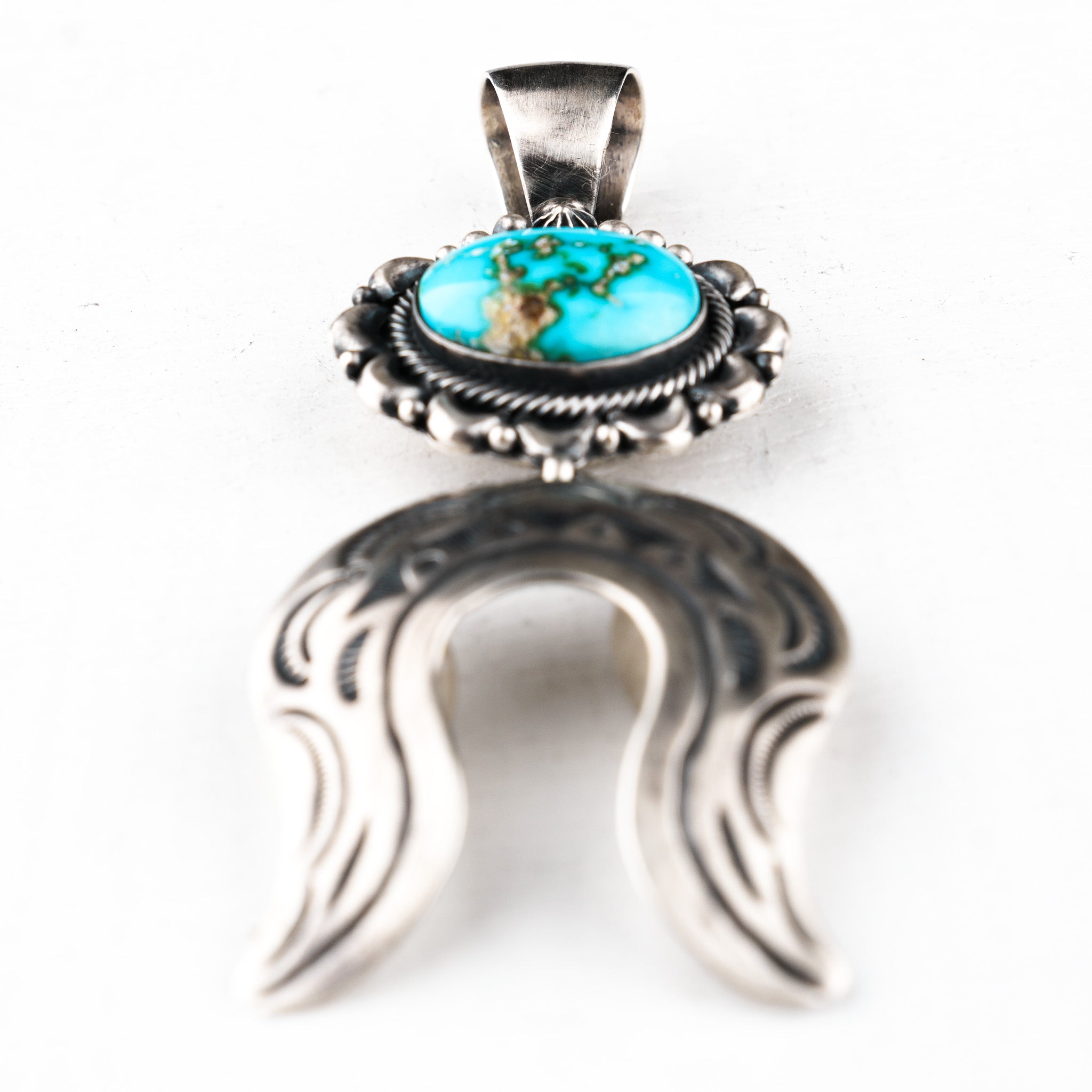 Crafted by acclaimed artisan Bernyse Chavez, this unique pendant presents stunning silver-work and a beautiful turquoise stone. A vibrant Sonoran Gold Turquoise stone sits below a polished bail, surrounded by applique-work. Below, a hand-cut and hand-stamped sterling silver naja moves with this piece’s wearer. This is a pendant that will be cherished for generations to come.