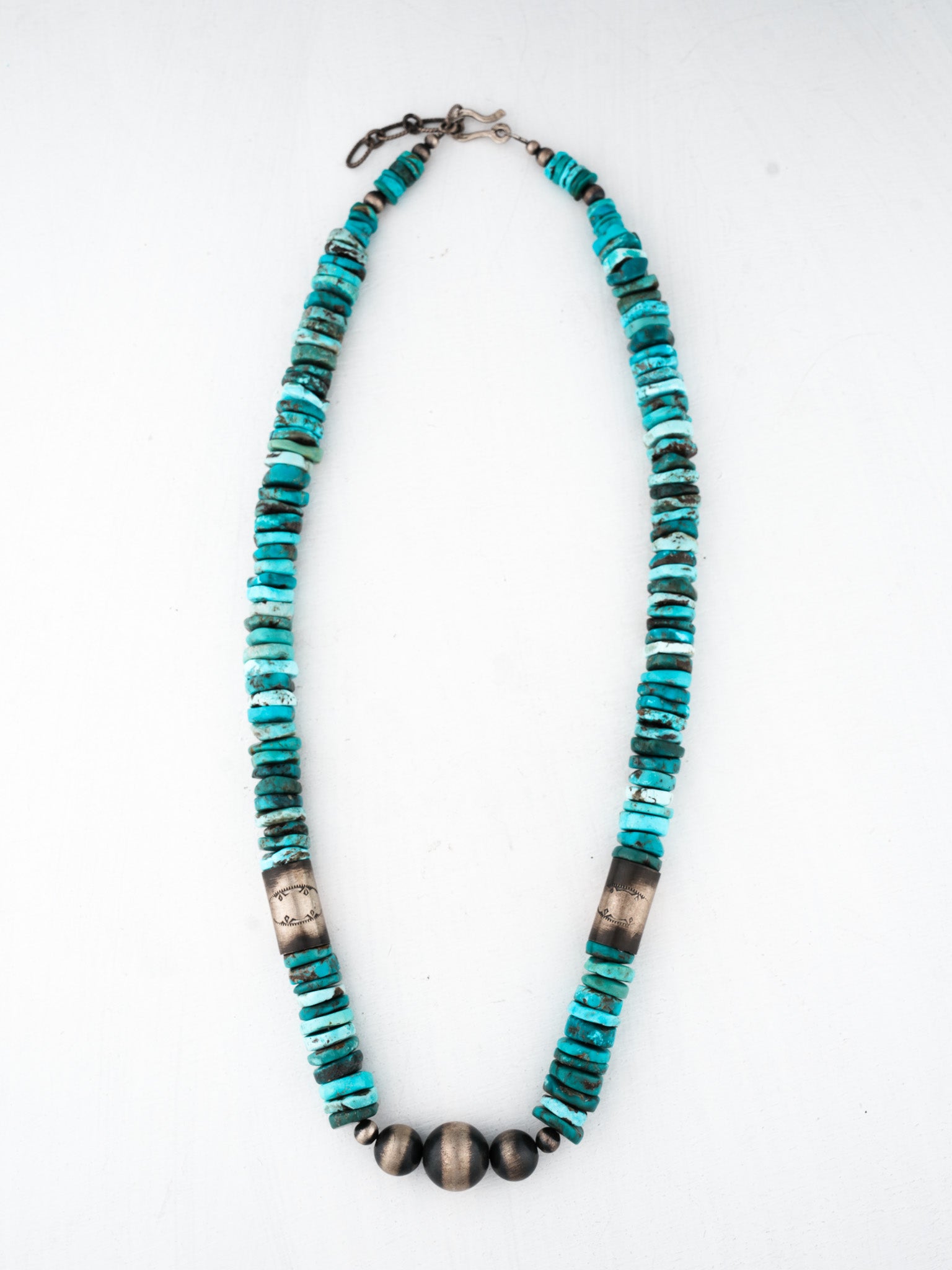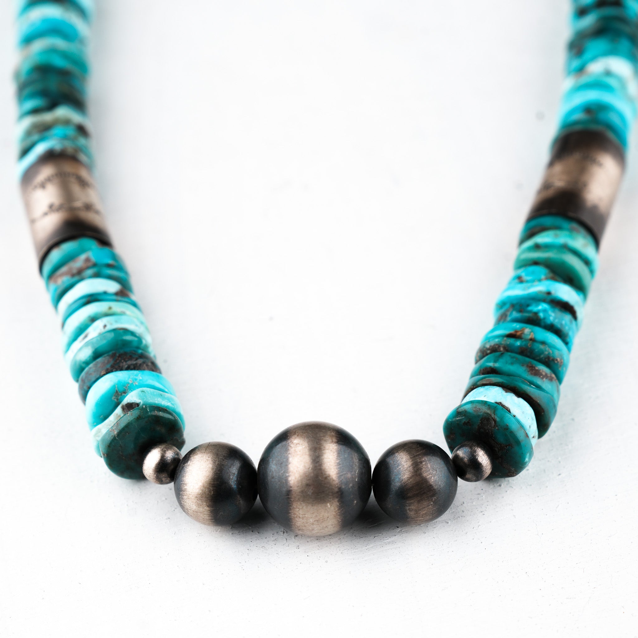 This bead necklace is a celebration of turquoise and tradition. Hand-cut and hand-strung natural, high-grade Kingman Turquoise beads show off beautiful blues, teals, and greens. Manufactured Navajo Pearls add a touch of sterling silver at the very bottom of this necklace, tied in by a custom stamped barrel bead on either side of the necklace. This is a piece you will find yourself reaching for any day of the week!