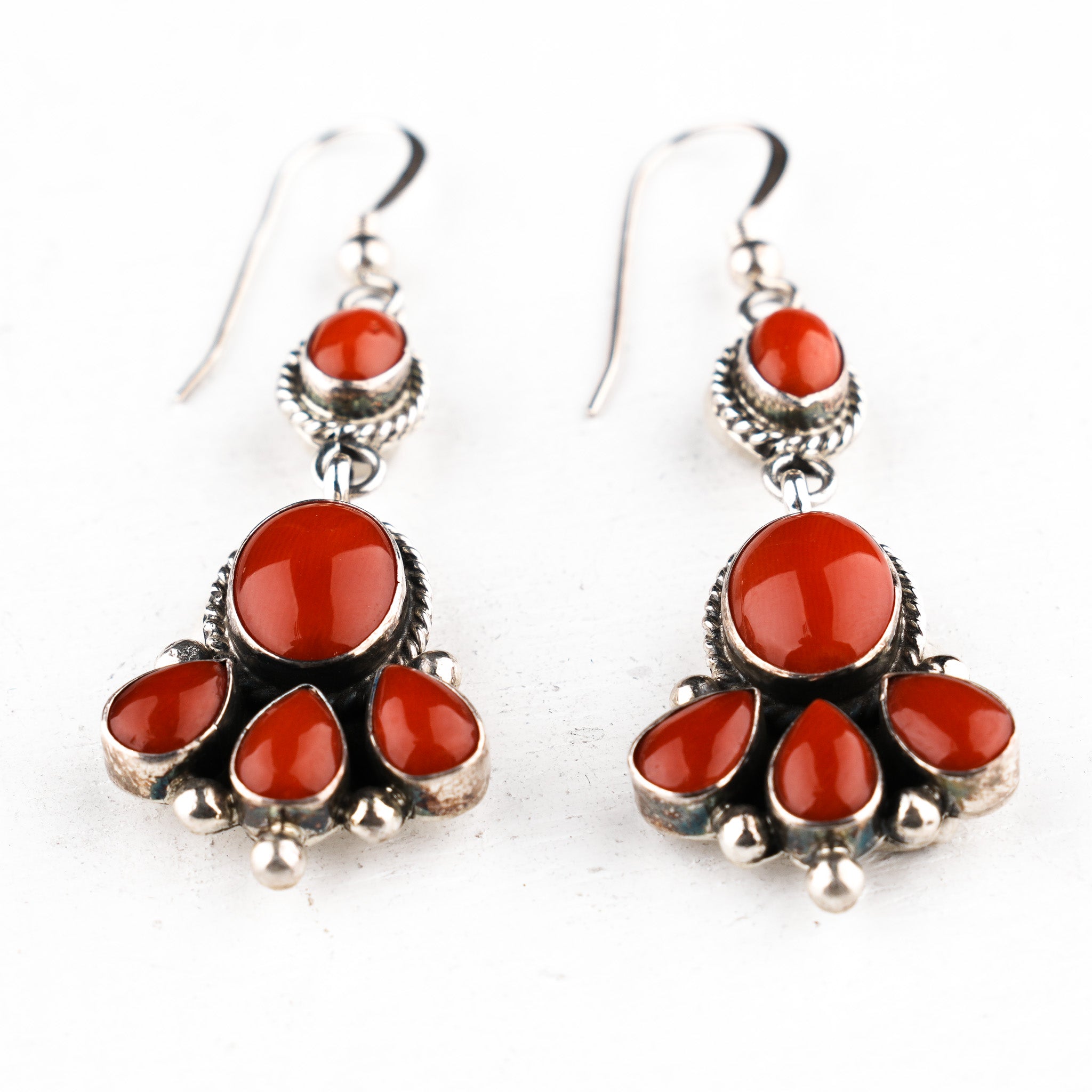 These vibrant dangle style earrings feature smooth red coral surrounded by bright sterling silver. Hand-crafted by C. Wylie, they are replete with elegant craftsmanship and detailed silver-work. Surrounded by twisted wire detailing and elevated by silver drops, the coral shines!