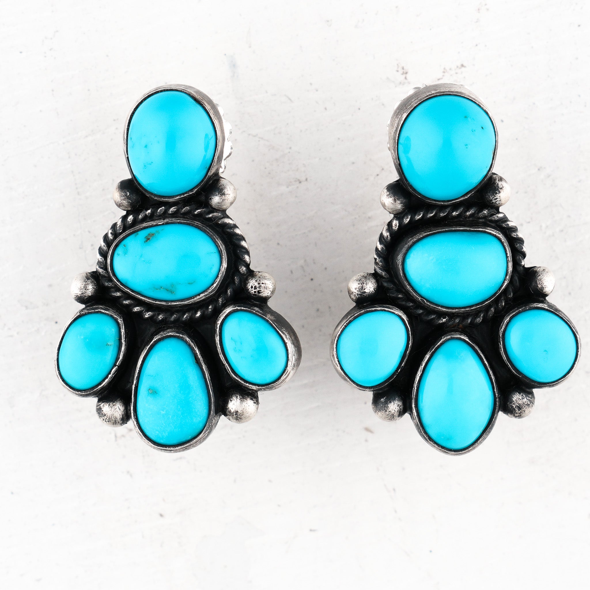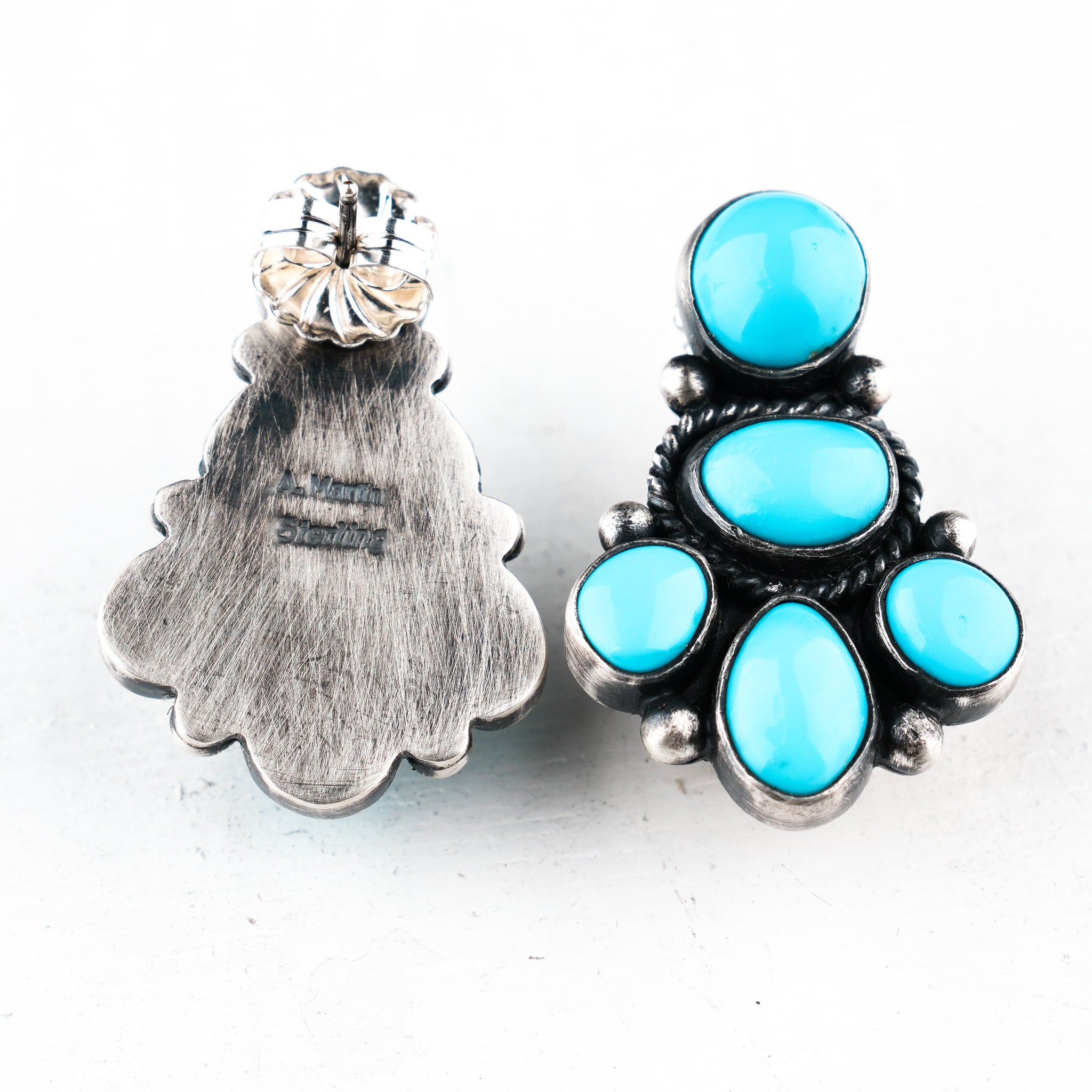 Hand-crafted by Angela Martin, these beautiful post earrings are full of bright blue Sleeping Beauty Turquoise. Each vibrant stone has been carefully cut to highlight its natural beauty before being secured with sterling silver. Twisted wire detailing wraps around the oval stone at the center of each earring, and silver drops add another touch of artistry between the stones above and below. This set brings the vibrancy of a bright summer sky into your wardrobe!