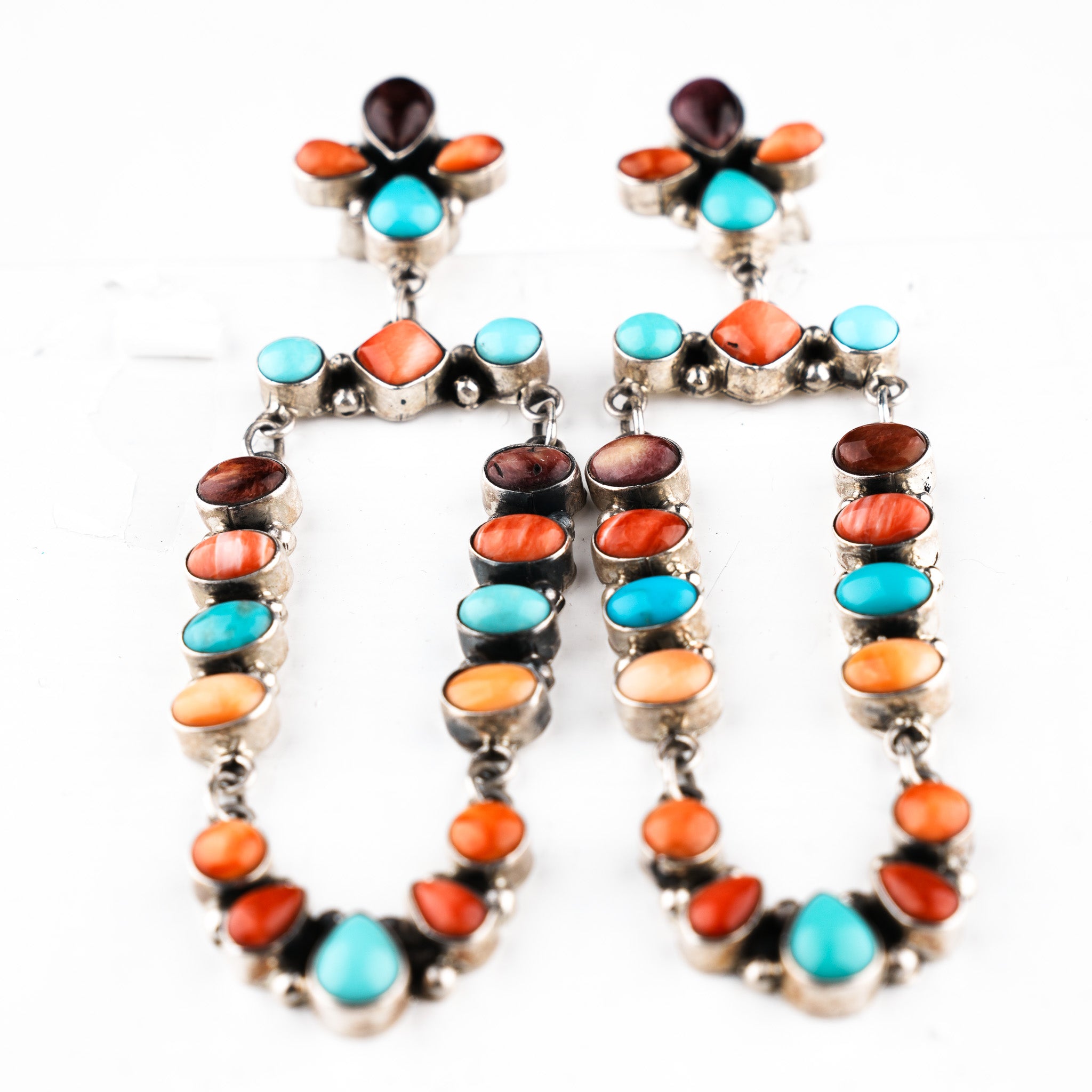 A celebration of earth’s multitudes, these beautiful earrings features Kingman Turquoise and orange, red, and yellow spiny oyster shell. At the top of earth earring, small clusters form a solid base as the rest of the earring dangles, effortlessly moving with you. Each rich Kingman Turquoise stone and vibrant spiny oyster shell has been carefully cut, polished, and set in sterling silver. These vibrant earrings are perfect for anyone who loves the colors of the seasons!