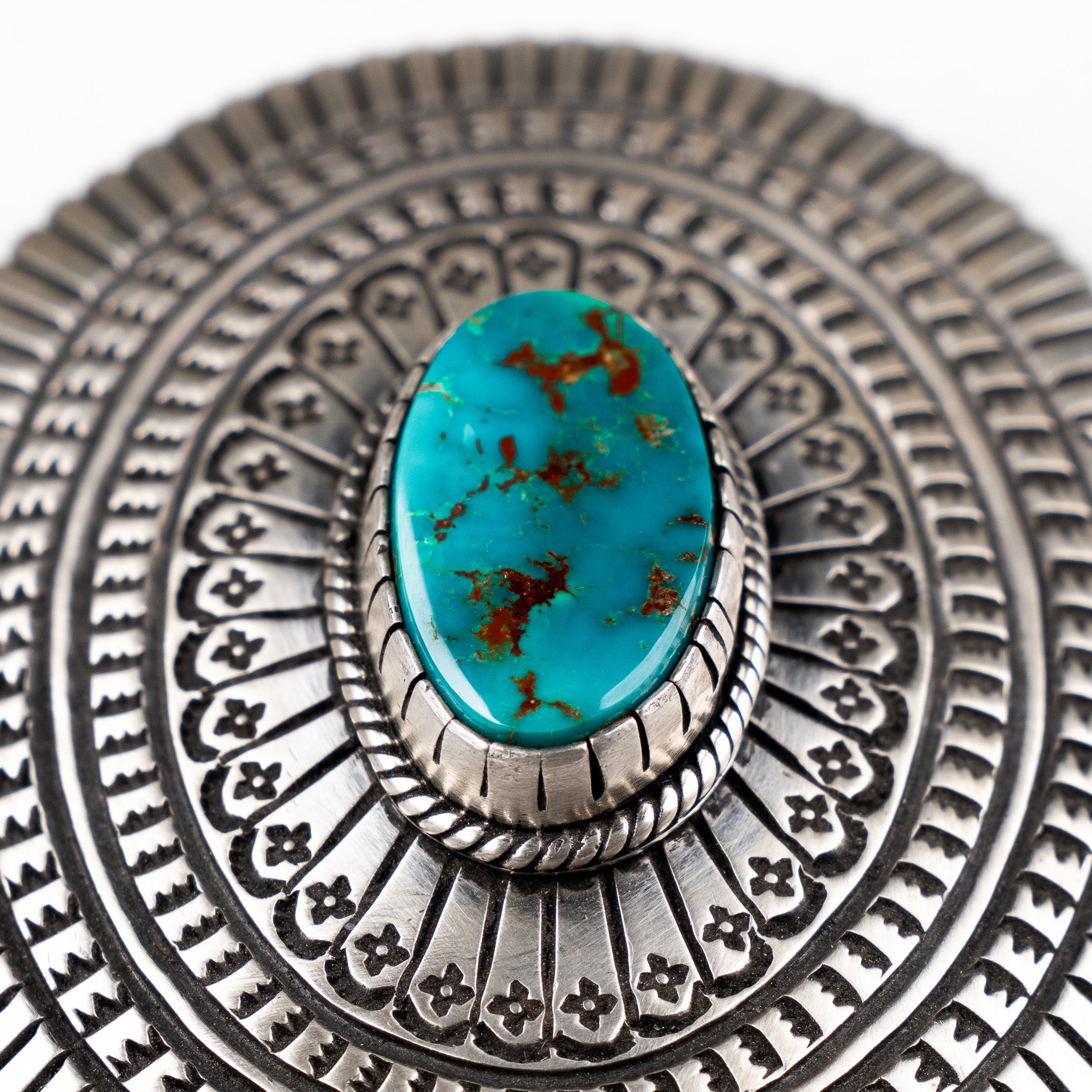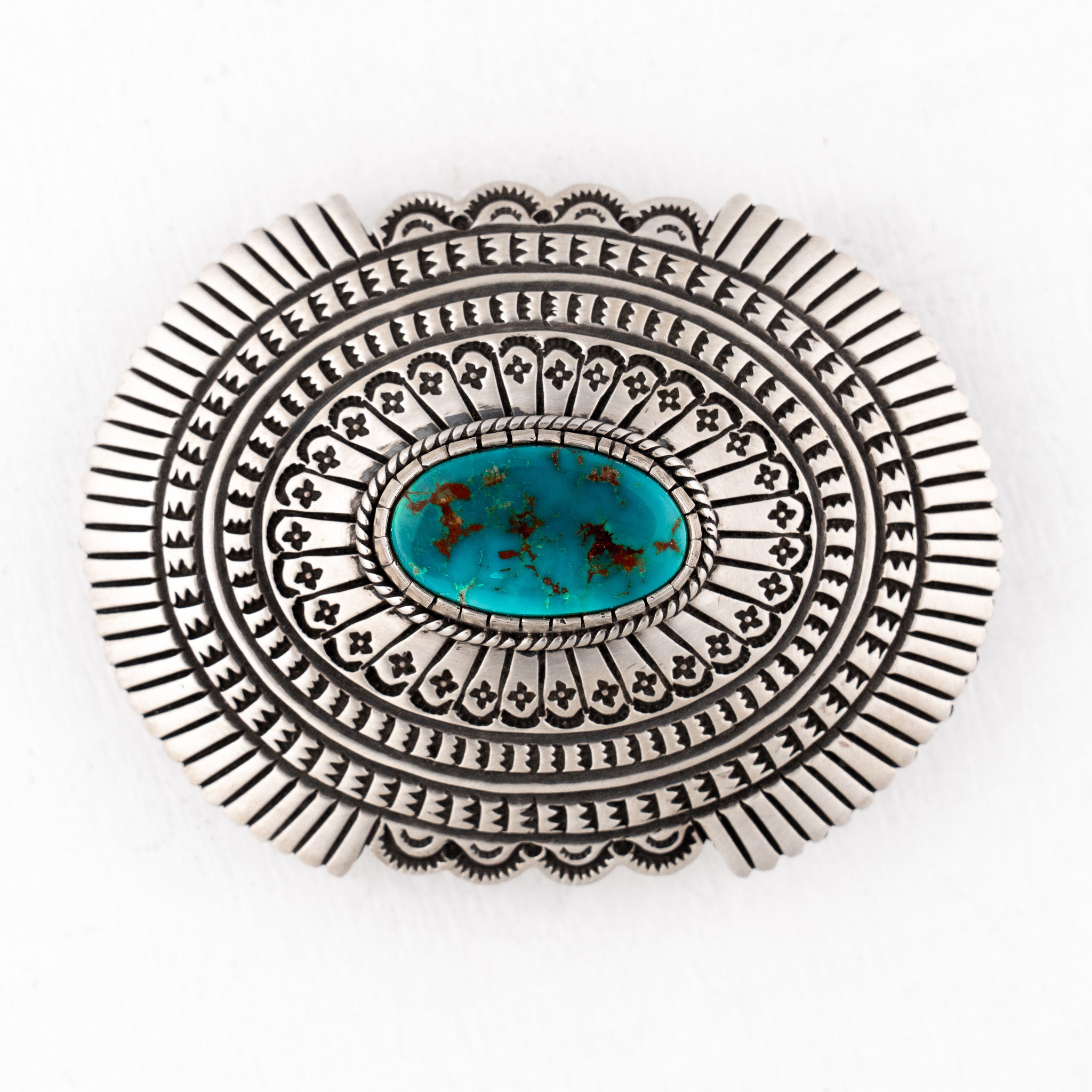 Blue Gem Turquoise and intricate silver-work take center stage in this beautiful belt buckle by Happy Piasso. Bold and bright piece, the Blue Gem Turquoise shows off vibrant sea greens and blues nestled in a backdrops of gleaming sterling silver. With a hand-cut bezel and silver-work that shows off Piasso’s eye for detail, this is an eye-catching addition to any collection.