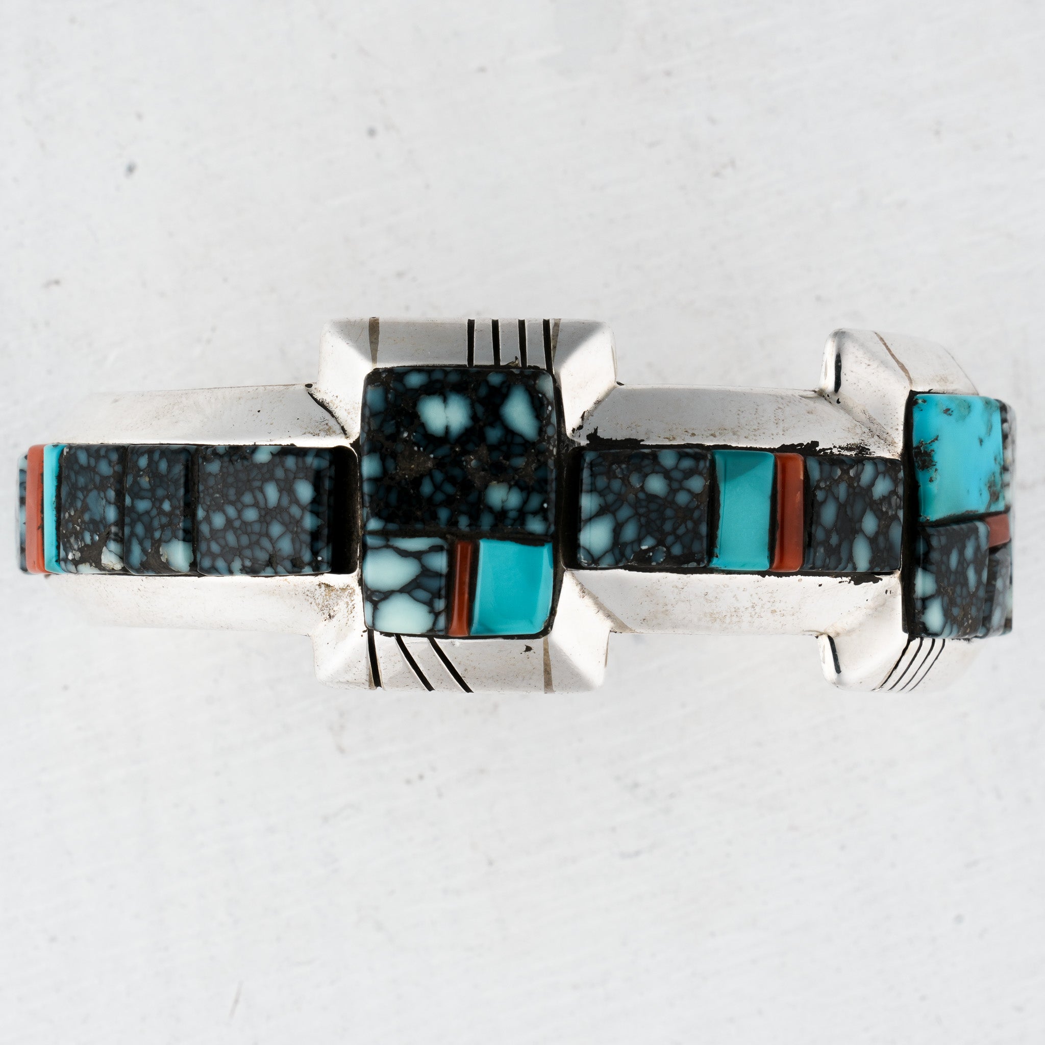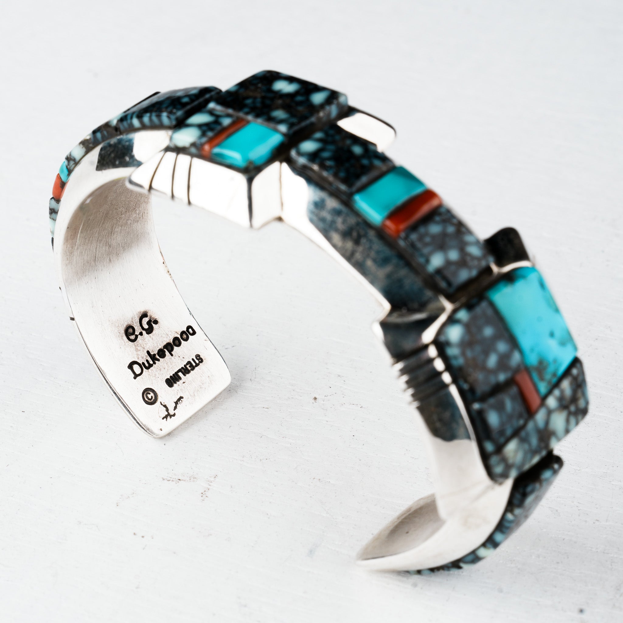 New Lander Turquoise, Kingman Turquoise, and coral are held by bright sterling silver in this unique cuff crafted by Causandra Dukepoo. Each carefully cut and fitted turquoise stone and coral is secured using inlay techniques. A one-of-a-kind cuff with a contemporary edge, this piece celebrates timeless techniques with a contemporary edge.