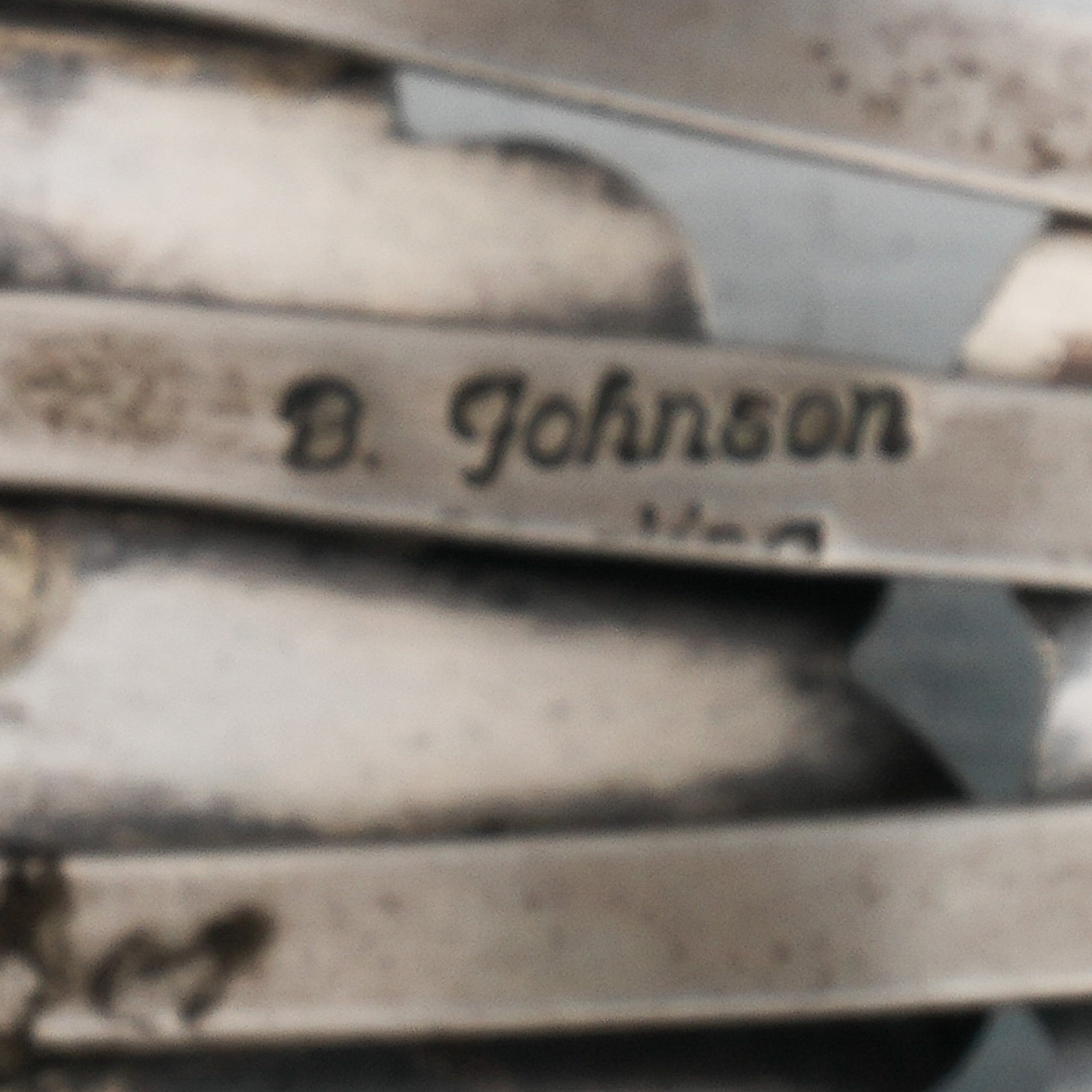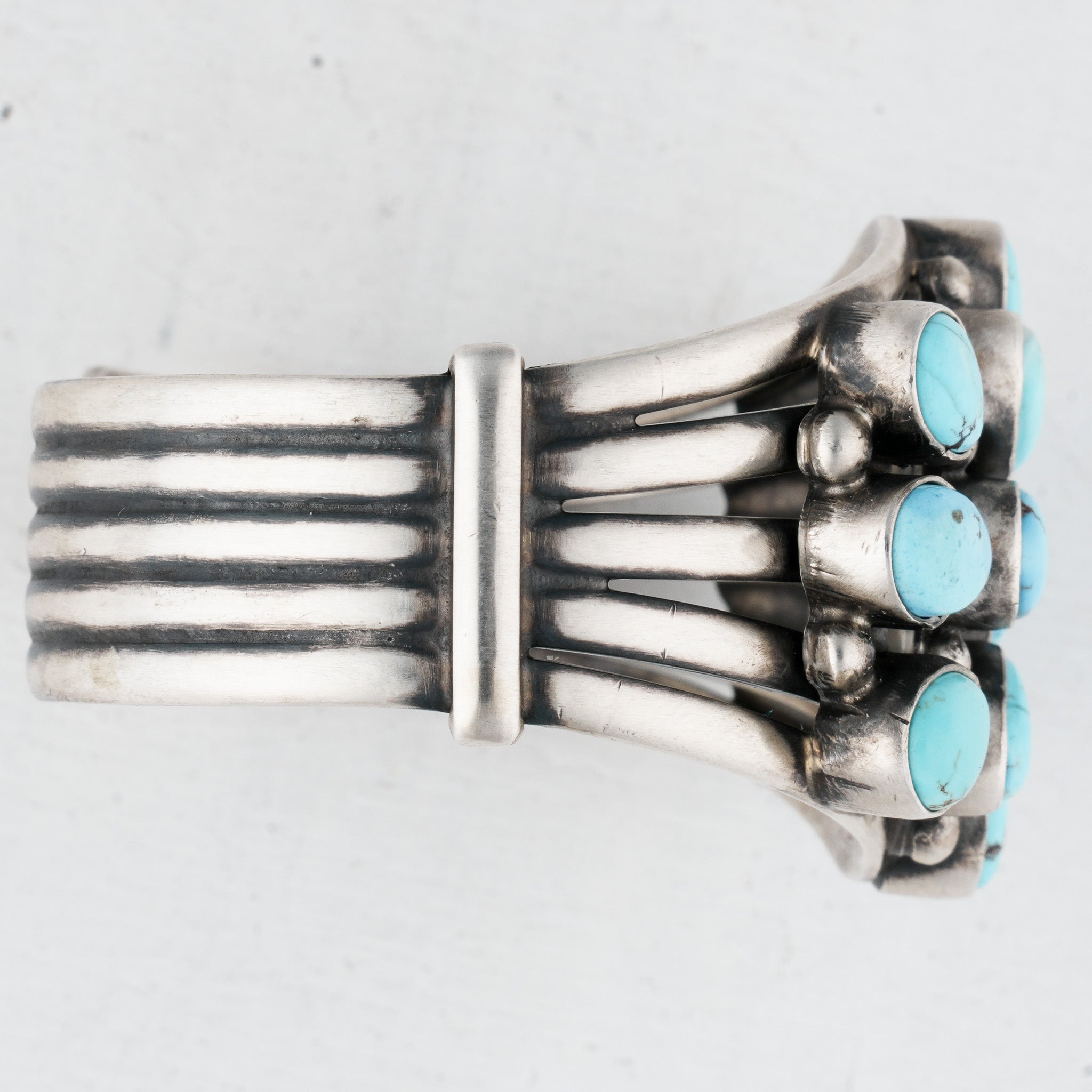Hand-crafted by Navajo artisan Bobby Johnson, this cuff presents a stunning arrangement of Golden Hills Turquoise. Each robin’s egg blue stone threaded with a delicate, earthy matrix has been carefully cut and polished to let the stone’s natural beauty gleam. Arranged in a cluster design, the stones are wrapped in sterling silver. Silver drops and a silver bar on each side of the cuff add textural embellishments.