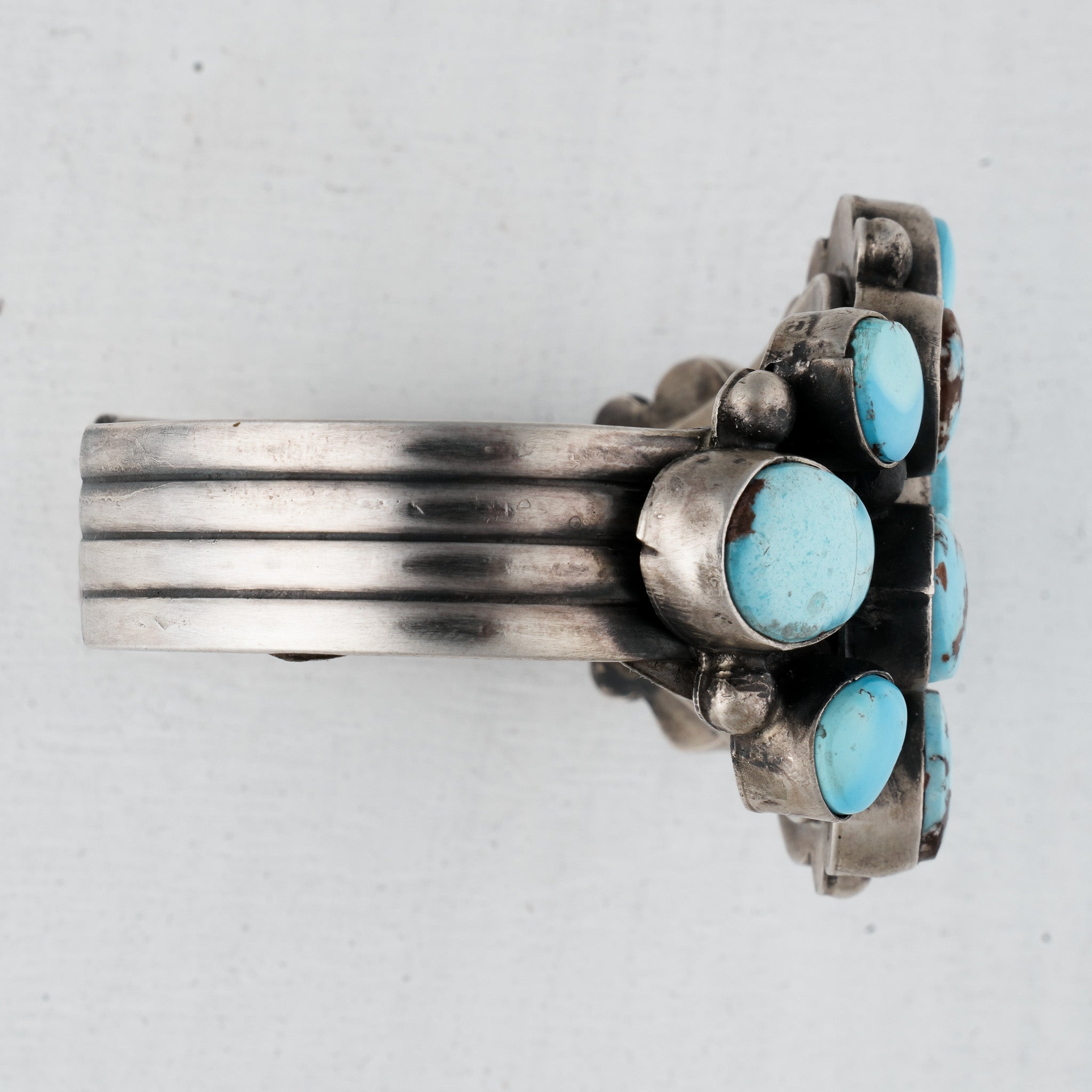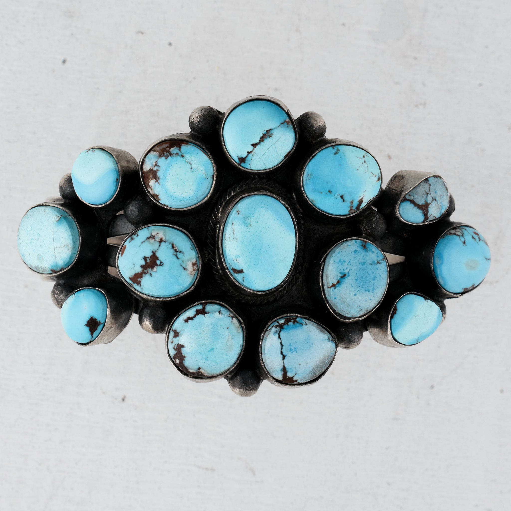 Expertly cut and polished Golden Hills Turquoise stones are the center of this turquoise-filled cuff hand-crafted by Bobby Johnson. A sterling silver base accentuated by silver drops elevates the turquoise’s natural beauty, highlighting the stone’s light blue hues and delicate matrix. With its organic lines and skillful craftsmanship, this beautiful cuff is sure to become a favorite.