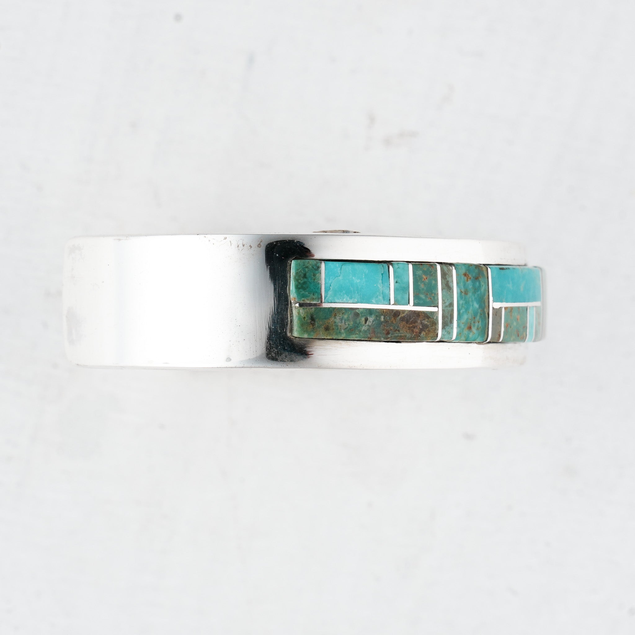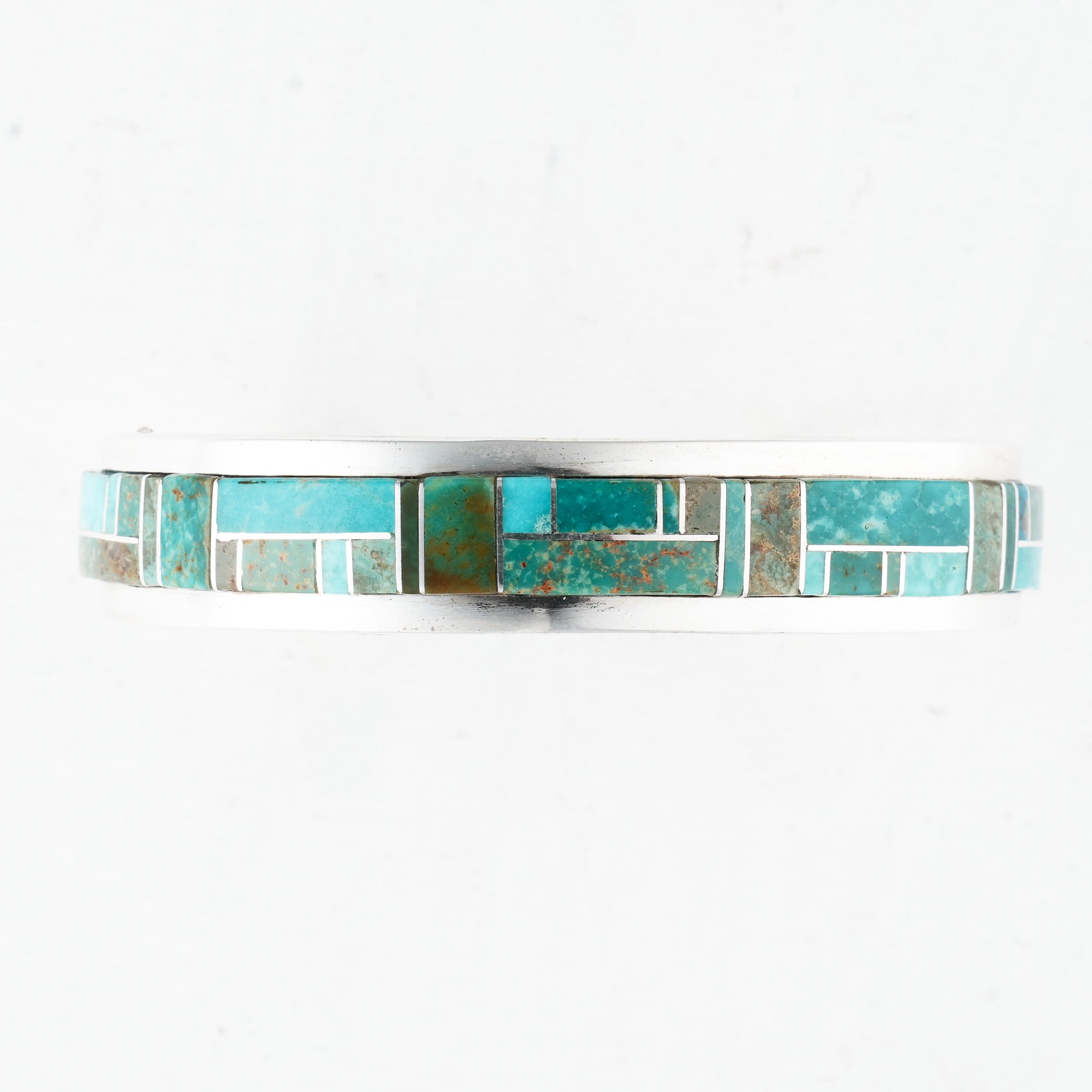 This cuff is a celebration of turquoise! Marie Jackson brings Seafoam Kingman Turquoise and Green Kingman Turquoise together in this unique work of art. Each turquoise stone has been carefully cut to set in a channel inlay to create a colorful mosaic wrappedin sterling silver. With its depth of texture and contemporary flair, this is an unforgettable piece.