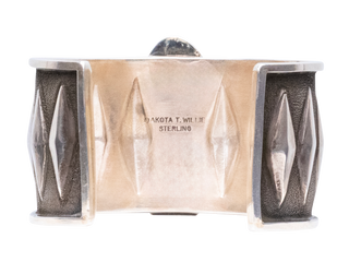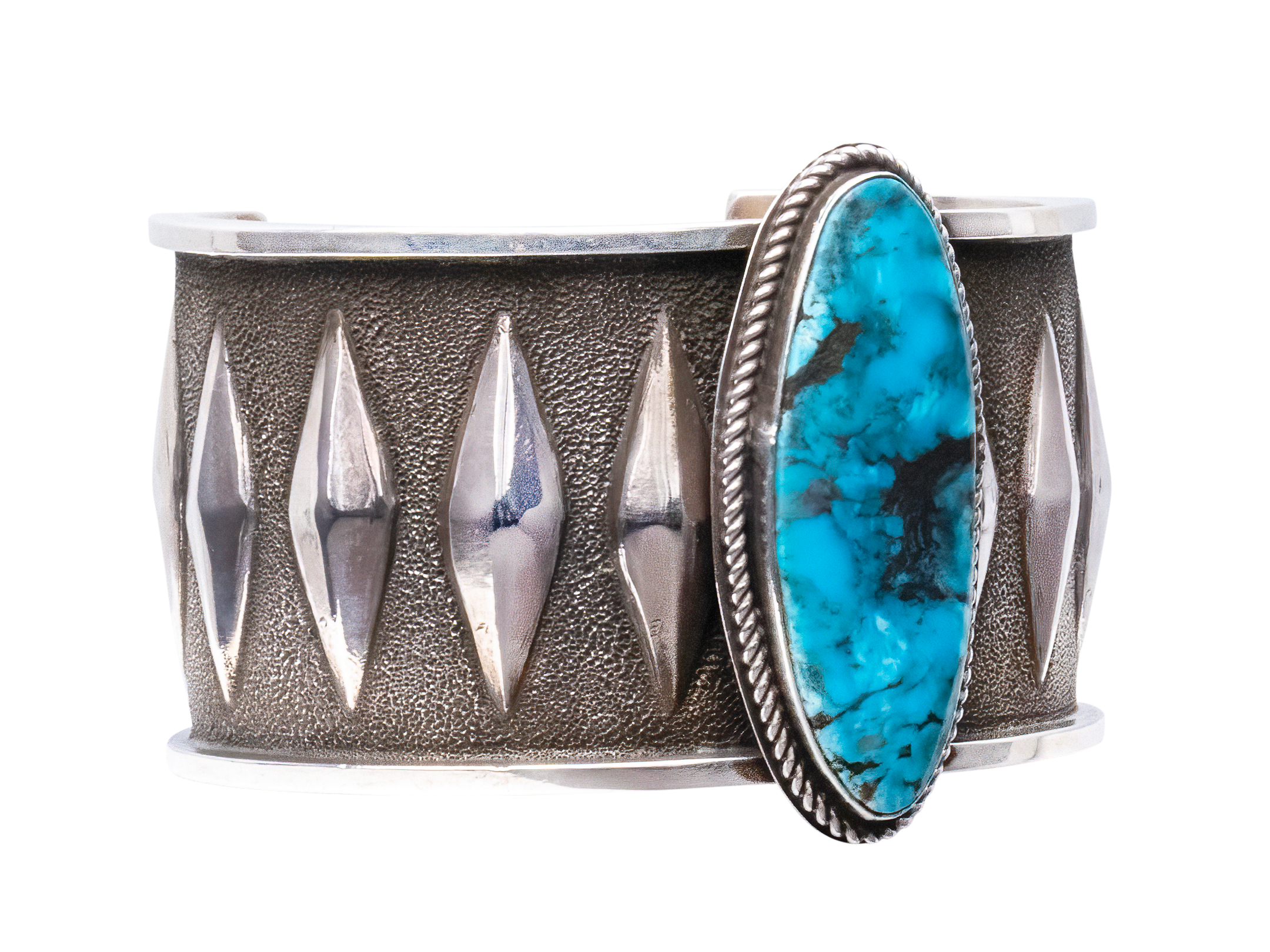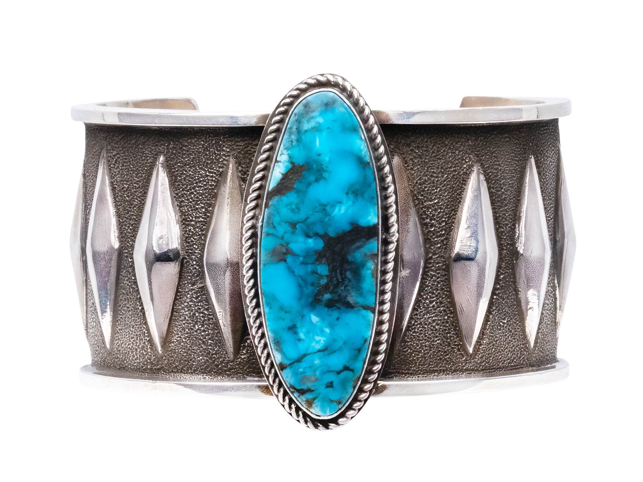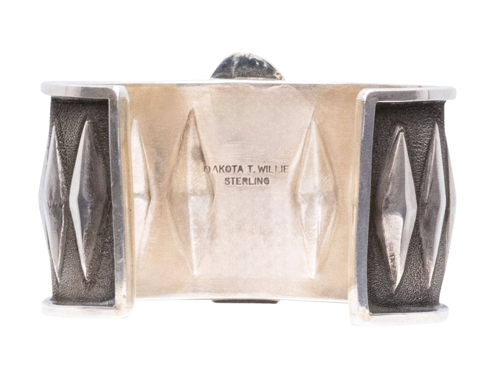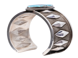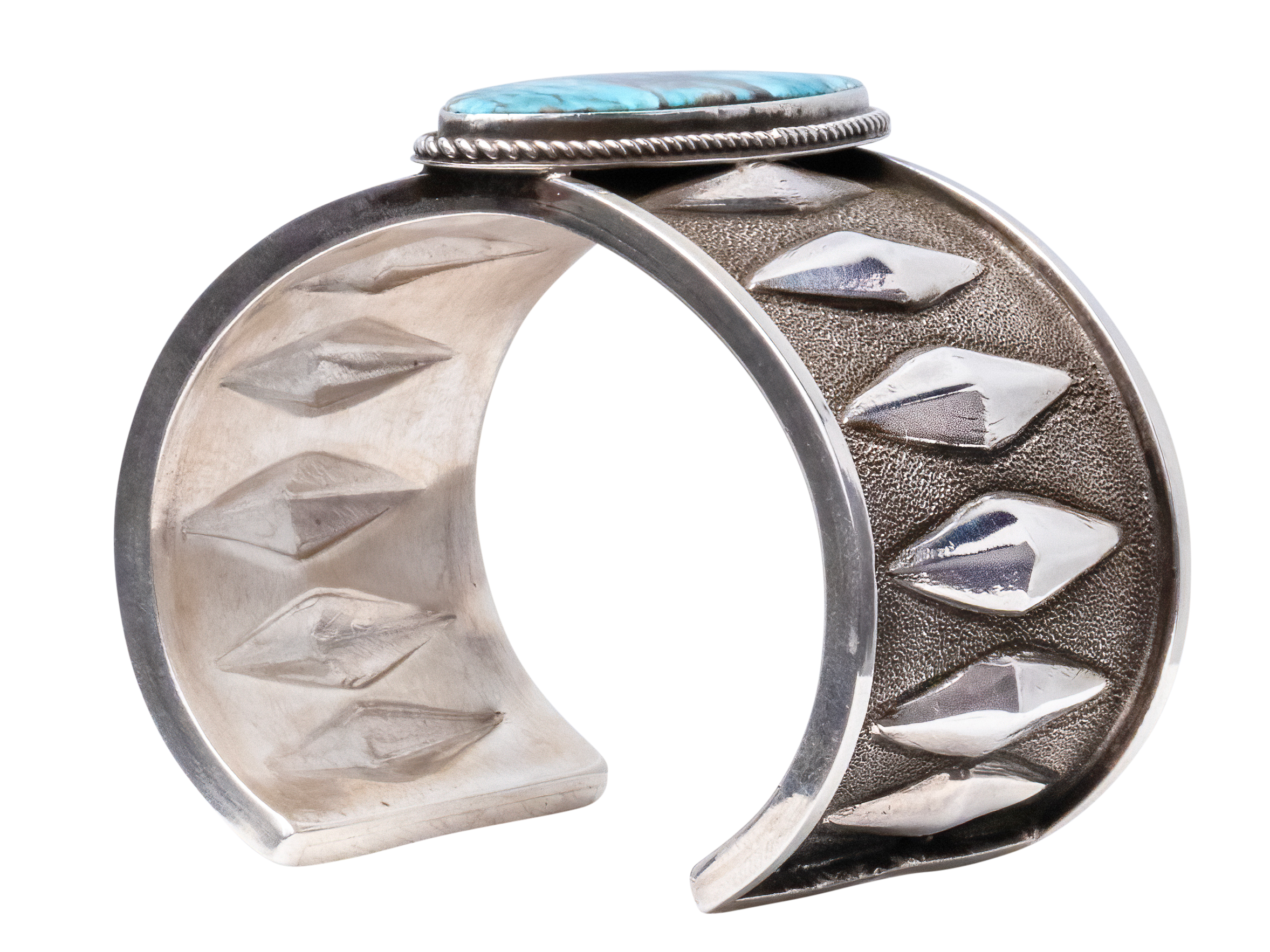 This piece was carefully crafted by the talented Navajo artist Dakota Willie. Featuring a single, Kingman Turquoise center stone framed by repoussé style diamonds and a textured setting--all crafted from sterling silver, this is a unique piece with a contemporary flair. The silver diamonds that flank either side of the Kingman Turquoise stone draw the eye inwards, towards the twisted wire that wraps around the center stone and the stone itself. With its simple, yet alluring, geometric patterns and the deep hues of the Kingman Turquoise, this cuff is a stunning piece of jewelry.