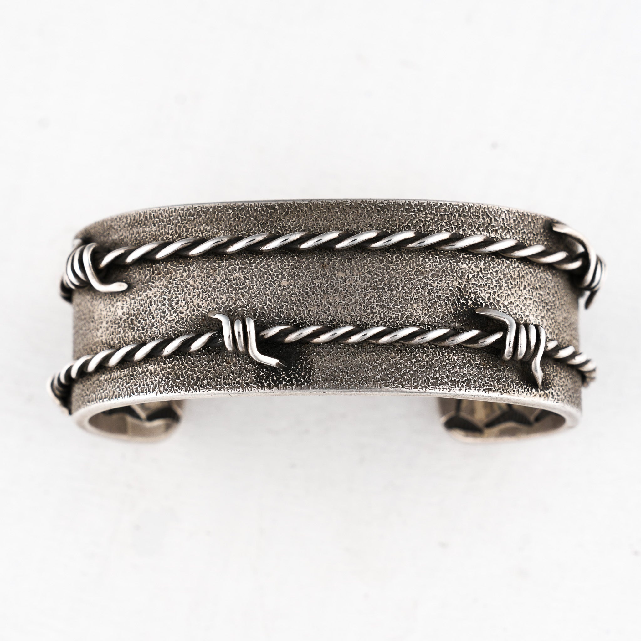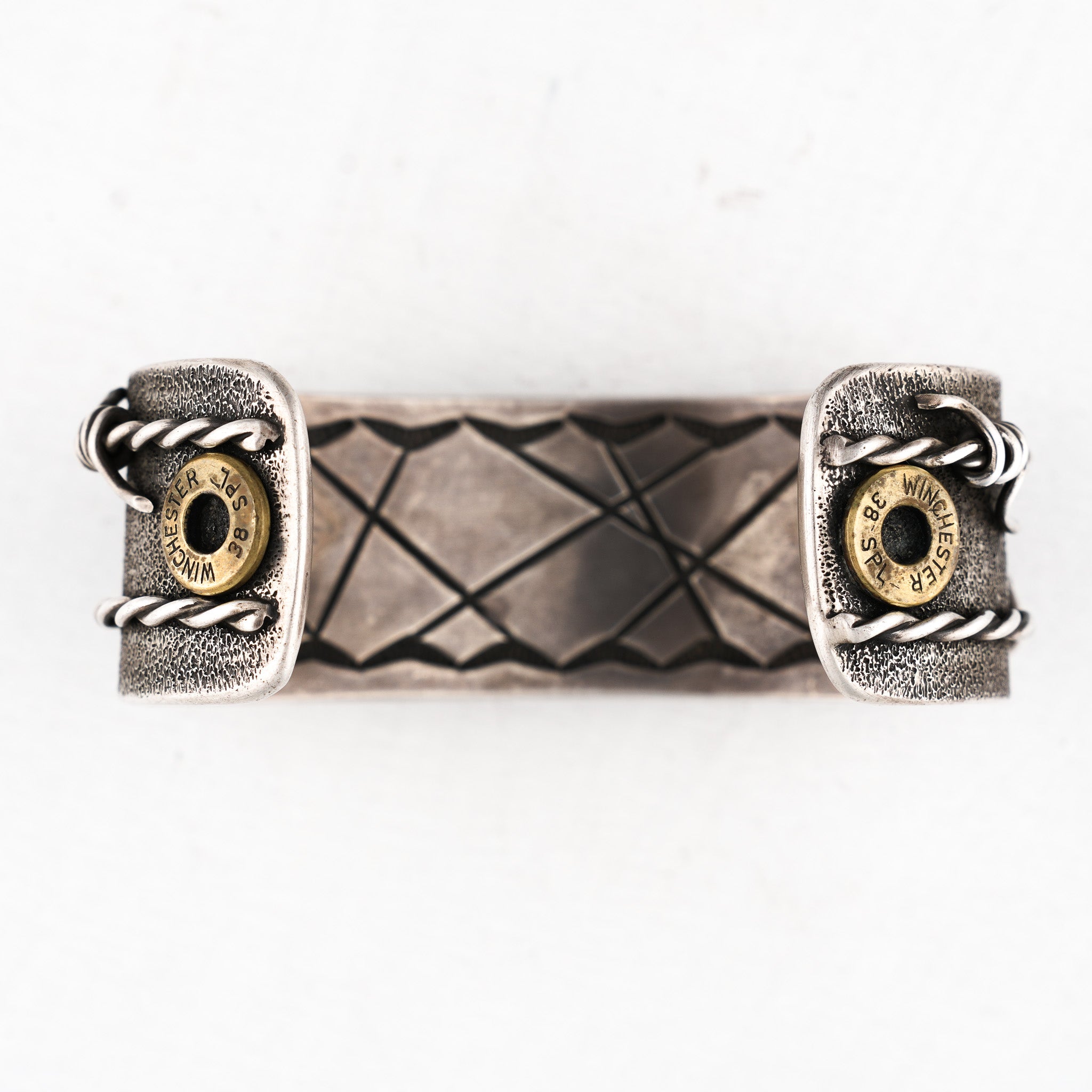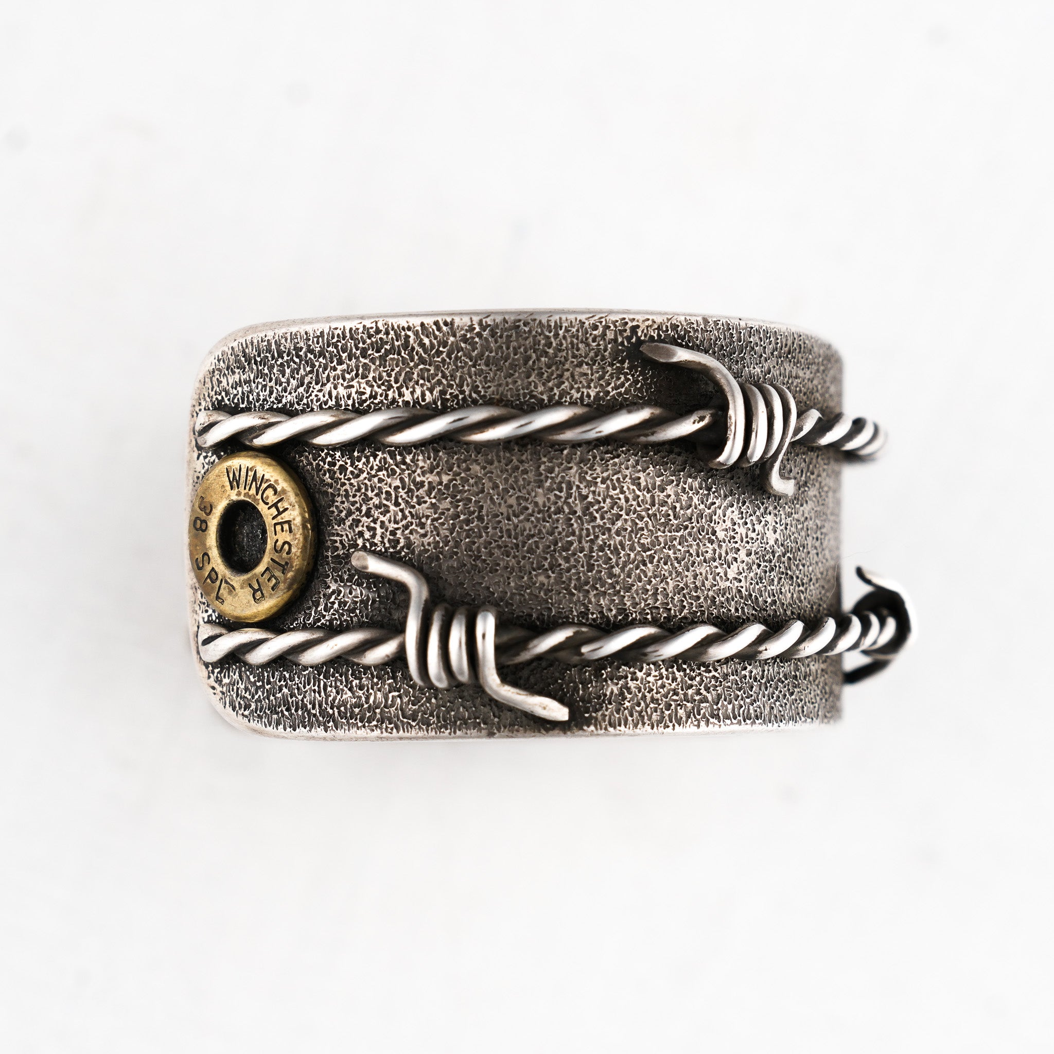 Hand-crafted by Joshua Bingman, this cuff is a beautiful work of sterling silver made. Two strands of hand-twisted and crafted barbed wire stretch around the middle of the cuff, atop by a traditional, tufa cast base. Winchester accents finish off each end of the cuff. Hand-stamped designs on the interior of this cuff add additional detail.