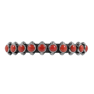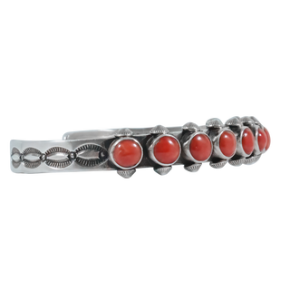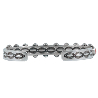 Embrace the timeless allure of southwestern jewelry with this elegant coral and sterling silver bracelet, by Navajo jeweler Herman Smith. This exquisite piece features a hand stamped sterling silver band studded with ten round coral stones and symmetrical silver buttons. Dress up your next outfit with this sophisticated yet down to earth bracelet.