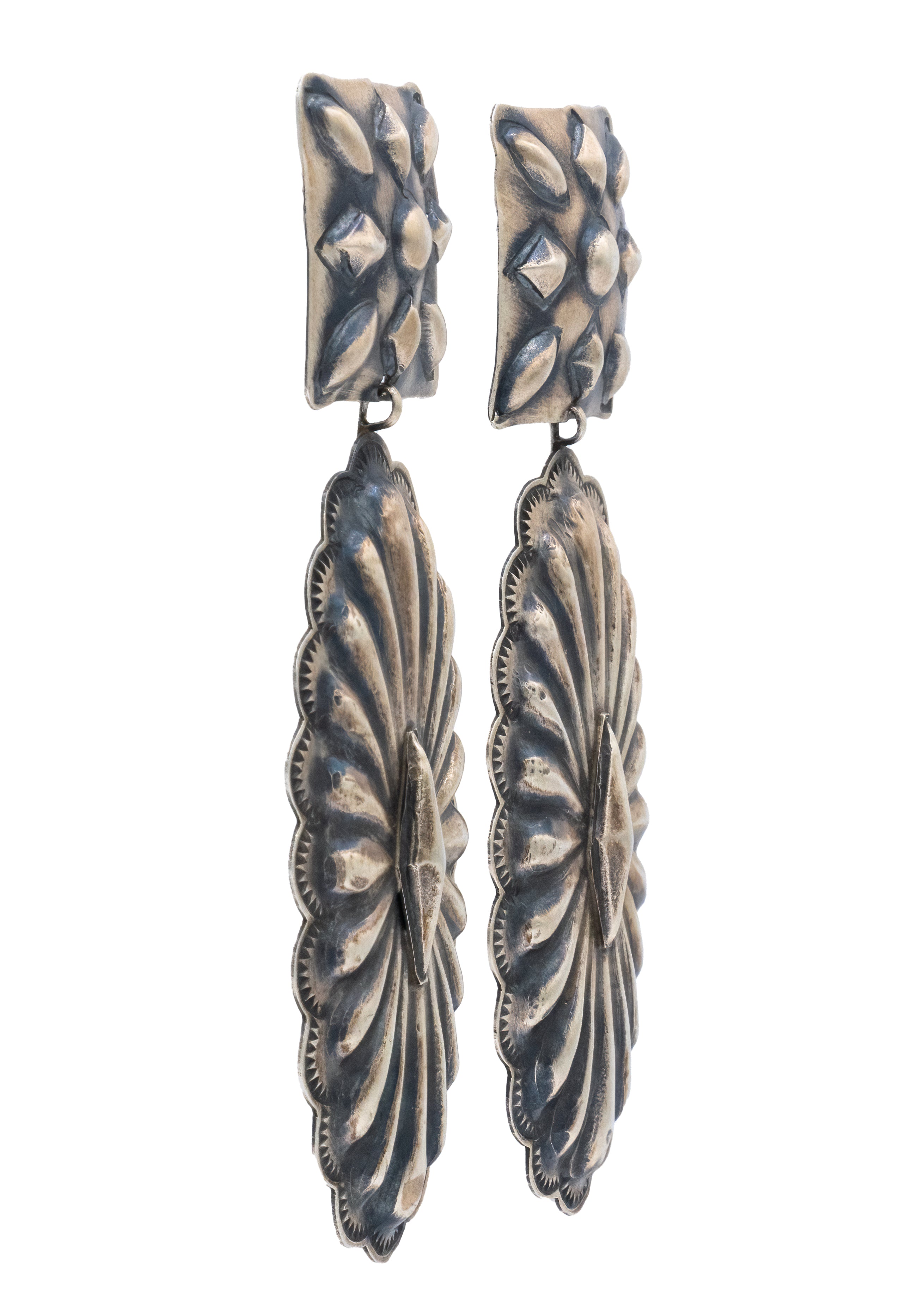 This set of concho earrings were made by the talented Navajo artist, Rita Lee. Completely constructed out of sterling silver, they feature hand-stamped, repoussé designs and post-backs. The square tops of these earrings add a touch of conteporary flair, while the traditional oblong conchos that elegantly dangle from the posts evoke centuries of jewelry making. These earrings are a true piece of Native artistry.