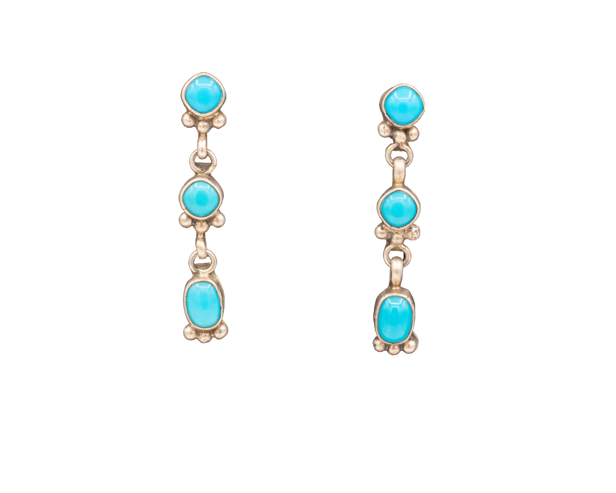 This set of gorgeous, dangling earrings were handcrafted with an eye for elegant balance. Three Sonoran Turquoise stones sit inside a sterling silver setting to compose each earring, separated by trios of silver drop accents that attach to the bottom of each stone's bezel. Crafted from simple, yet beautiful, materials, this set of earrings is a wonderfully elegant addition to any outfit.