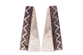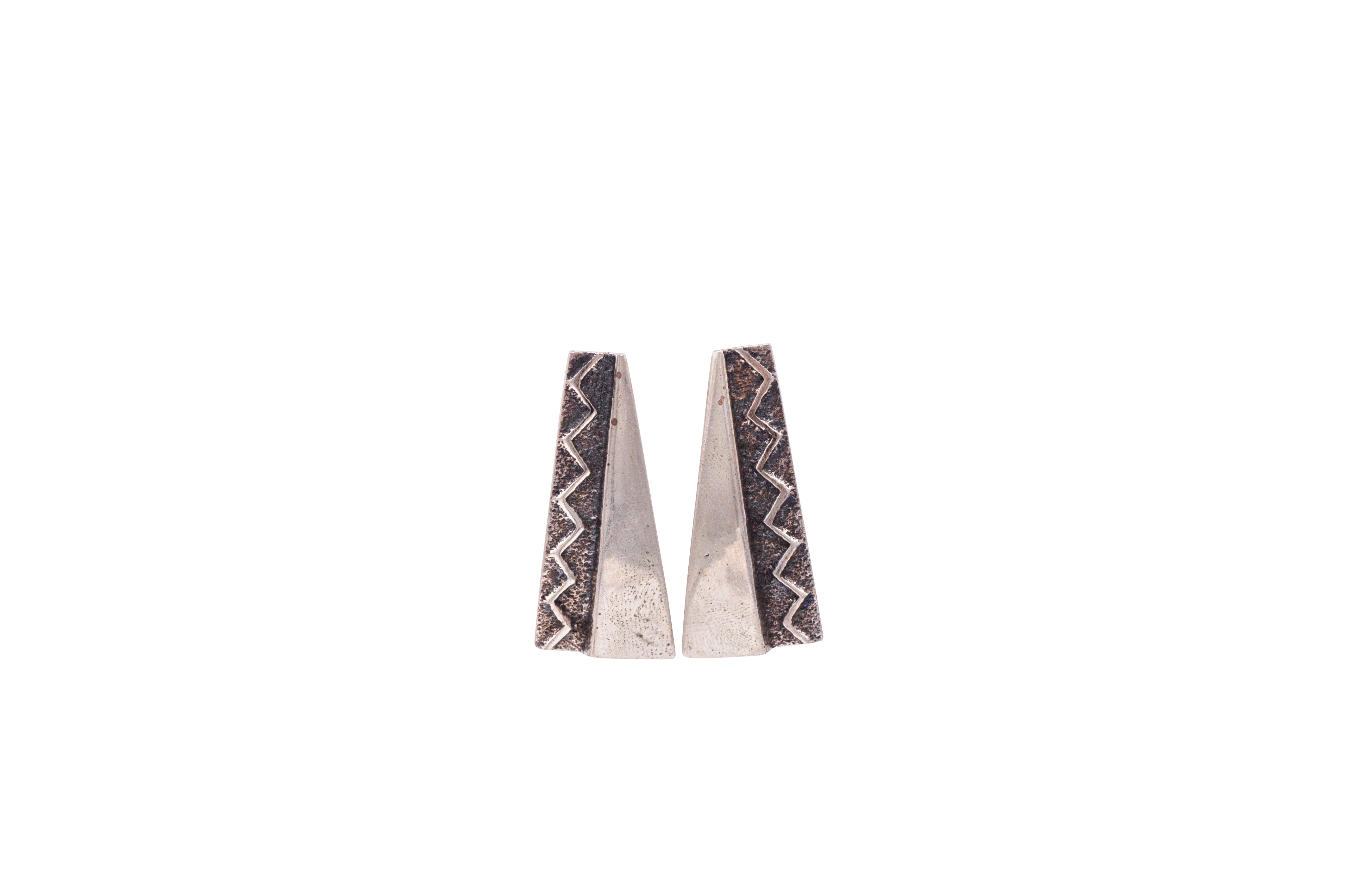 Full of bold one-of-a-kind detail, this sest of sterling silver earrings are a stunning addition to any collection. Aaron Anderson's craftsmanship shines through in these earrings' angled design and conbination of polished sterling silver and tufa casting techniques.
