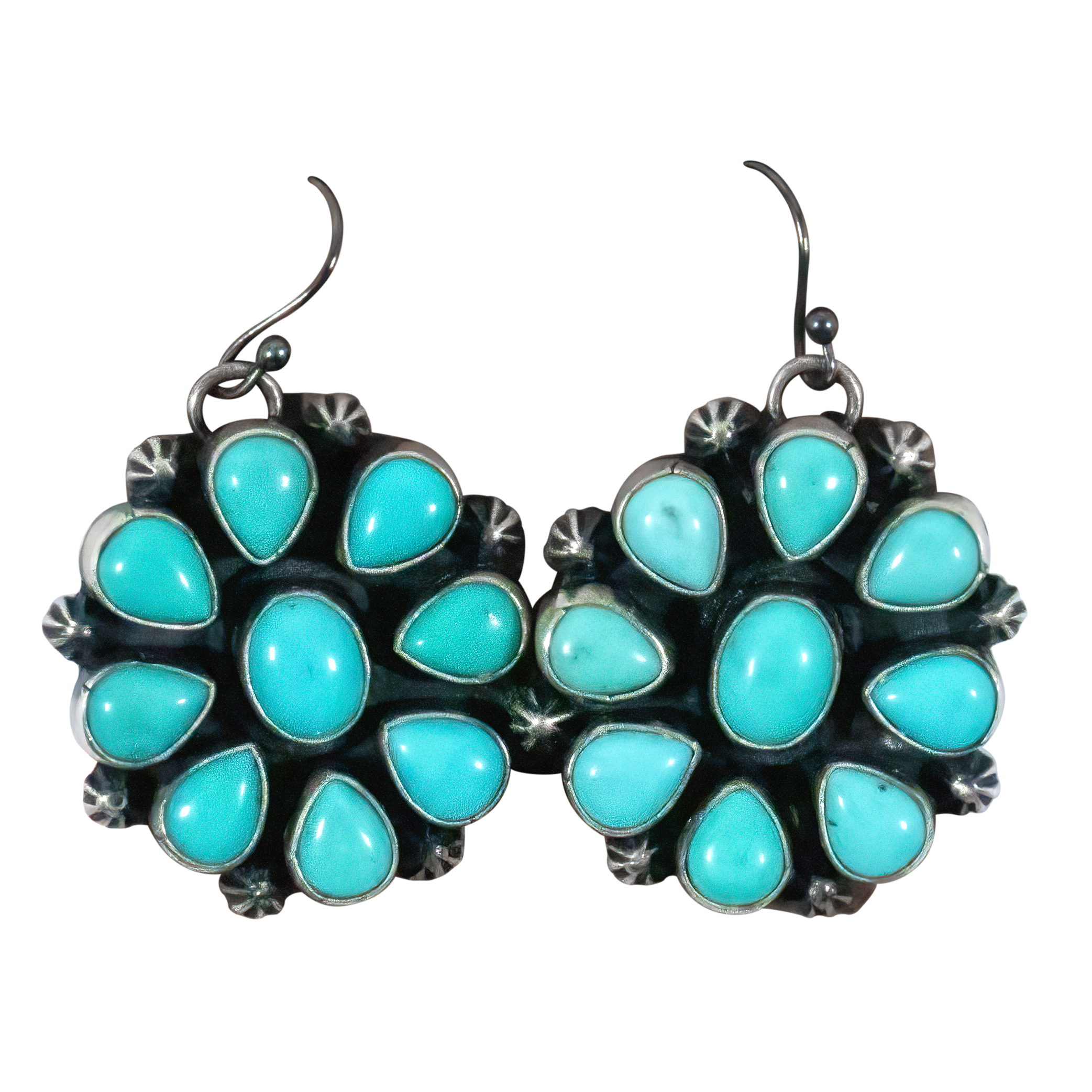 Elevate your style with these stunning turquoise cluster earrings, meticulously handcrafted to showcase the natural beauty of Campitos Turquoise, renowned for its serene blue hues and unique matrix patterns. Mined in Sonora, Mexico, Campitos Turquoise is unique in both its clarity and vibrancy.