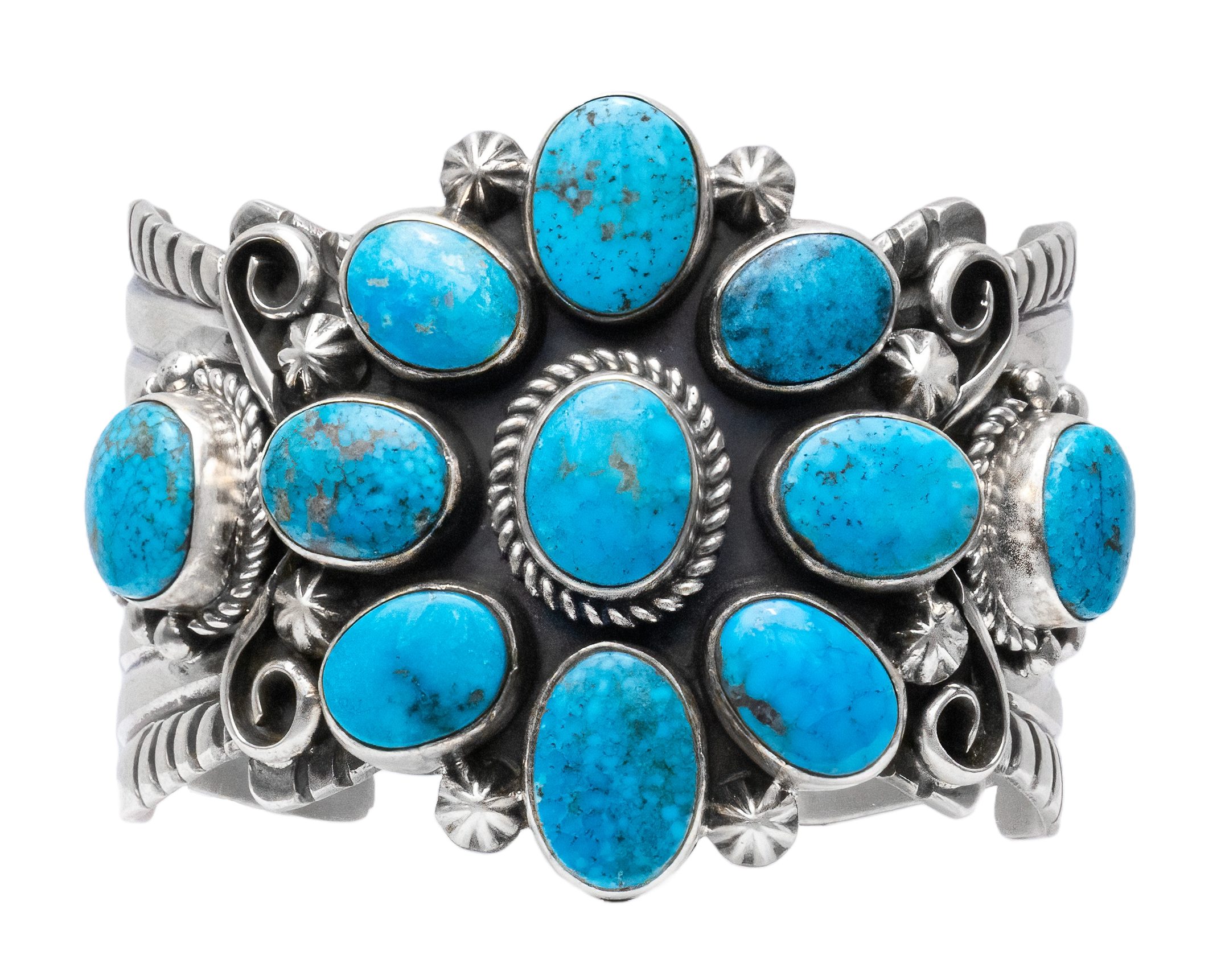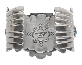 This stunning cuff was crafted by acclaimed Kewa and Pueblo artist Maynard Garcia. It features a centerpiece cluster of Birdseye Kingman Turquoise stones. The center stone is elegantly surrounded by  twisted wire, while the other stones are set in bezels. Star buttons and hand-stamped designs add artistic flair and beauty to this stunning cuff. With Garcia's eye for detail and aesthetic balance, this is a true statement piece.