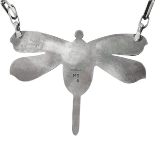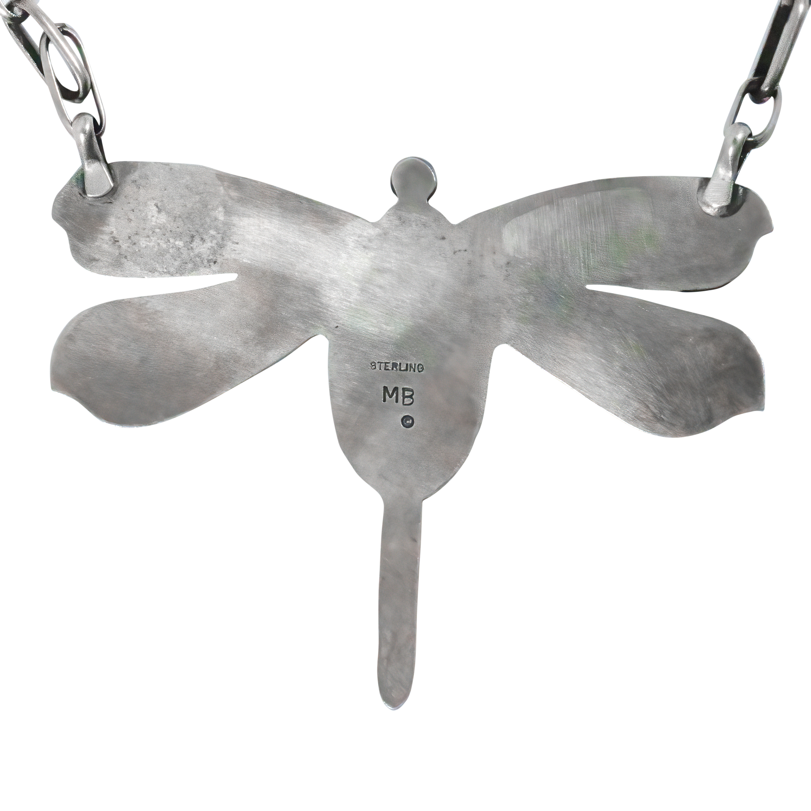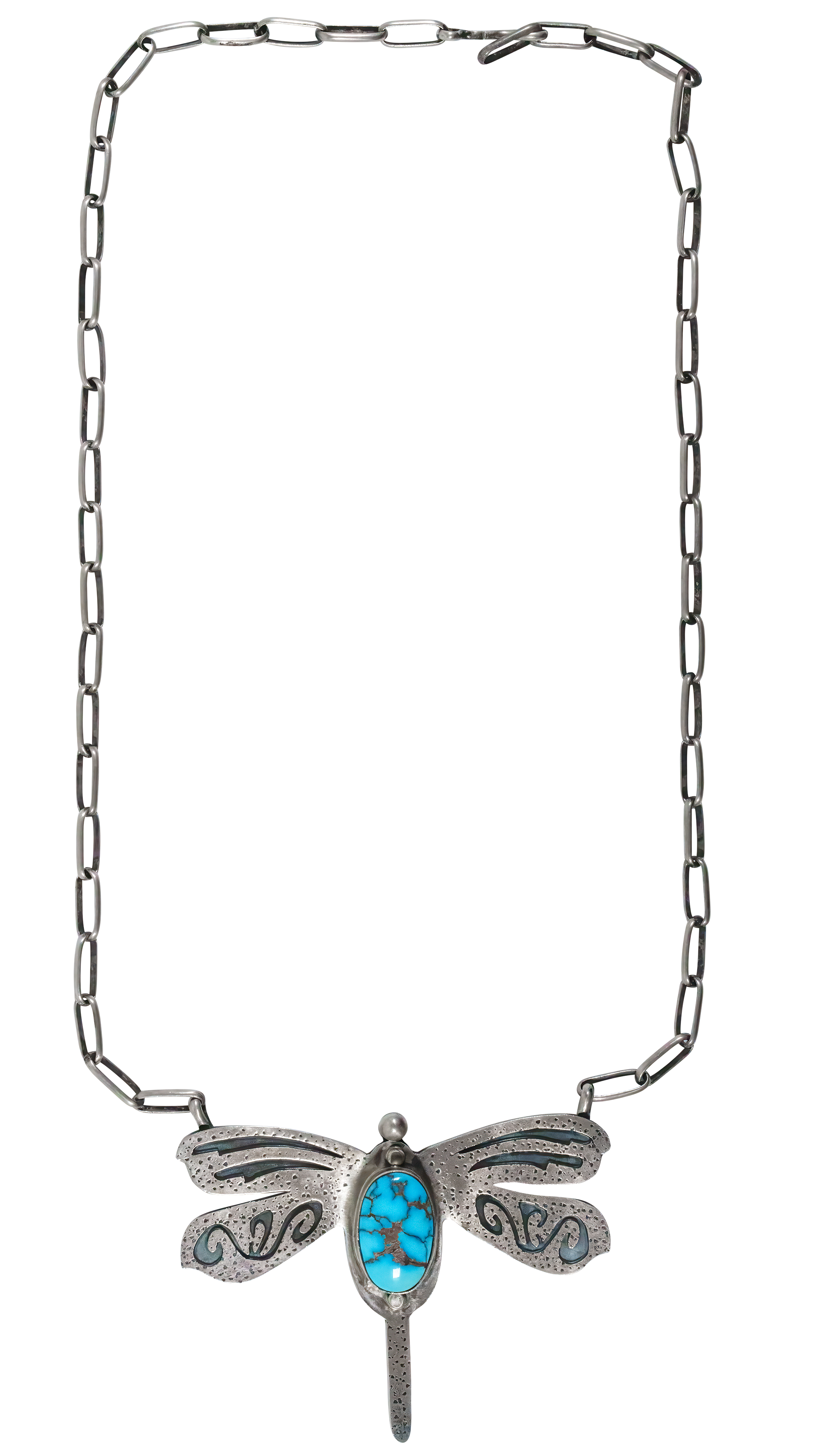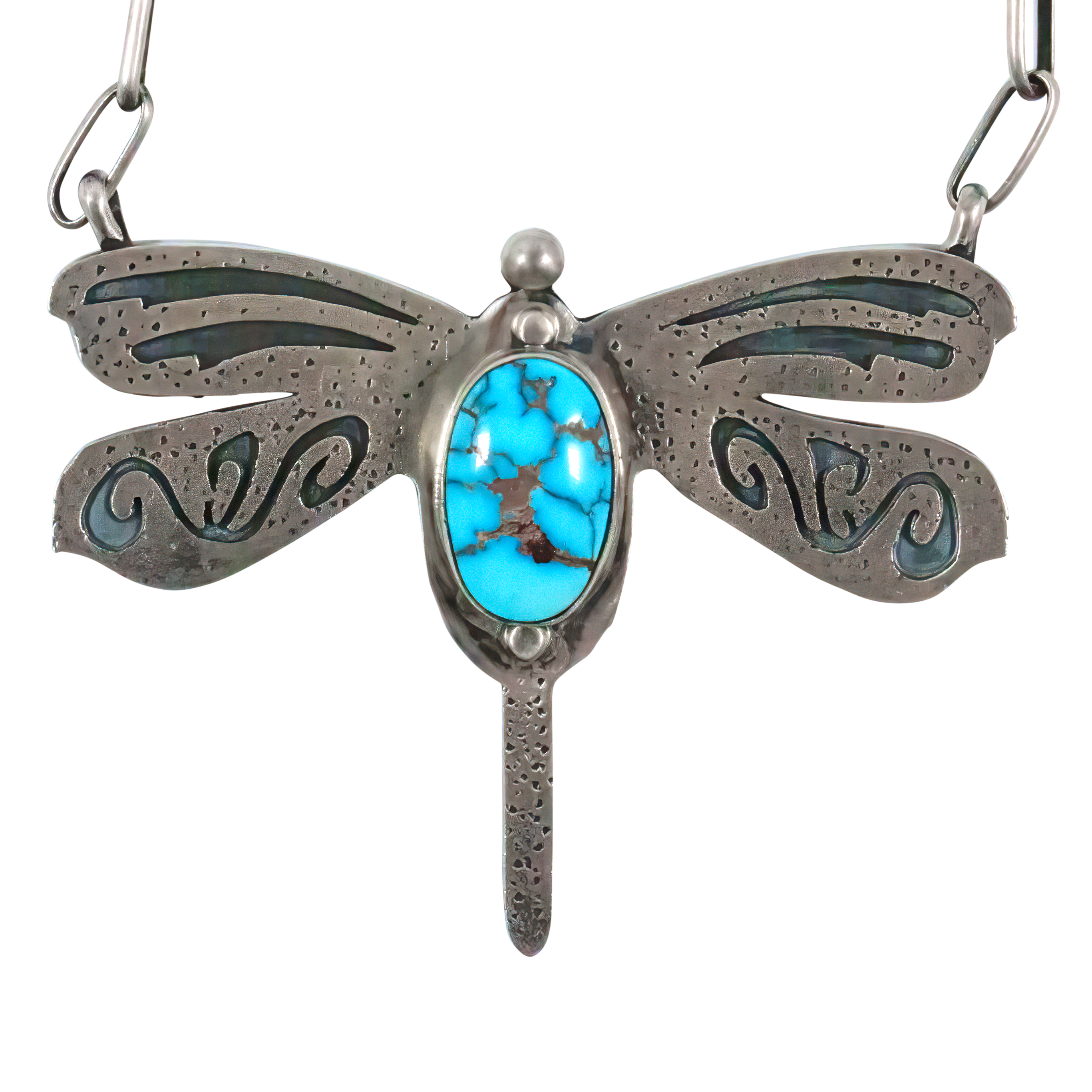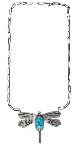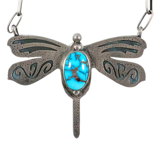 Embrace the beauty of nature with this stunning dragonfly necklace, a captivating creation by Navajo artisan Marita Benally. Meticulously hand-stamped sterling silver adorns the insect’s wings, while a captivating Candelaria turquoise gemstone adds a burst of vibrant color. With each detail reflecting Benally's skillful artistry, this one-of-a-kind necklace is a wearable homage to the Southwest's elegance and the allure of Candelaria turquoise.