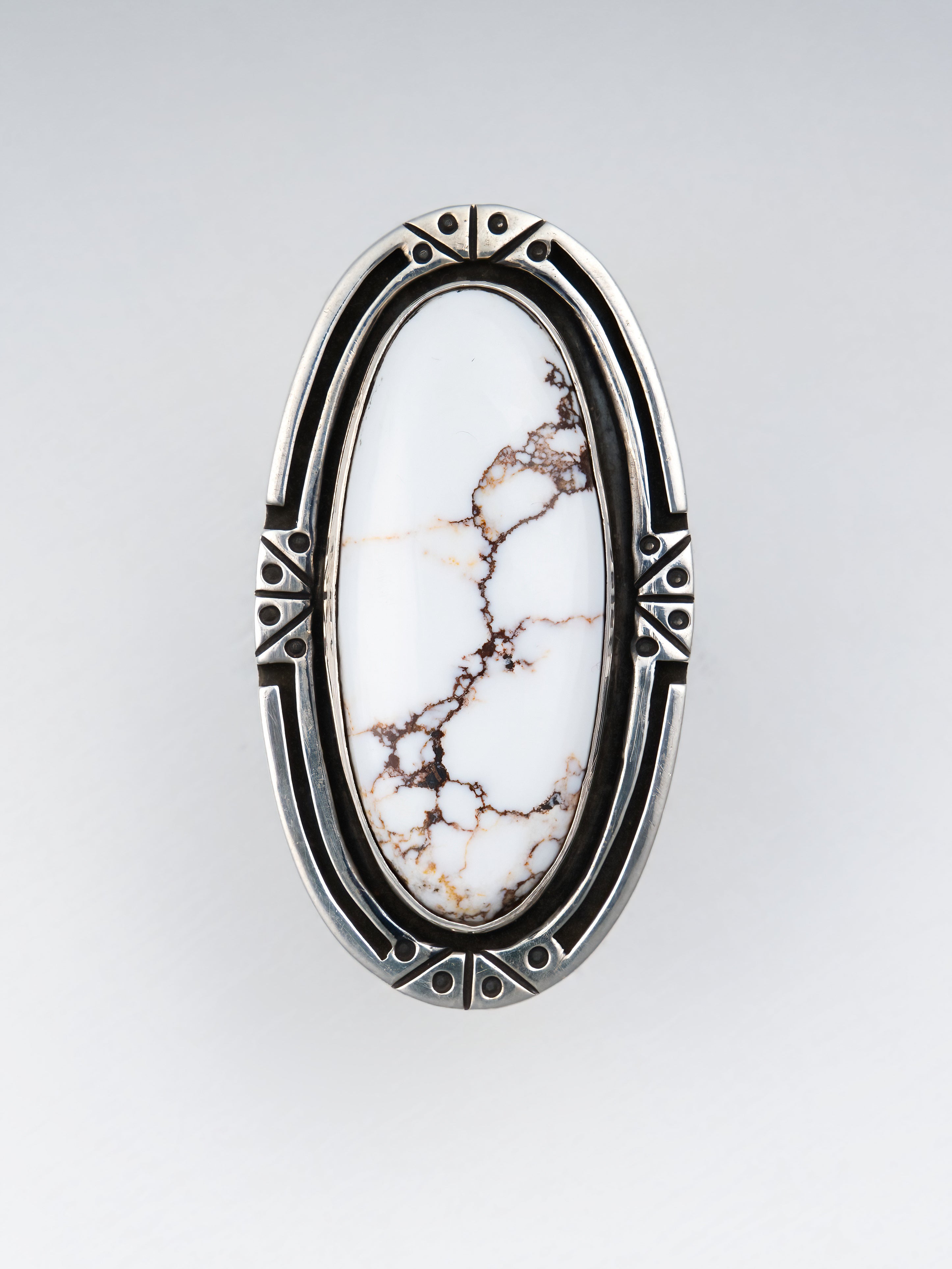 Handcrafted by Cooper Willie, this one-of-a-kind ring balances polished and oxidized sterling silver that surrounds a stunning Wild Horse Turquoise Stone. This elegant piece is full of small details and Willie’s signature, deep stamp-work. Hand-cut in an oval, the Wild Horse Turquoise stone shows off soft white and a delicate brown matrix.