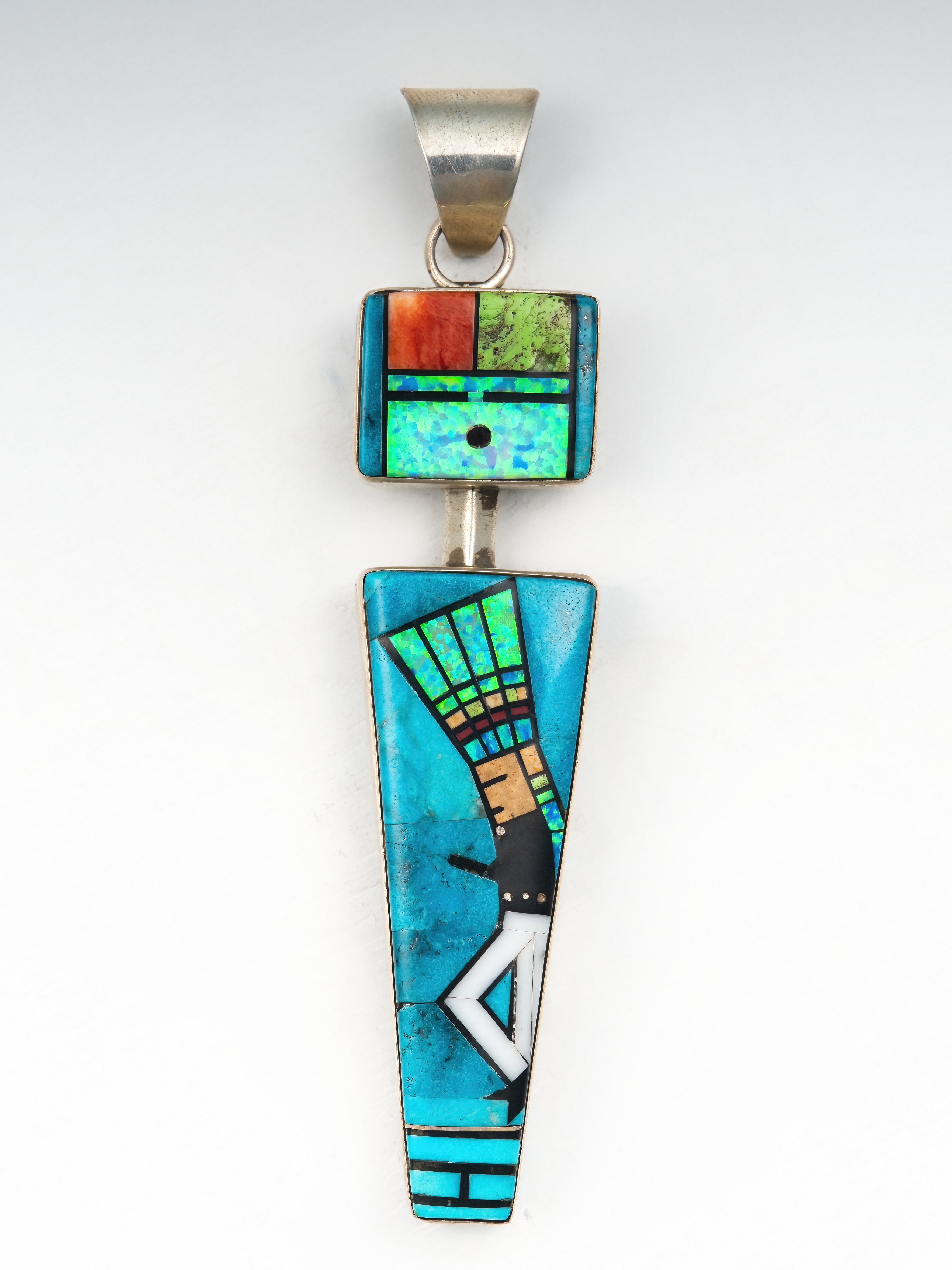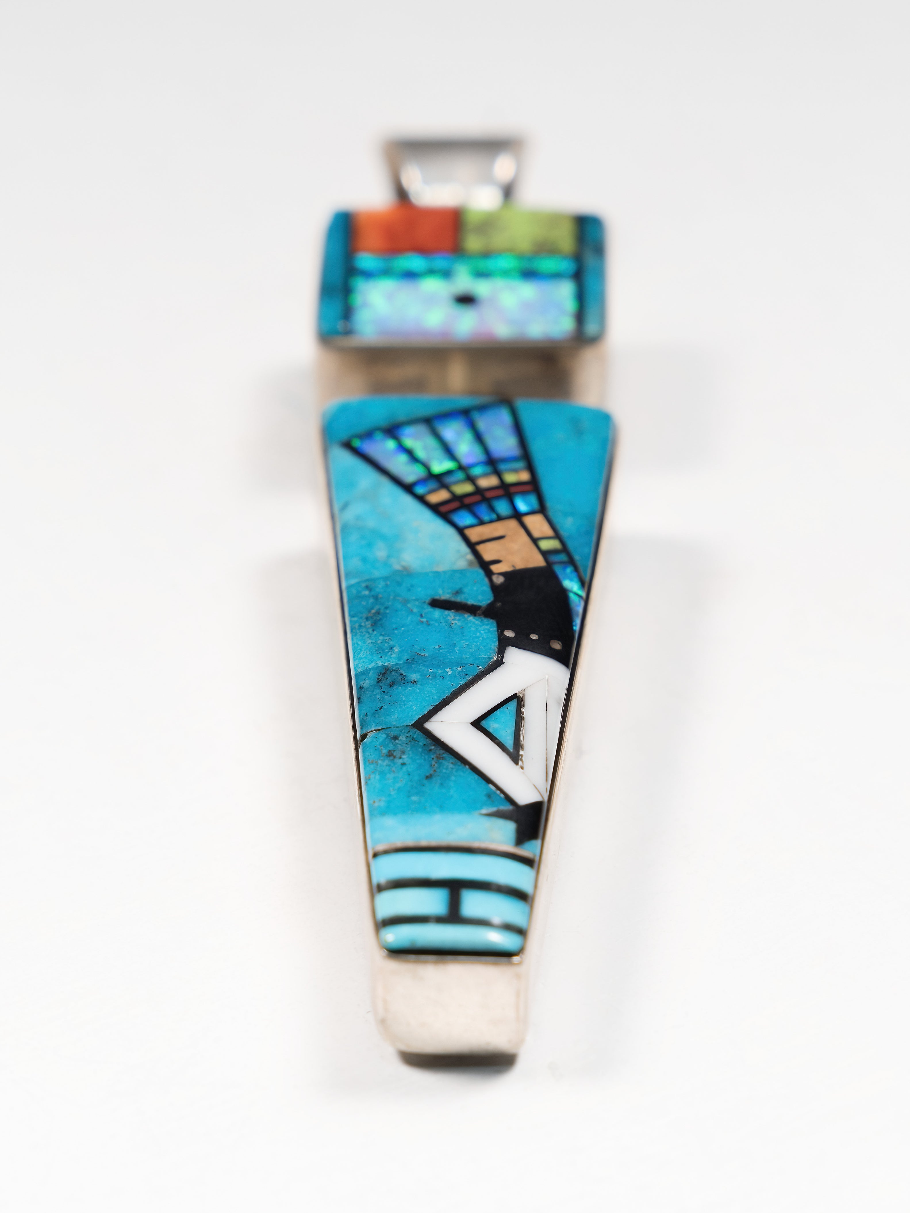 Ben Boyd presents a stunning work of wearable art with this pendant. Each element reveals his exemplary skill and eye for balance. Inlaid Kingman Turquoise, orange spiny oyster shell, white jet, lab opal, gaspeite, and jasper combine. At the center, a kachina leans forward in a field of blue. This is a truly unique piece that blends tradition with a touch of a contemporary edge.