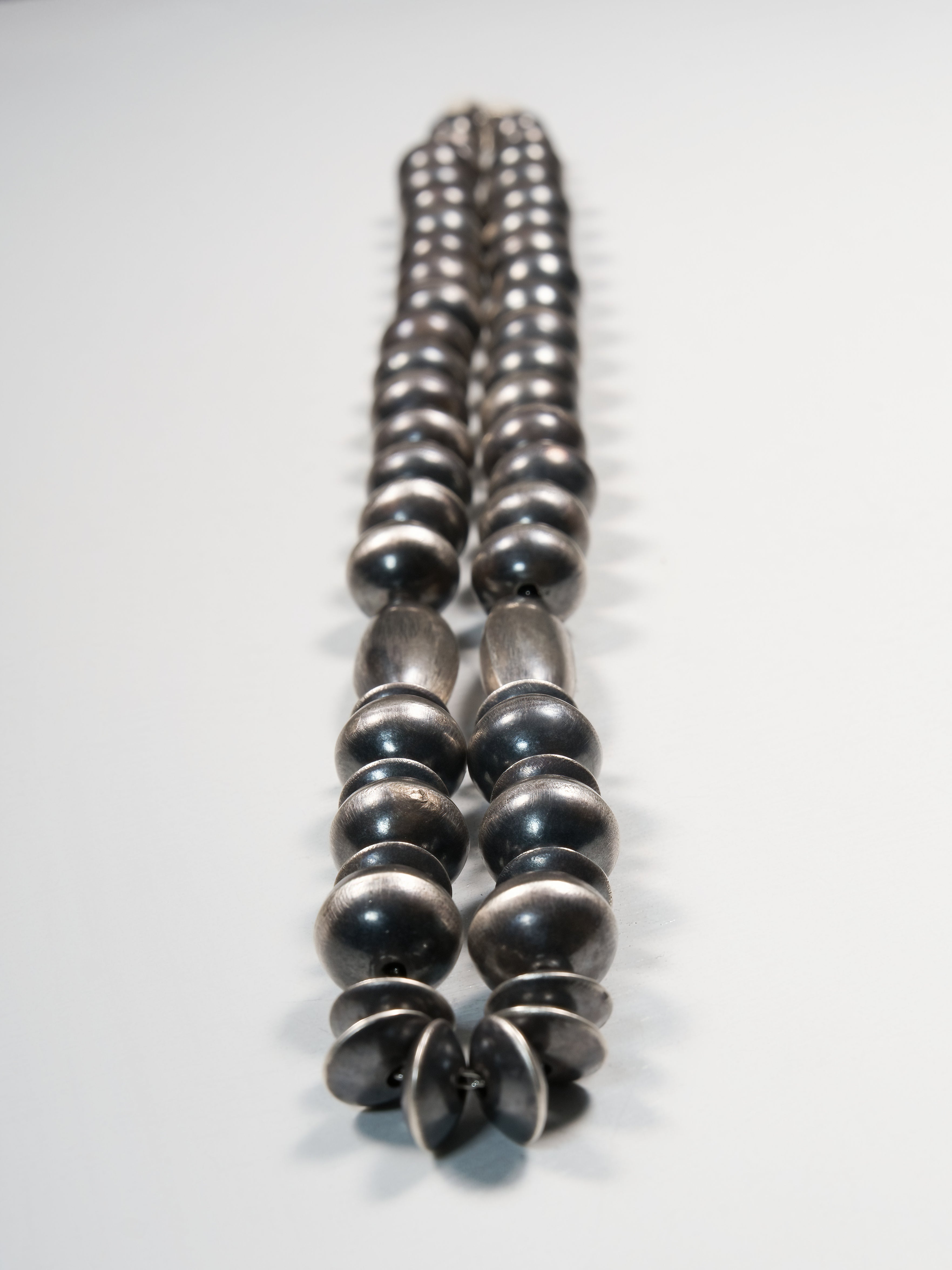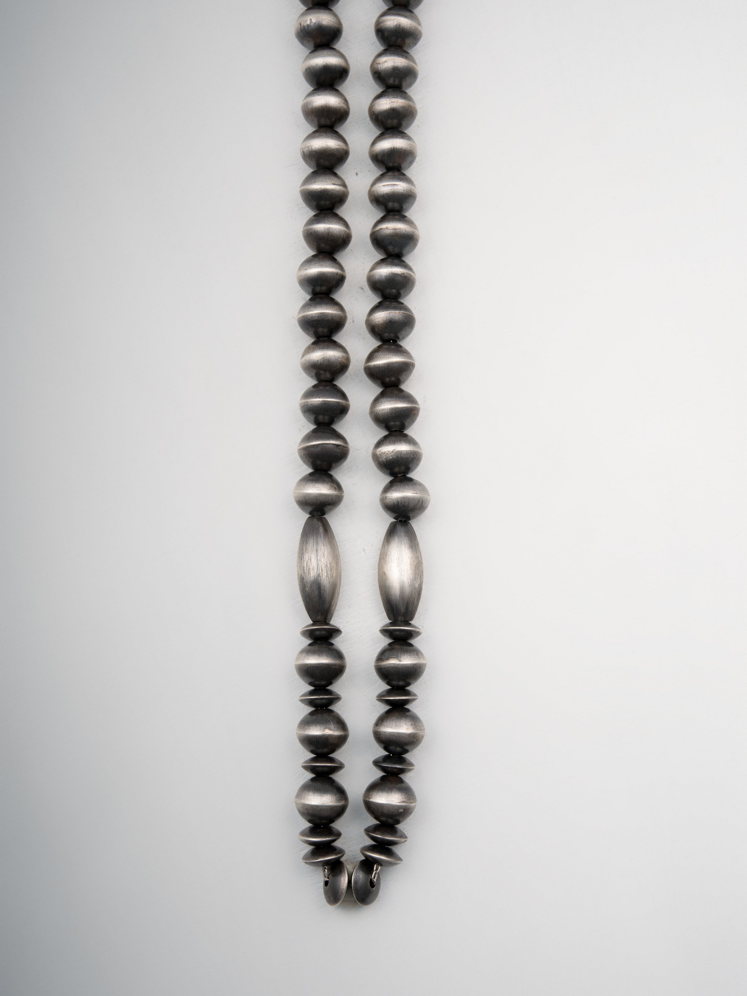 Accomplished artisan Virginia Tso’s appreciation for sterling silver and attention to detail carries this stunning Navajo pearl necklace. Hand-made saucer beads and barrel beads combine. A gorgeous accompaniment to larger jewelry ensembles or a statement piece on its own, this necklace is sure to be cherished for generations.