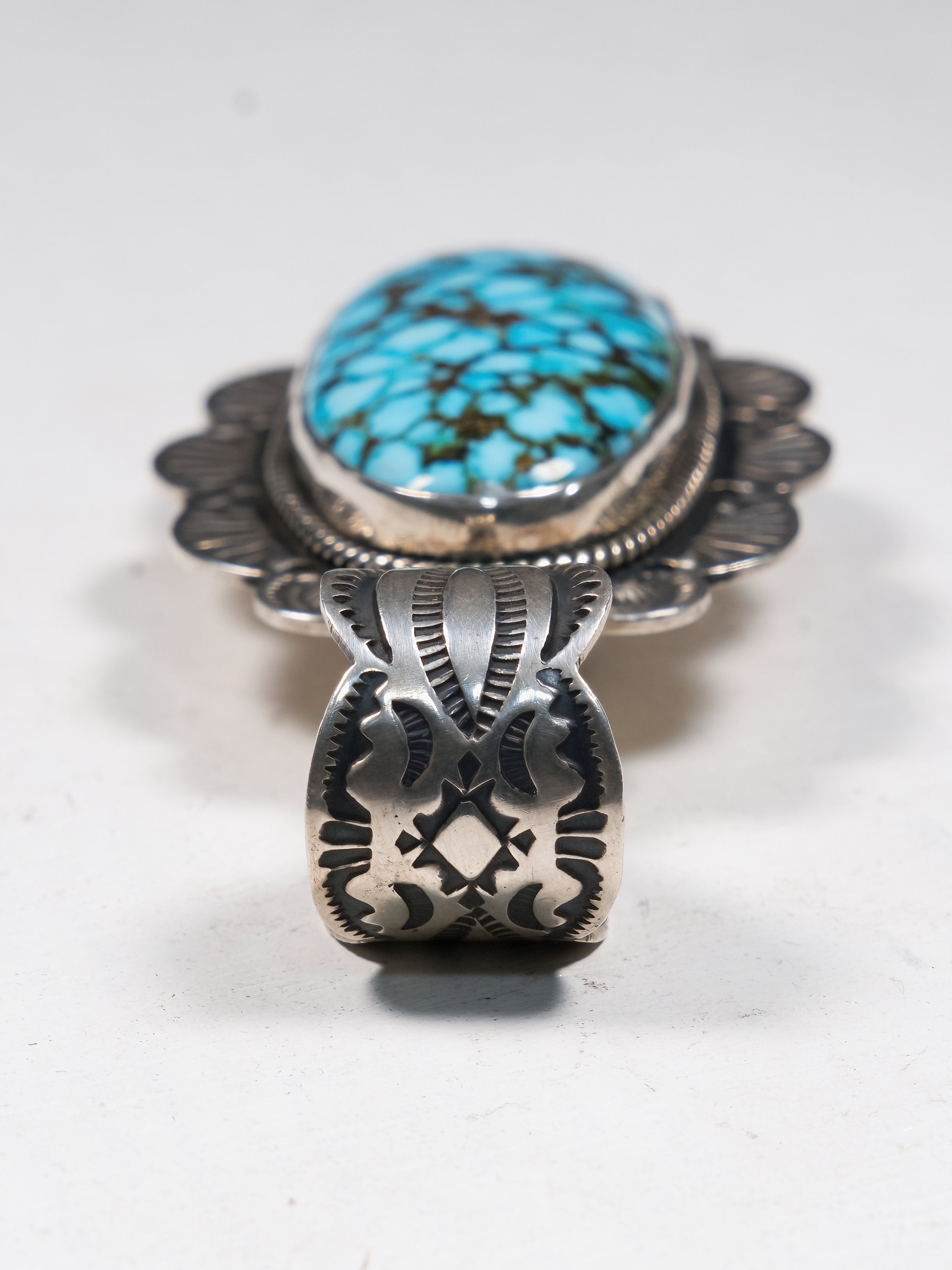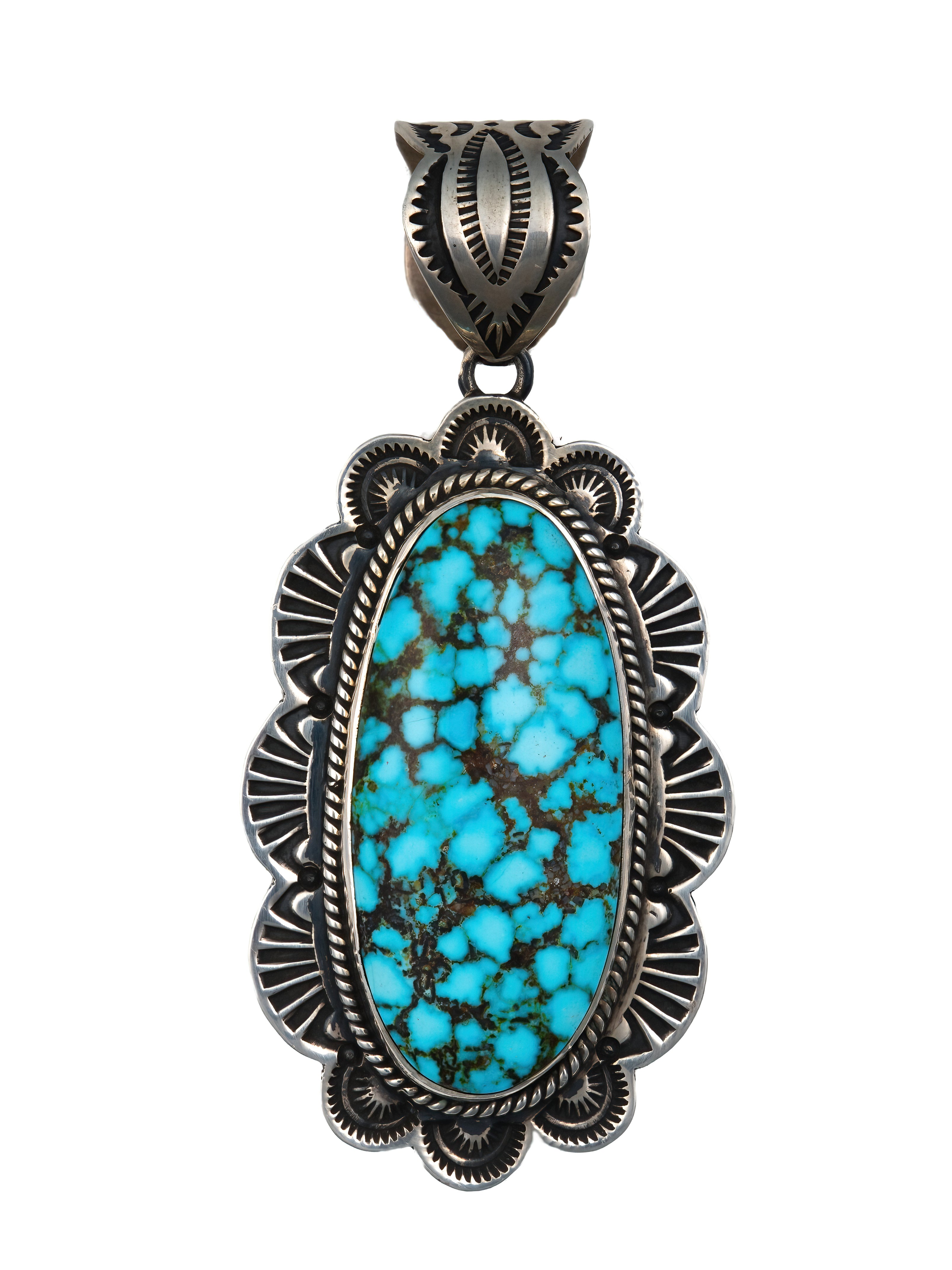 Handcrafted by accomplished artisan Happy Piasso, this pendant features a carefully selected and hand-cut Kingman Turquoise stone wrapped in sterling silver. The turquoise’s brilliant blue hues and earthy matrix gleams from the center. Replete with hand-stamped designs, twisted wire detailing, and scalloped edges, this piece is both elegant and dramatic.