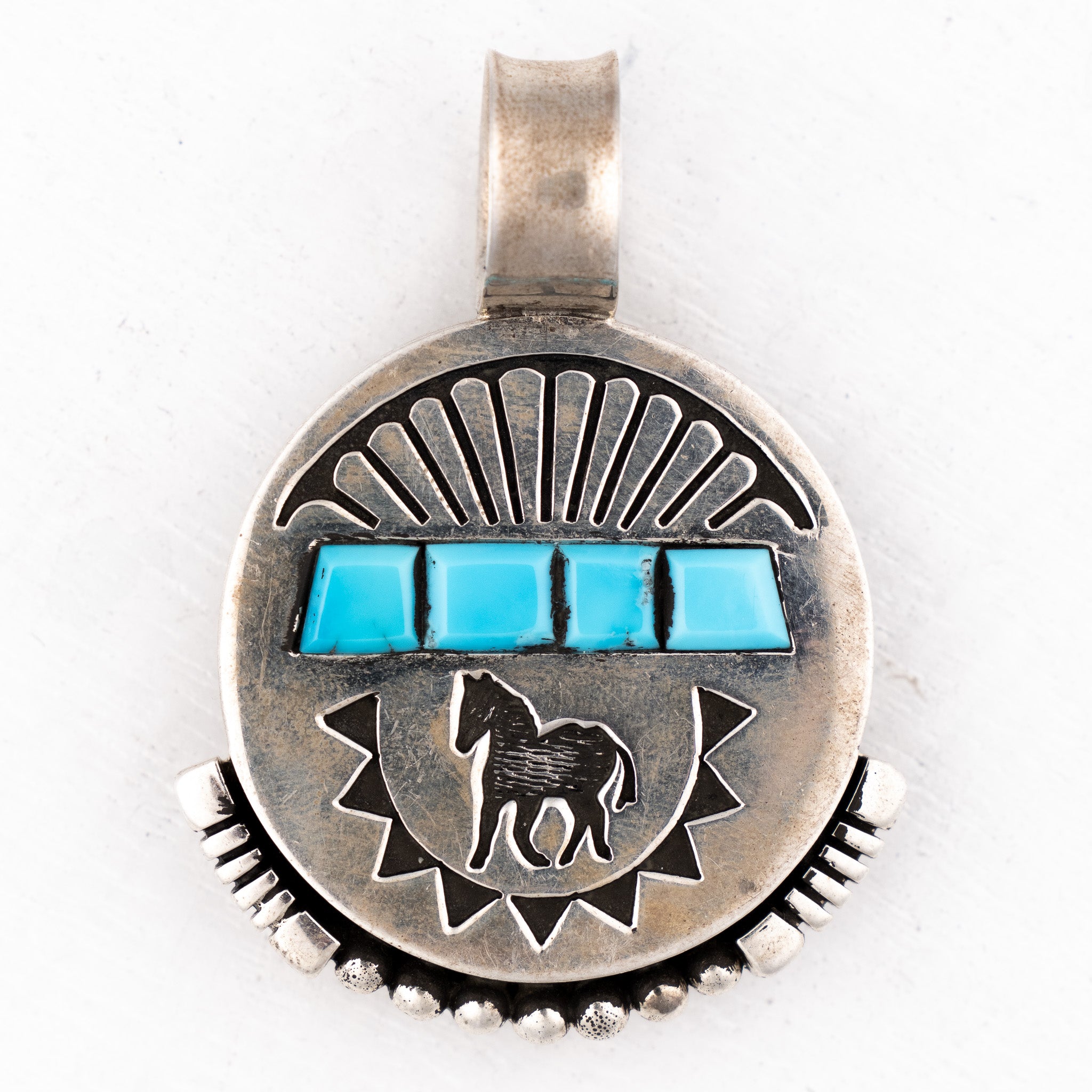 Handcrafted by Alvin and Lulu Begay, this stunning pendant is a unique, wearable works art. Royston Turquoise and Kingman Turquoise stones carefully cut into squares and inlaid in a cobblestone style form a vibrant line of color across this medallion-shaped piece. A hand-stamped horse gallops below the turquoise while hand-stamped rays stretch above the stones’ vibrant blue hues. Further elevated by silver drops and additional hand-stamped designs, thesis unforgettable pendant.