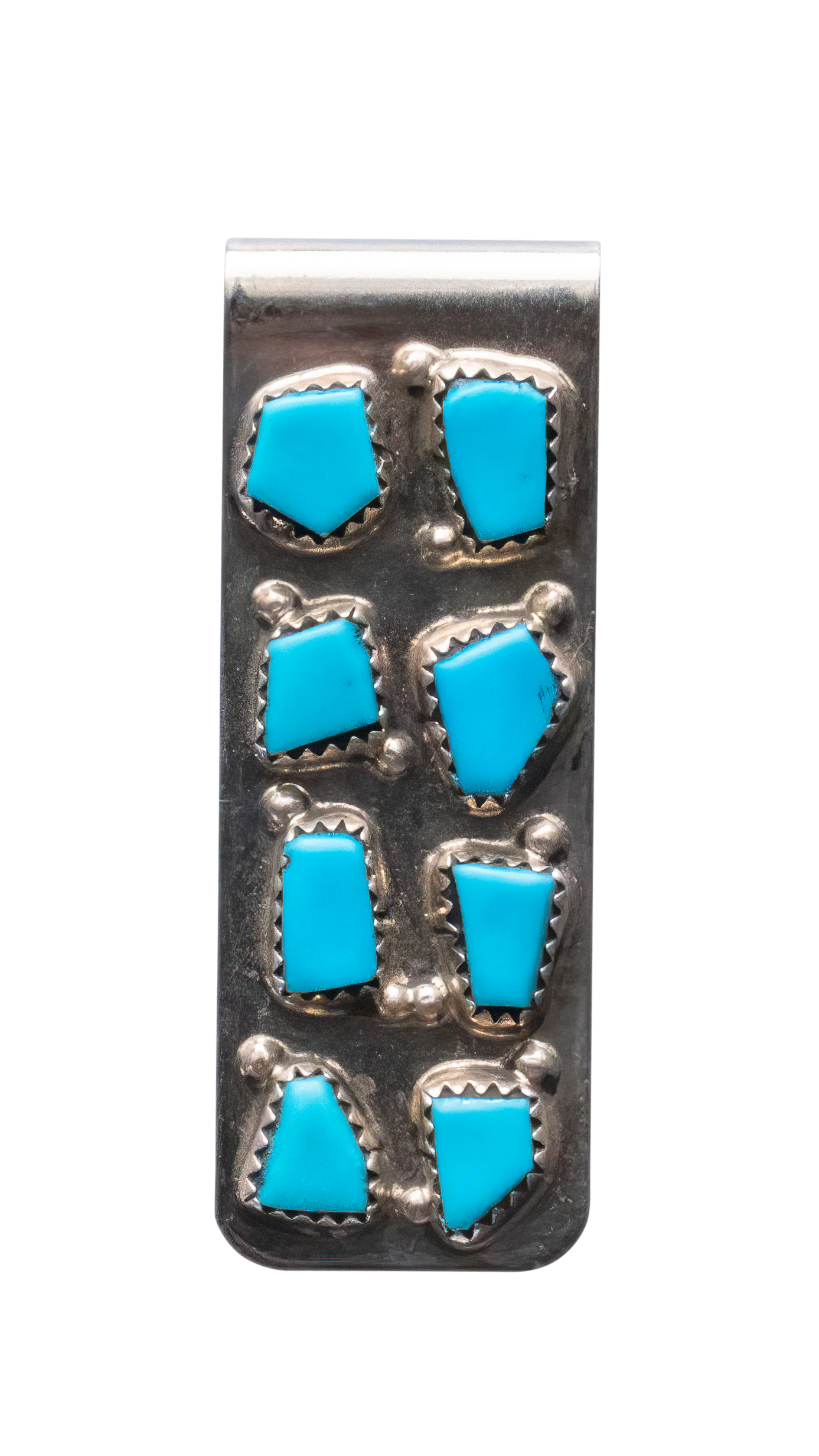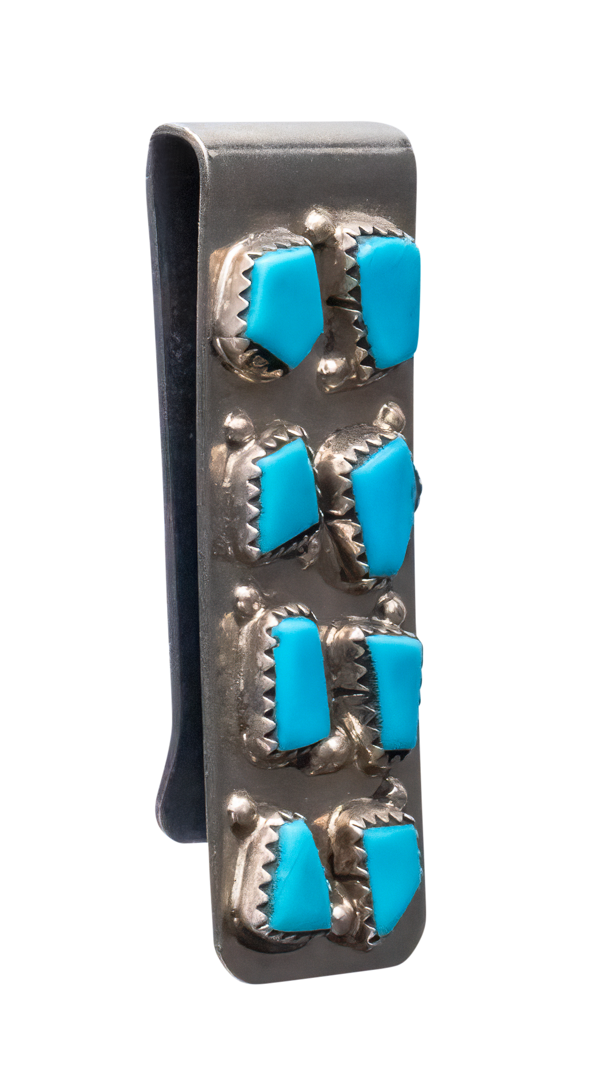 Crafted by Zuni Pueblo artist Curt Cheama, this money clip features eight, asymmetrical Sleeping Beauty Turquoise stones that showcase the characteristic, bright blue hues Sleeping Beauty Turquoise is known for. Contrasted by their shining sterling silver setting, the turquoise makes this piece a stand-out. Sawtooth bezels hold each stone in place, and silver drop accents are meticulously scattered between each stone for an additional touch of artistry.