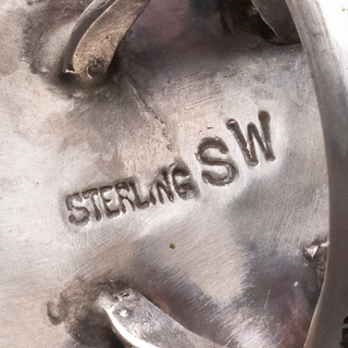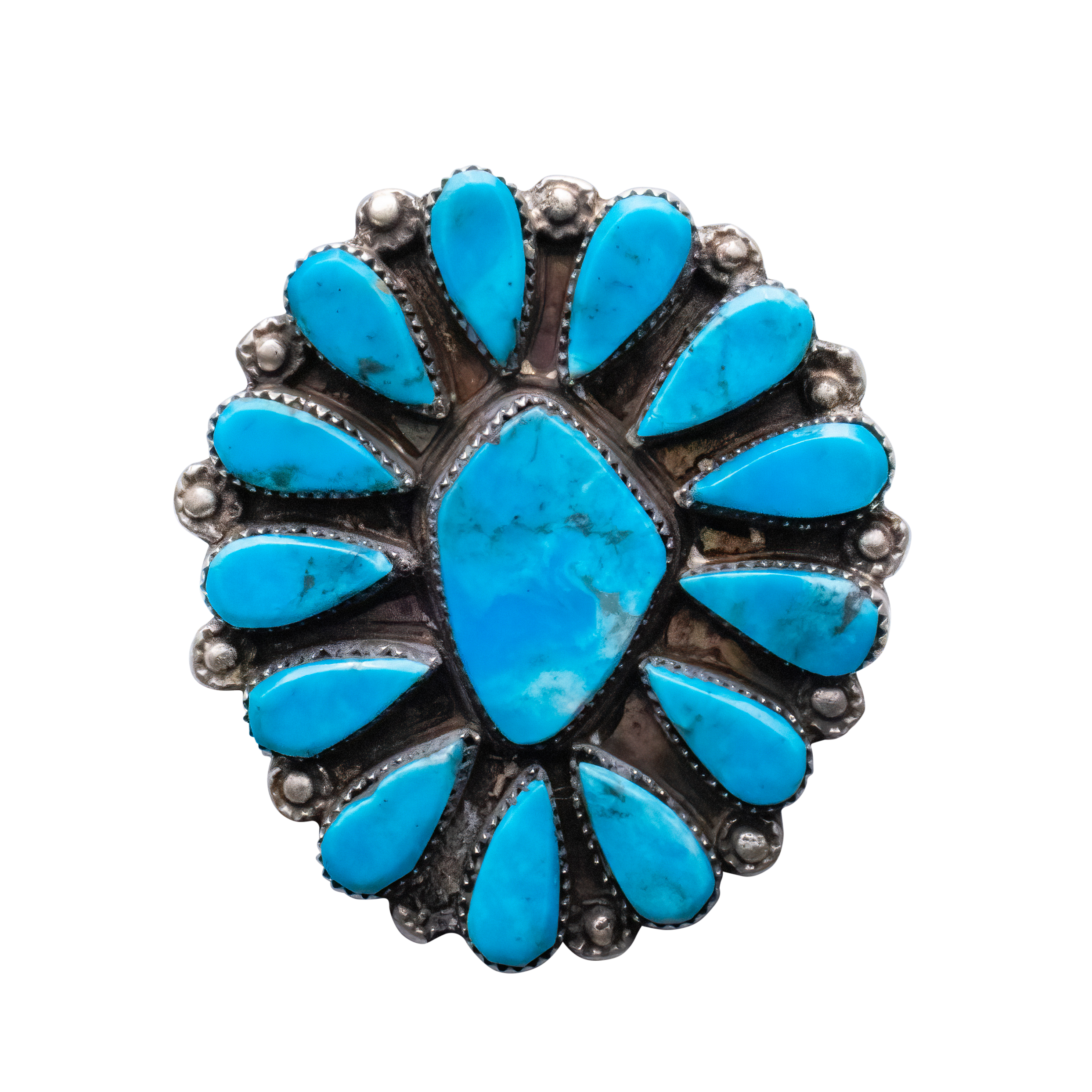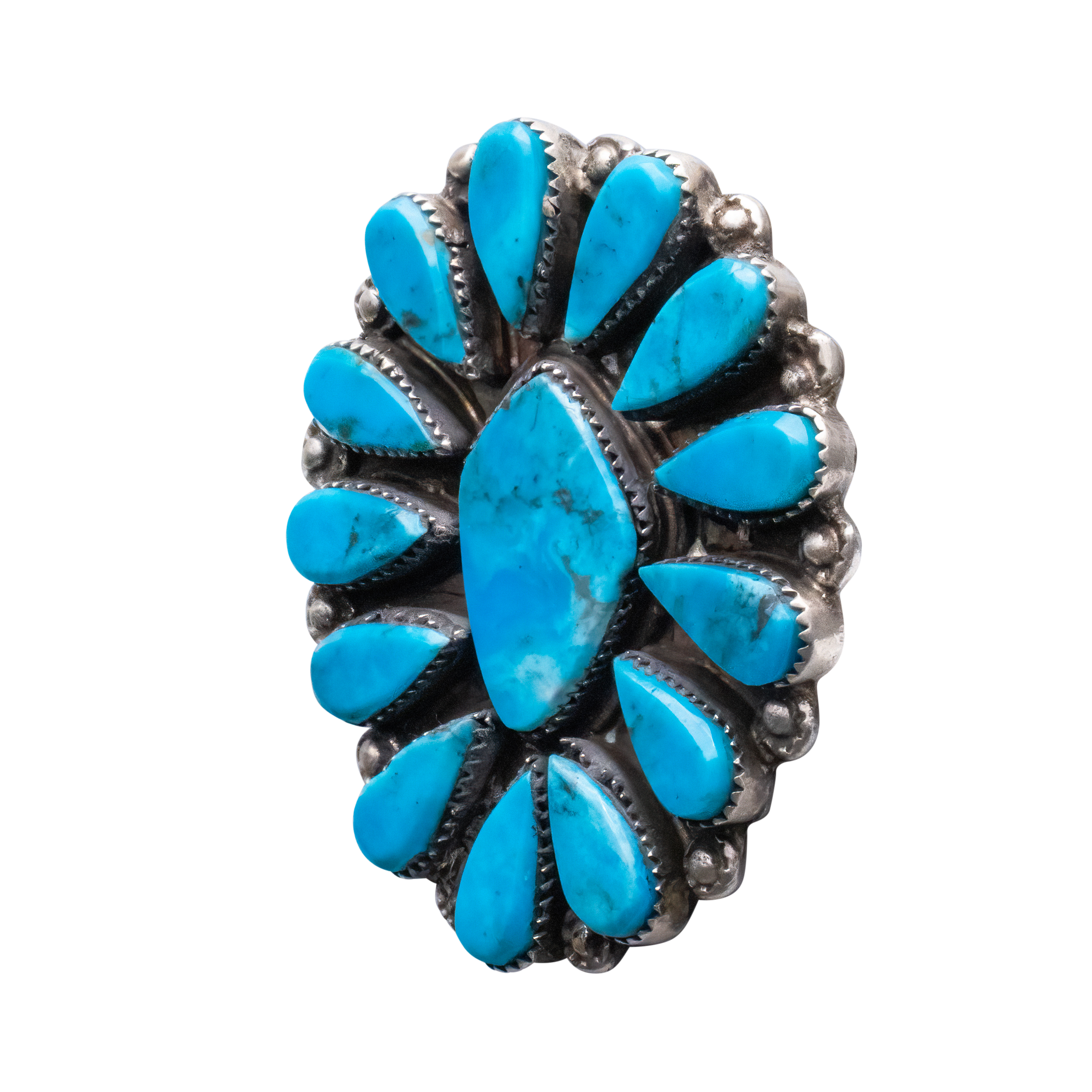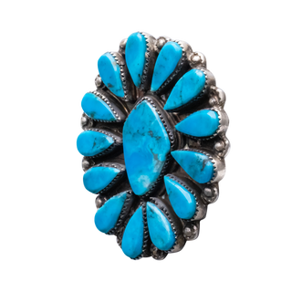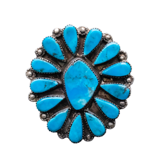 This stunning old pawn cluster ring, meticulously handcrafted by Navajo artist Selena Warner, showcases Kingman Turquoise's timeless beauty. Each stone was carefully selected for its vibrant blue hue and natural matrix before being arranged in a radiant pattern that draws the eye to the center. A setting of traditional sterling silver bezels connected by silver droplets add elegance and intricacy to the ring's design. The darkened background of the silver enhances the turquoise's striking color, giving the ring a classic, vintage appeal. Warner's artistry is evident in the balanced composition and the exquisite craftsmanship, making this piece a cherished collectible that embodies the rich history and cultural heritage of Navajo jewelry.