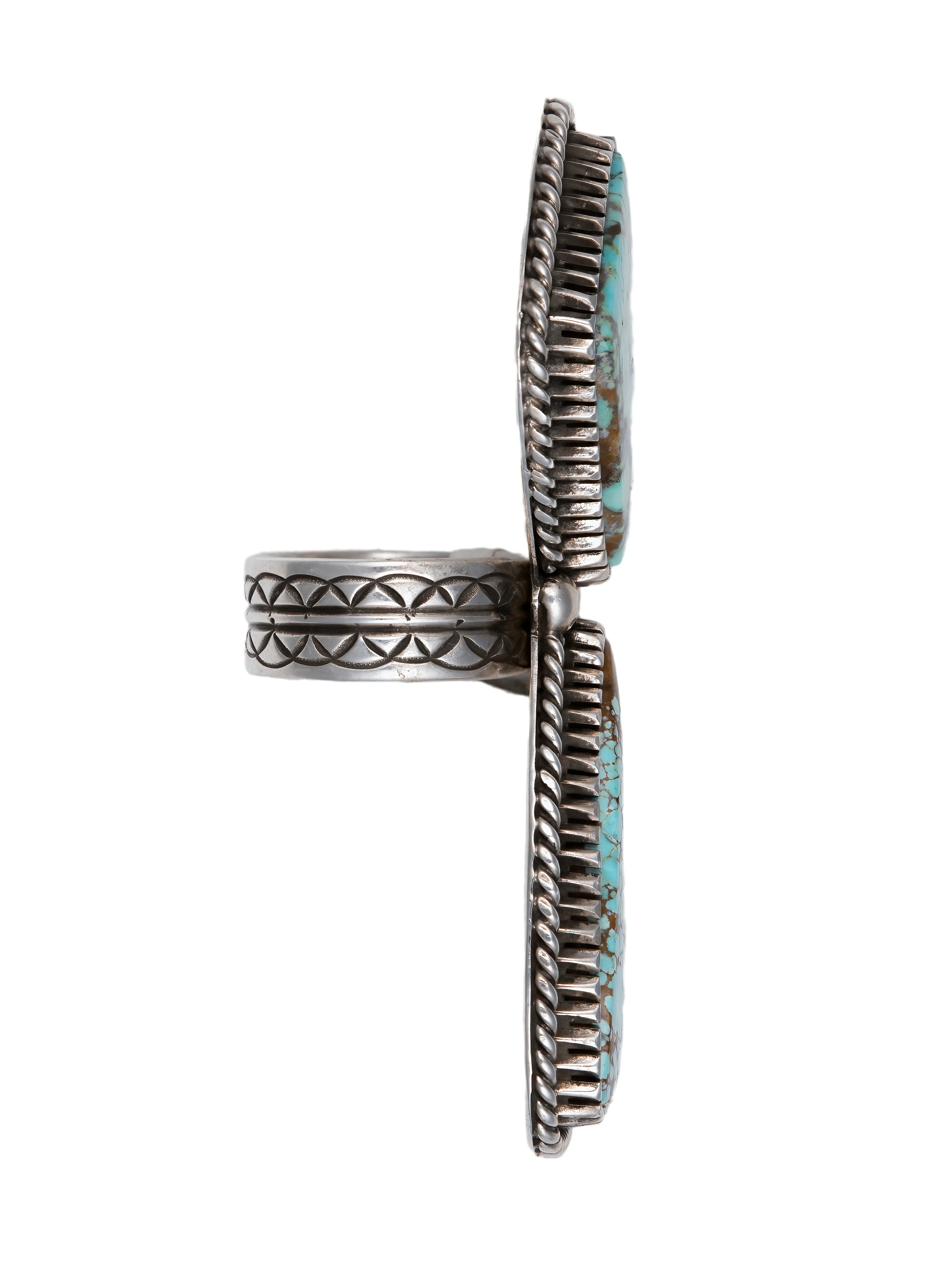A delicate, yet strong, sterling silver band strings two bold Number Eight Turquoise stones together to grace your finger. With hand-made bezels wrapping around each stone, the turquoise’s vibrant blue hues and gold and brown matrix are expertly highlighted. A celebration of this both silver-smithing and this unique type of turquoise, this ring handcrafted by Landon Secatero is as bold as it is elegant.