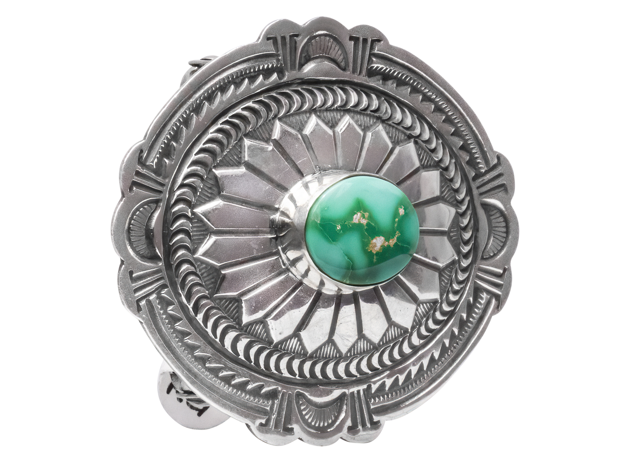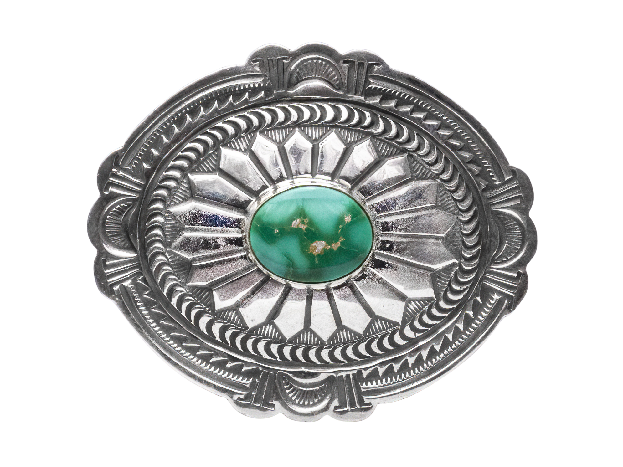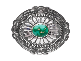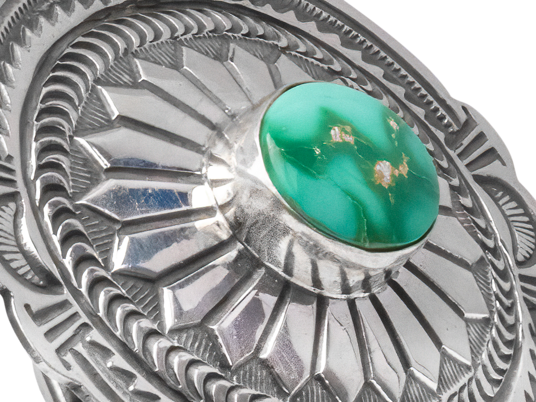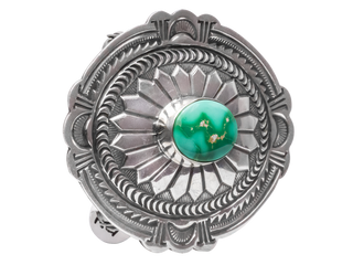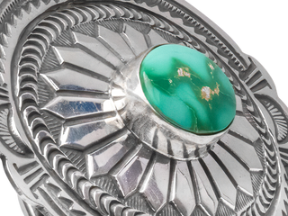 Made by the talented--and highly accomplished--artist Arnold Blackgoat, this belt buckle features a single stone of Sonoran Turquoise that gleams with this type of turquoise's characteristic vibrant colors and matrix. A hand stamped design is carved into the buckle's bright sterling silver setting, giving this piece a unique look full of traditional aesthetics. With a gentle oval shape and expert silver-work, the buckle's overall design is also a nod to craftsmanship and concho shells.