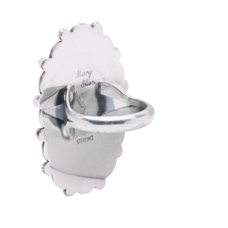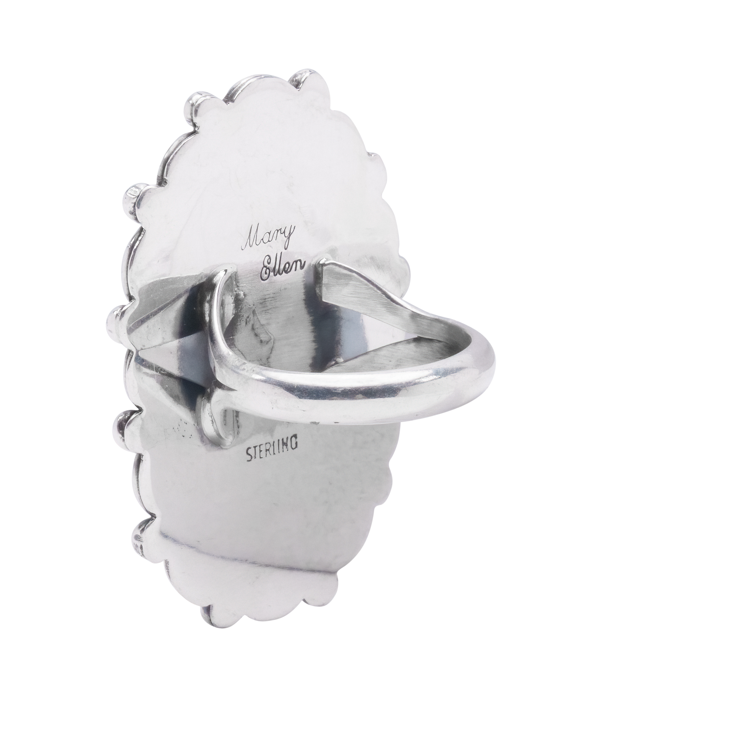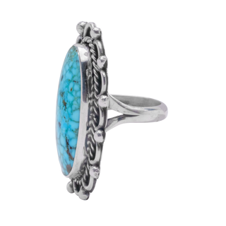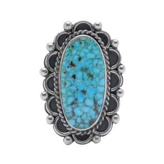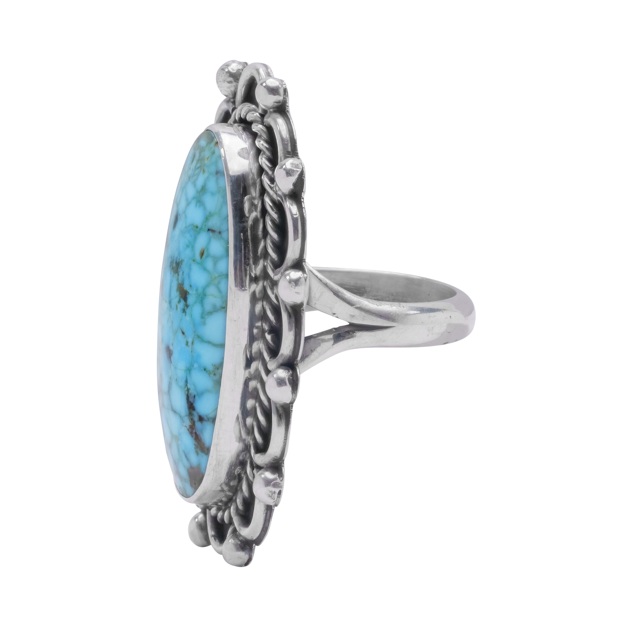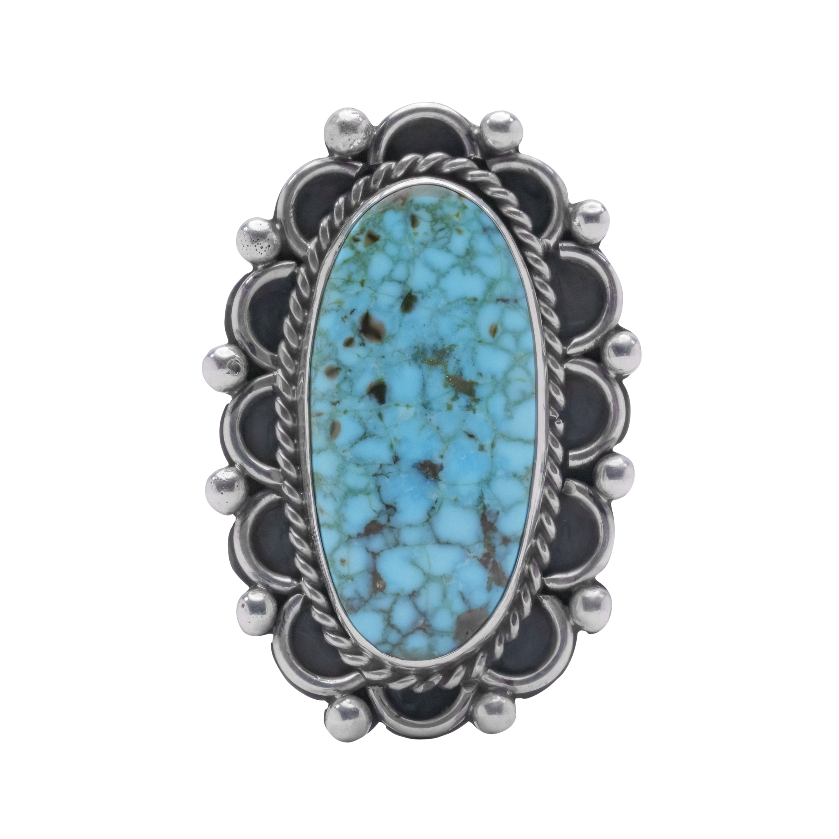 A masterpiece of silver work, this exquisite ring highlights Mary Ellen's artistic vision. Birdseye Kingman turquoise nestles inside a detailed silver twist framed by silver loops and drops gleams a striking blue woven with a gold and rich brown matrix with hints of bright green. This ring is a sophisticated piece of art that elevates any outfit.