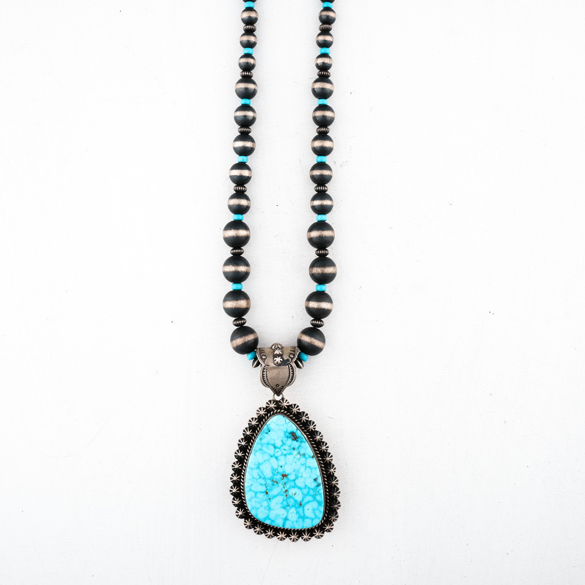 A Water Web Kingman Turquoise stone shows off vibrant sky blue hues surrounded by sterling silver twisted wire detailing and signature silver buttons to create a stunning pendant. Above this center-piece, graduated Navajo Pearls alternate with turquoise beads. An eye-catching work of artistry and excellent craftsmanship, this is a truly unique set!