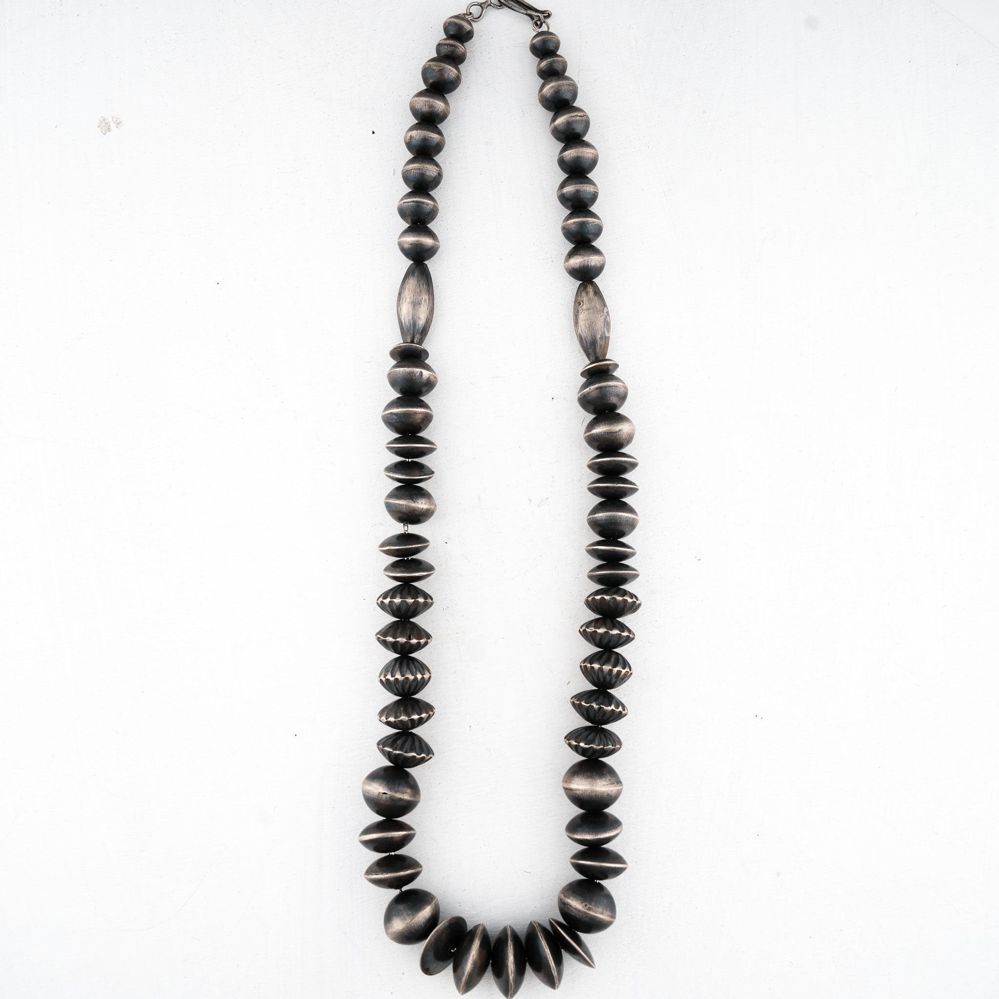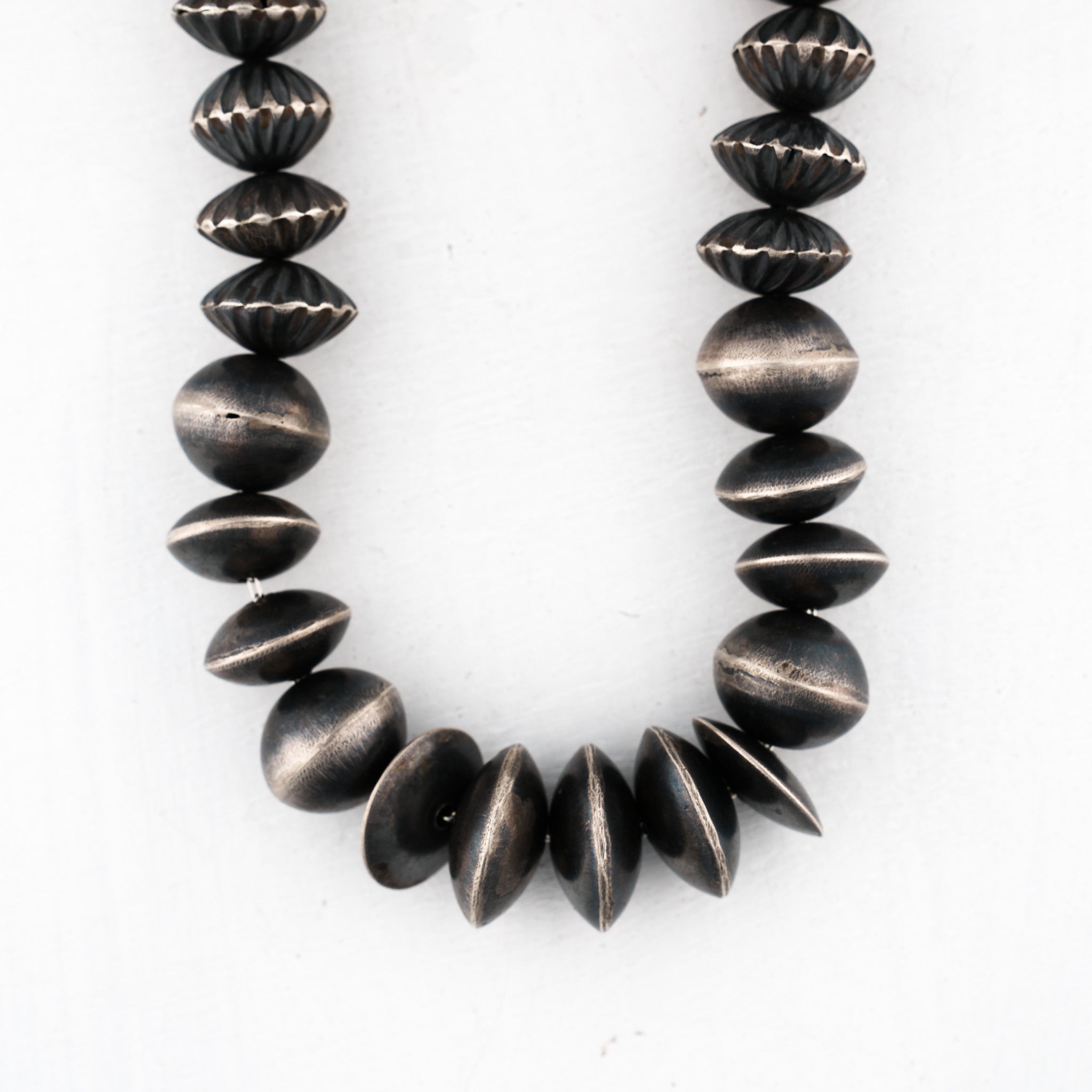 This stunning Navajo Pearl necklace is replete with Virginia Tso’s eye for detail and exemplary craftsmanship. Hand-domed saucer pearls are interspersed between the traditional Navajo Pearls andHand-domed saucer pearls and further elevated by stamped beads. Entirely crafted from sterling silver, this necklace is timeless.
