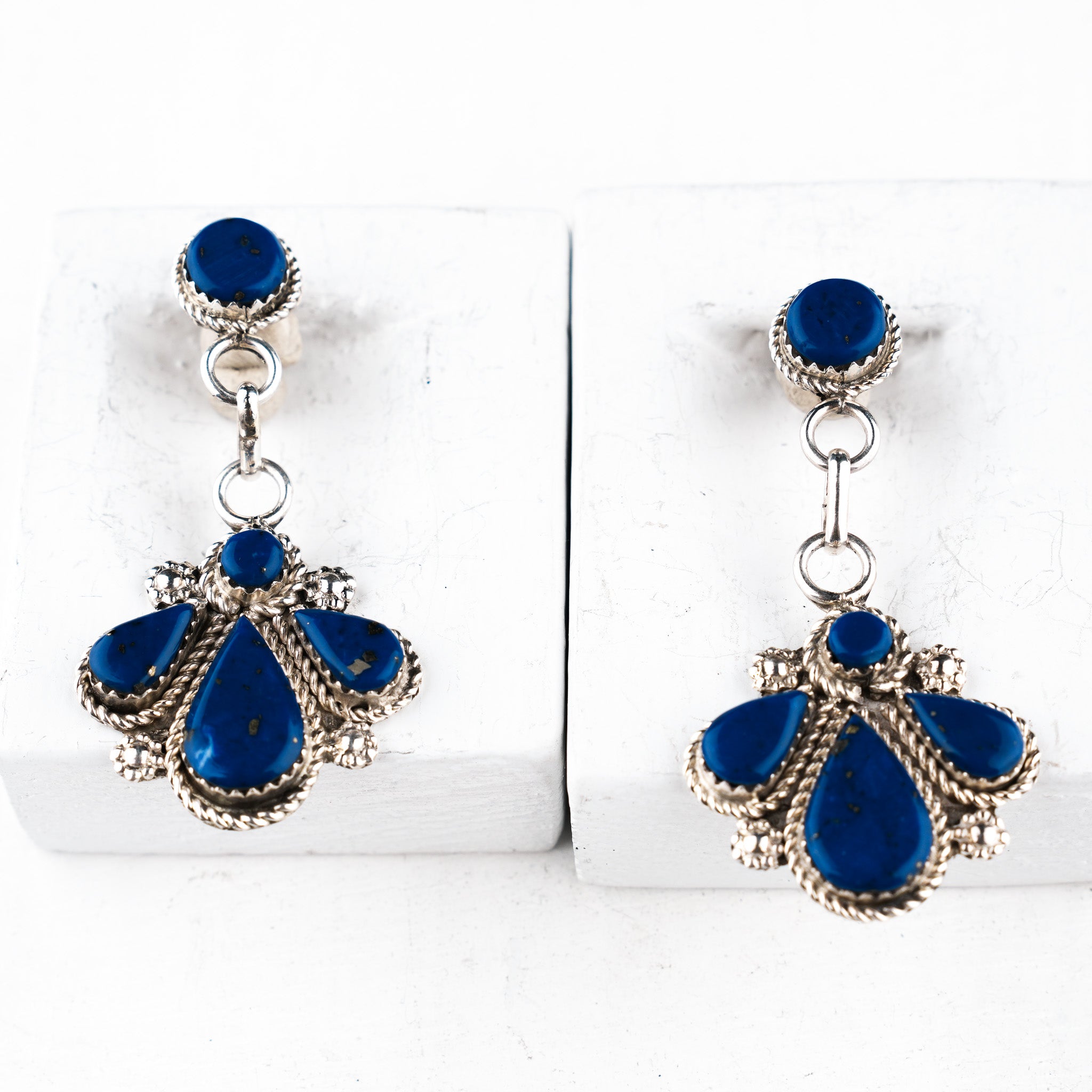 Lapis lazuli and sterling silver combine this elegant set of post earrings! A semi-cluster dangles from a round lapis lazuli stone at the post by sterling silver links to create an elegant silhouette that moves with you.Each lapis stone is full of deep blue hues, effortlessly balanced by the vibrant sterling silver.