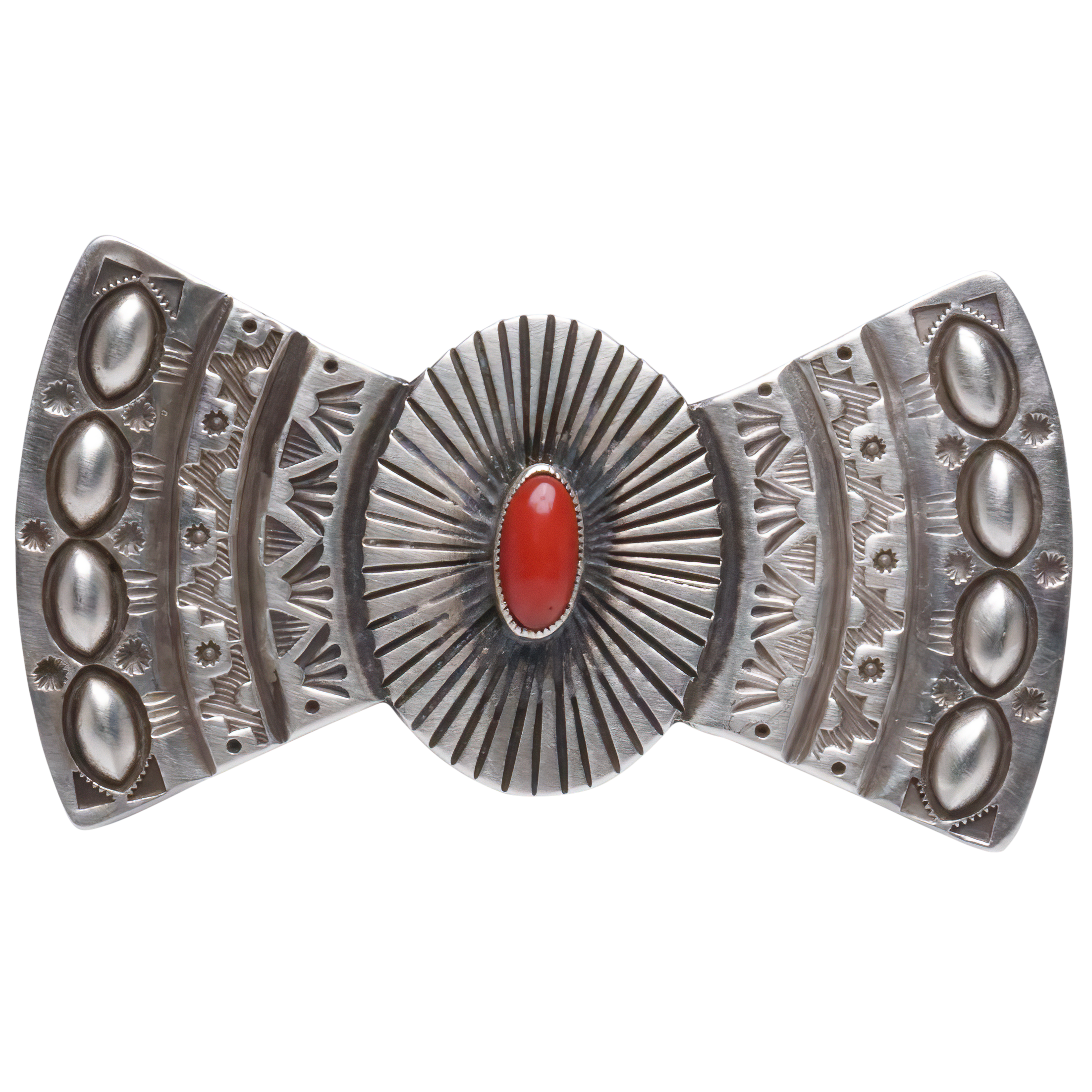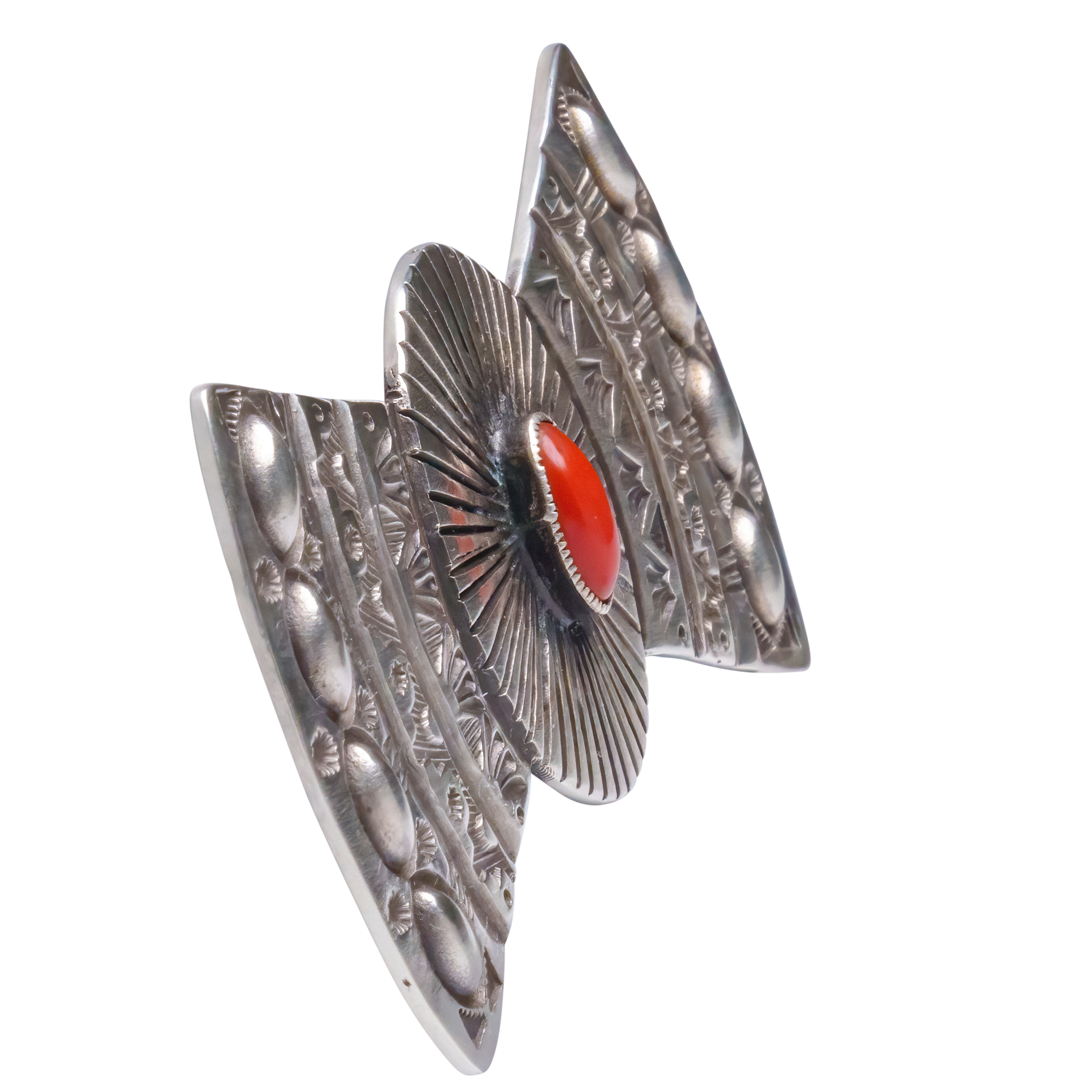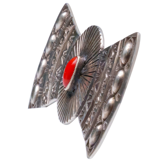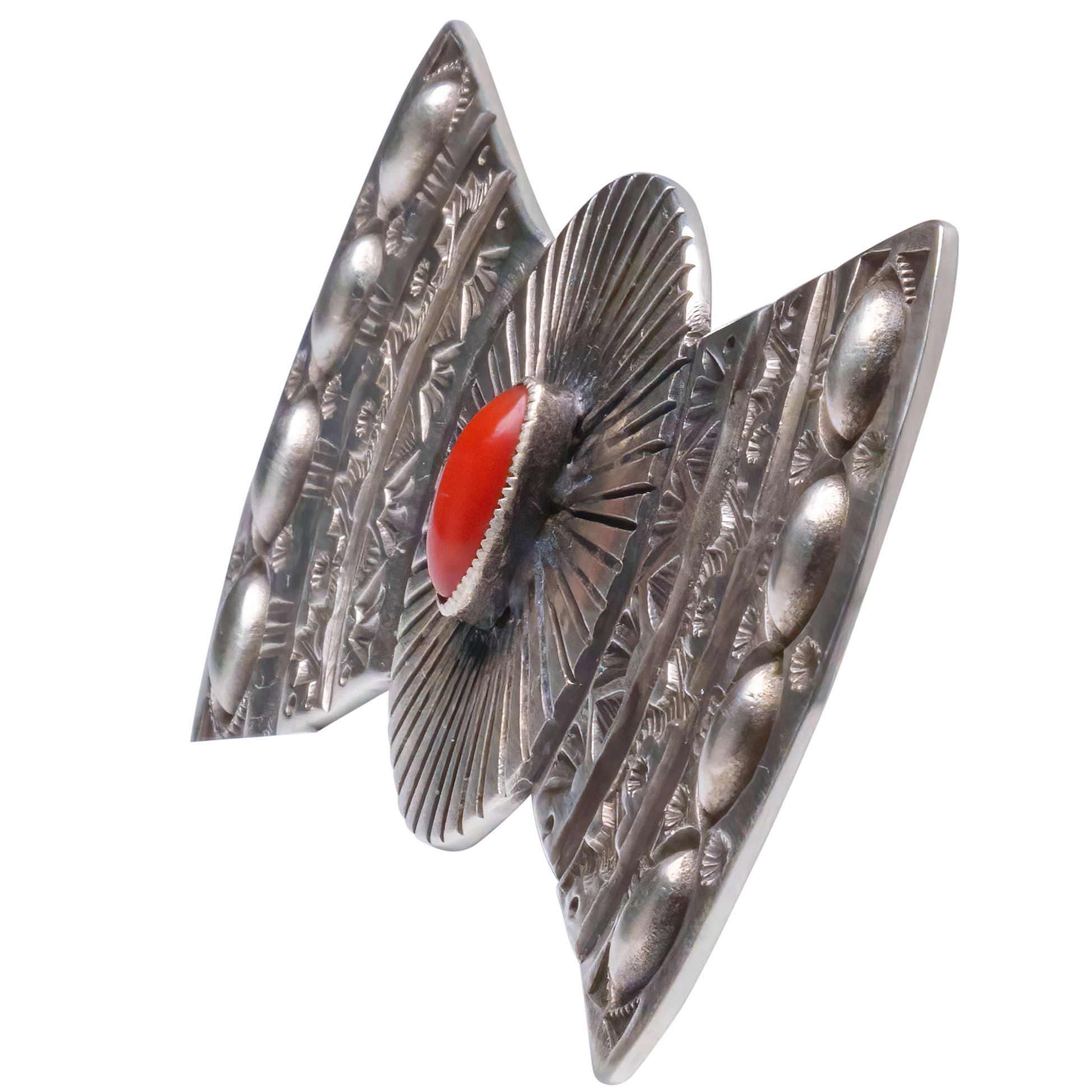 Elevate your attire with the this exquisite pin by well-known artisan Calvin Martinez. With a fusion of meticulous silver craftsmanship and vibrant coral elegance, this pin is more than an accessory; it's a wearable statement of masterful craftsmanship and sophisticated beauty.