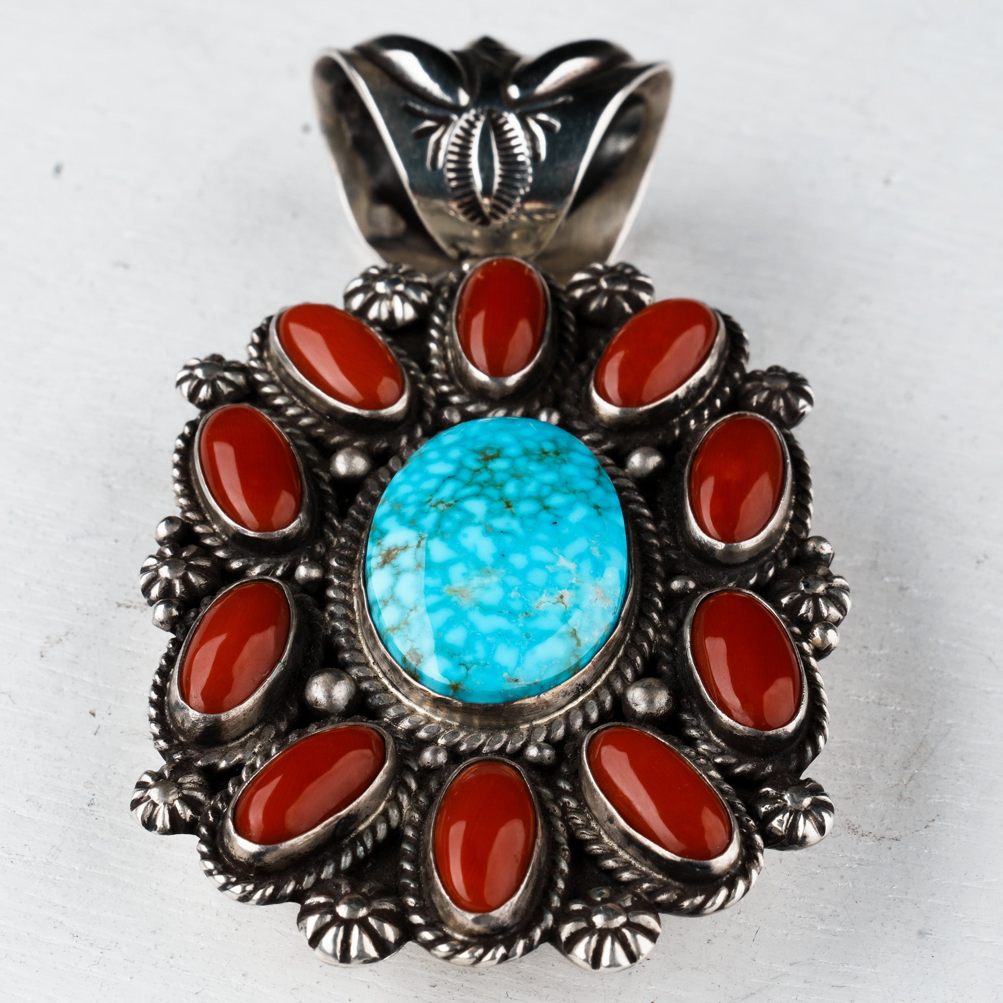 This beautiful Kingman Turquoise, coral, and sterling silver pendant with a detachable, hand-stamped bail is a contemporary take on a traditional design. Tyler Brown surrounds the vibrant, ocean blue Kingman Turquoise center-stone with deep red coral. The stones and coral are set in a cluster style arranged in an oval to add a contemporary touch. Each stone and coral is wrapped in twisted wire detailing and hand-applied silver buttons. This colorful pendant is truly one-of-a-kind!