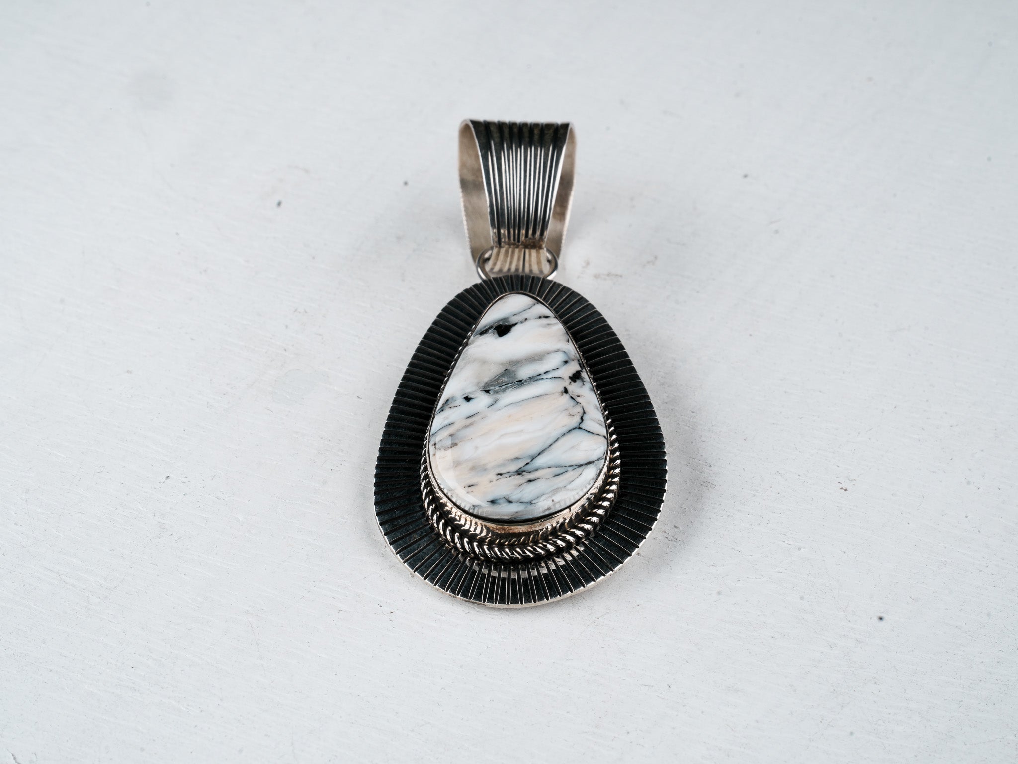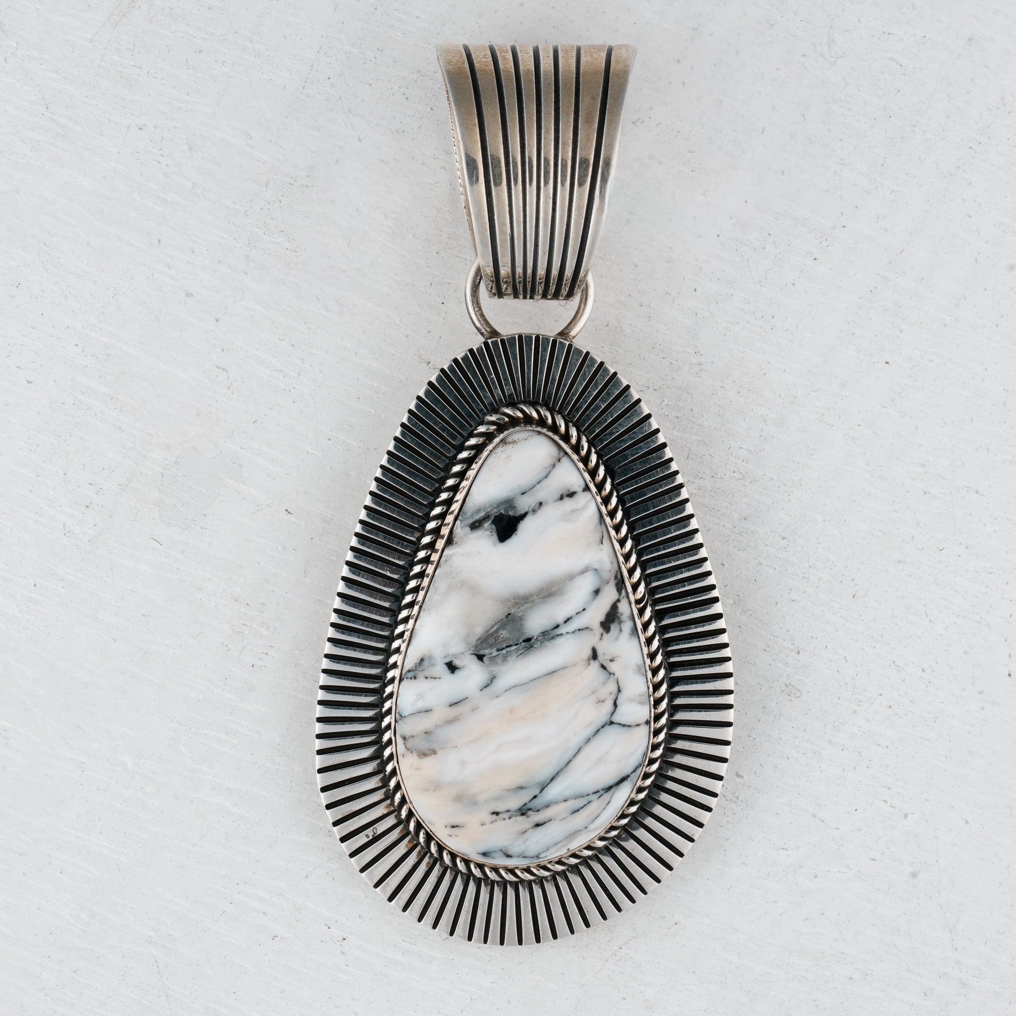 An elegant White Buffalo Turquoise stone full of whites, blacks, and subtle browns sits at the center of this stunning pendant. Crafted with Albert Jake’s eye for balance and deceptively simple lines that build a sense of visual movement, this pendant is a one-of-a-king piece for any occasion. The tear-drop shaped stone is surrounded by twisted wire detailing and had-stamped designs that effortlessly meld turquoise and sterling silver.