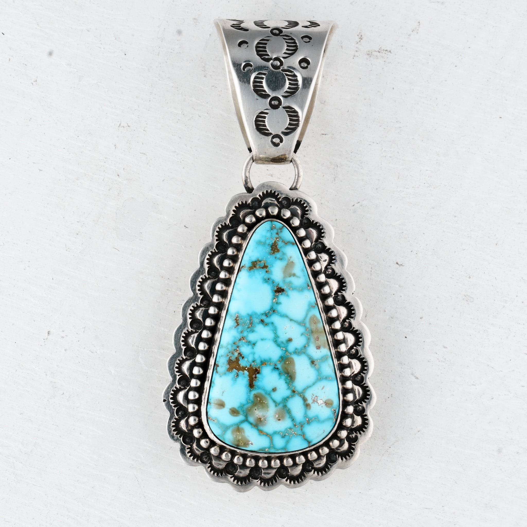 A unique Water Web Kingman Turquoise stone gleams from sterling silver in this beautiful pendant. Hand-crafted by Mary Ellen, each element is a testament to her skill and artistry. Silver drops, hand-stamped designs, and scalloped edges surround the tear-drop shaped stone. Hand-stamped designs along the bail finish this piece.