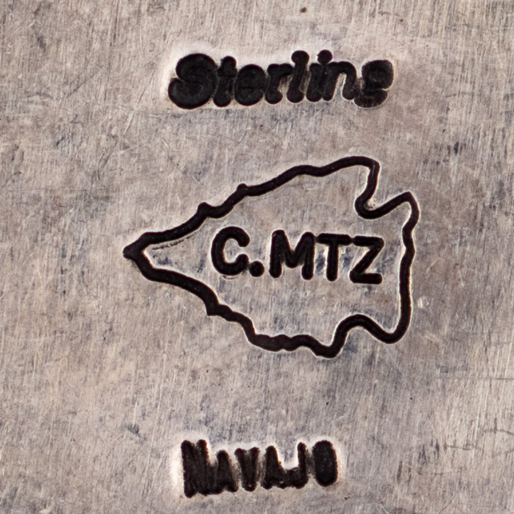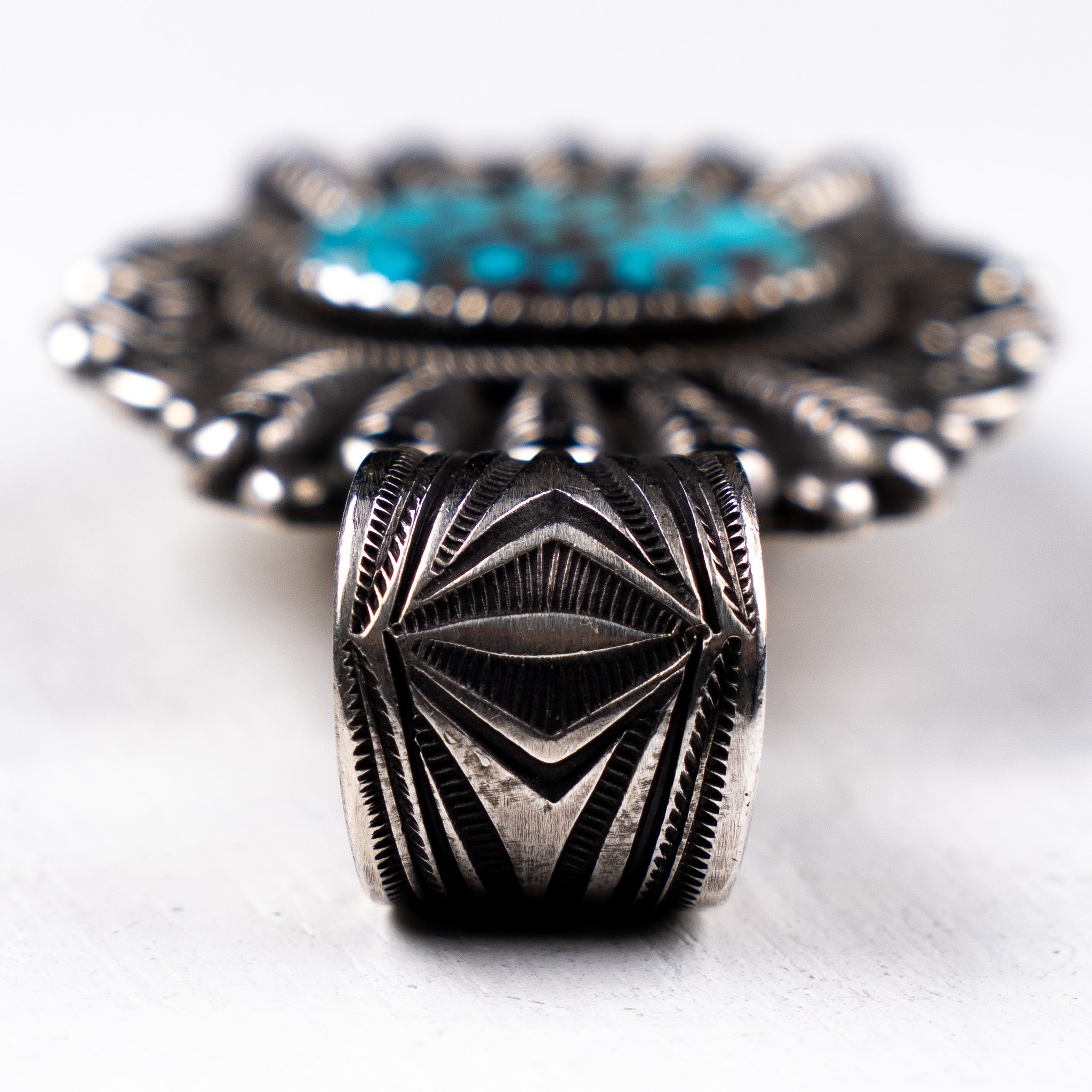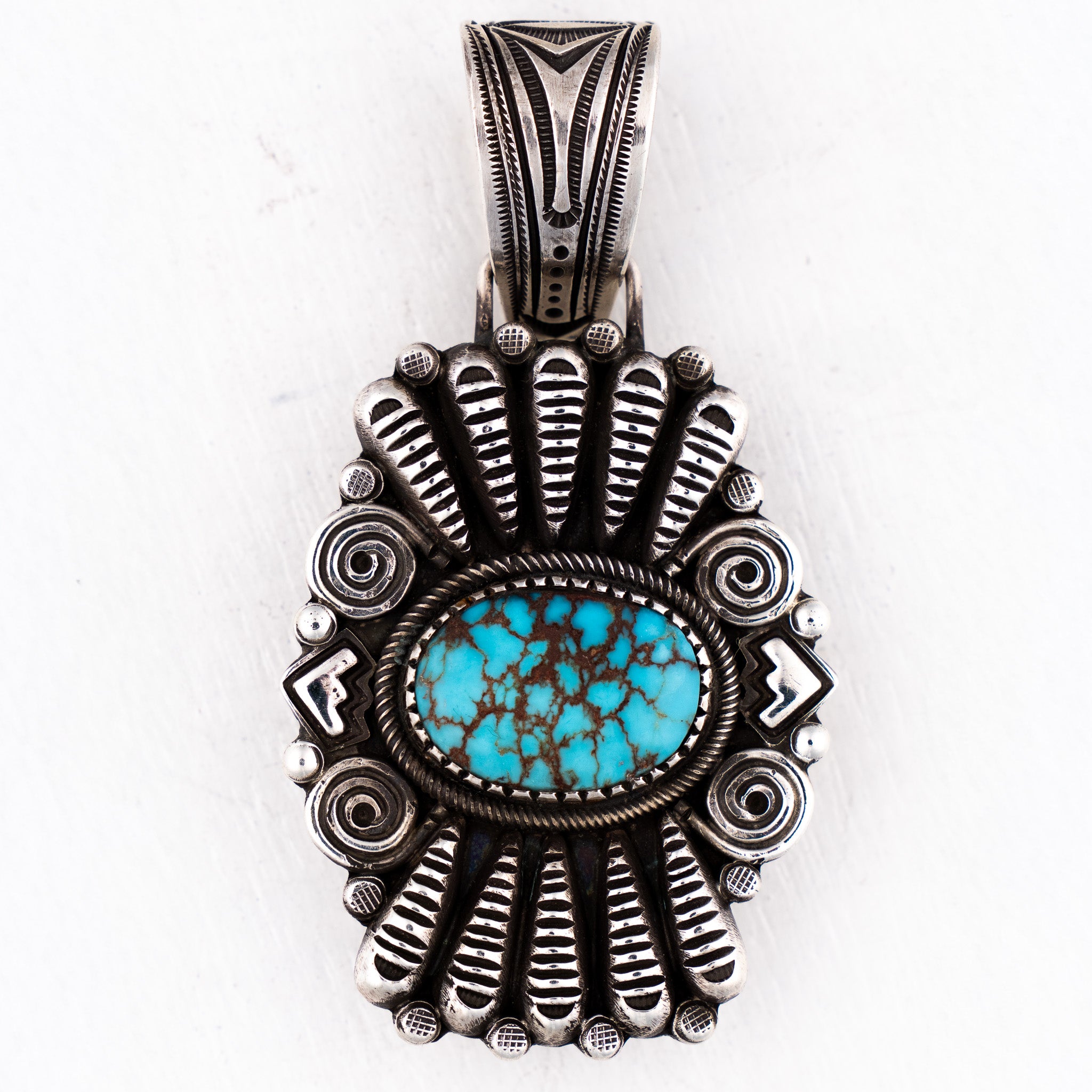 Calvin Martinez presents an eye-catching pendant with this piece! Expert applique work, a finely hand-stamped bail, a hand-cut bezel, delicate twisted wire details, and geometric hand-stamping show off Martinez’ skill as a silversmith. With a vibrant Candelaria Turquoise stone at the center, this is not a piece you want to miss.