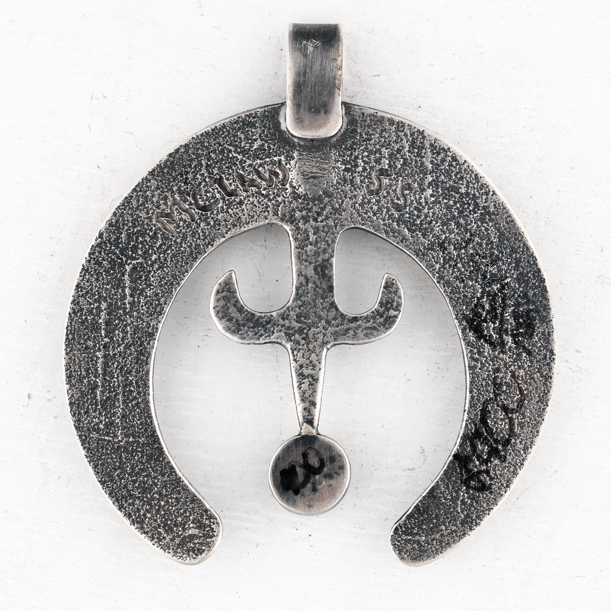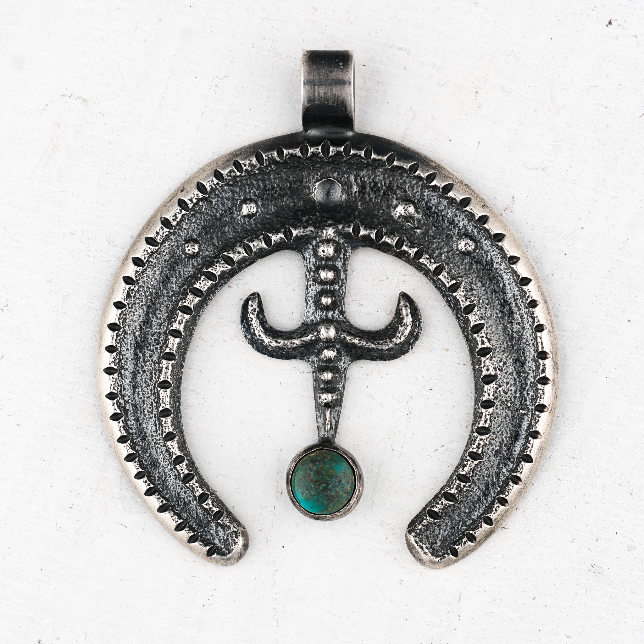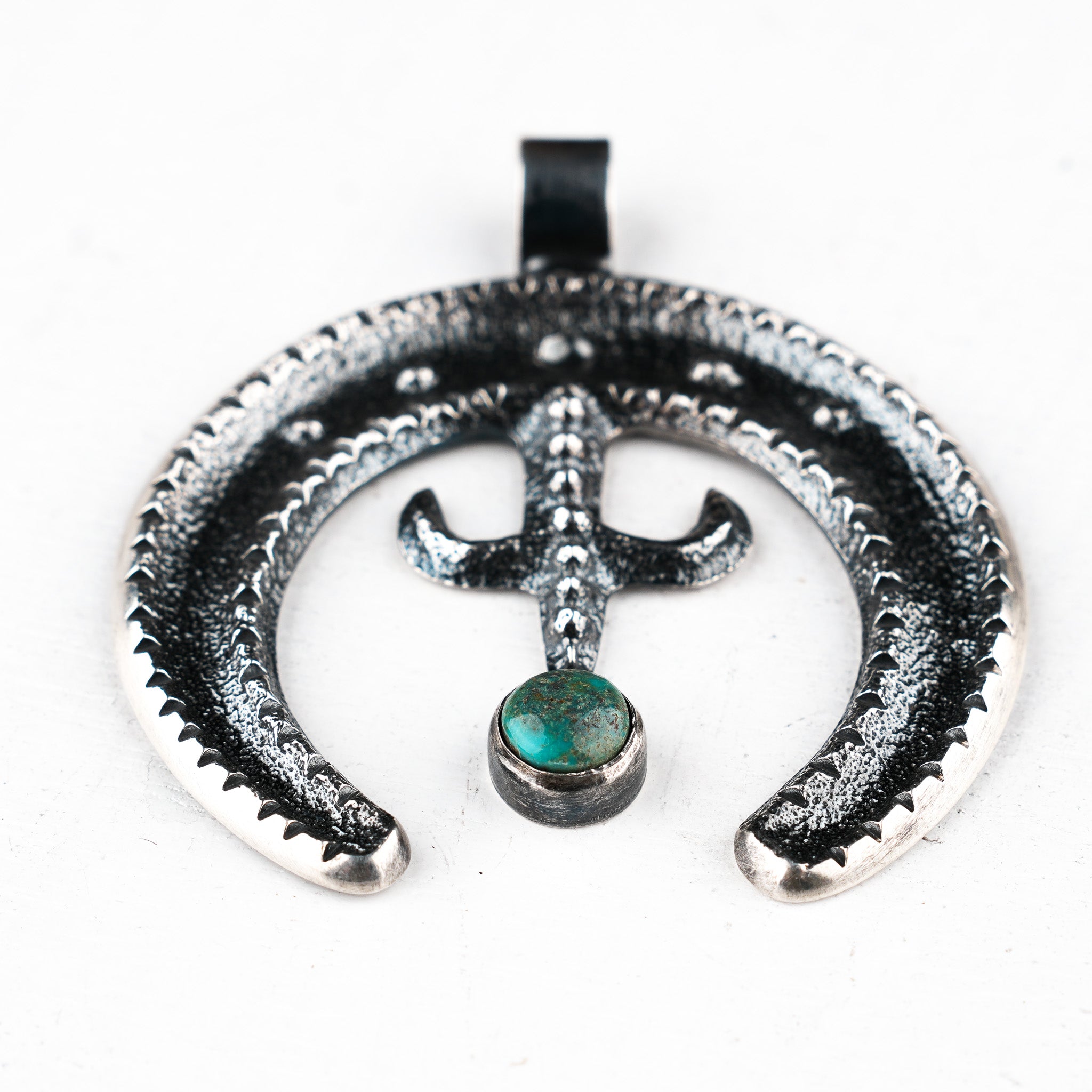 A hand-cut Sonoran Gold Turquoise stone sits in the center of this stunning pendant hand-crafted by Monty Claw. Tufa cast sterling silver surrounds the Sonoran Gold Turquoise stone, creating a textured landscape that draws the eye. A beautiful and unique work of art, this pendant is sure to be loved for generations.