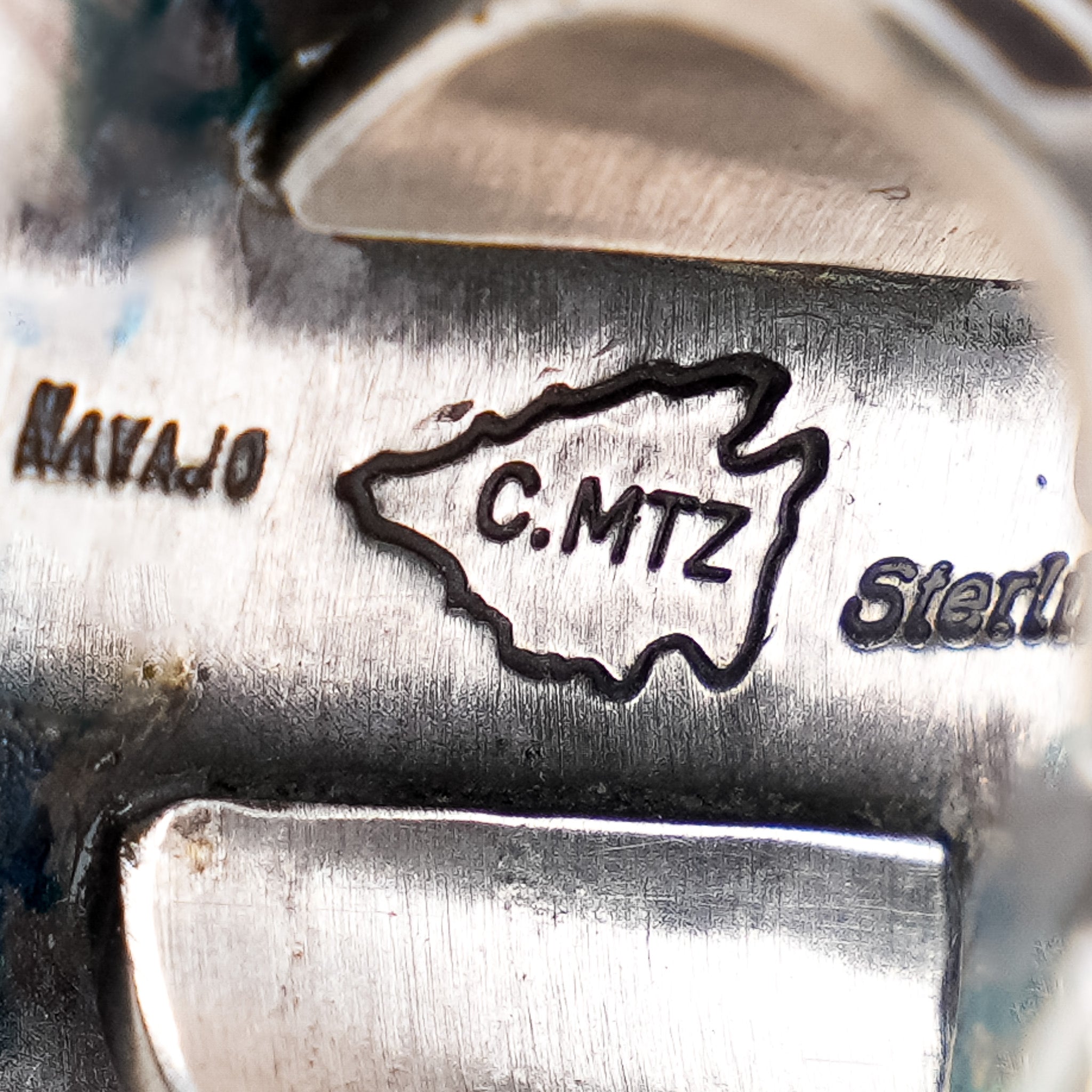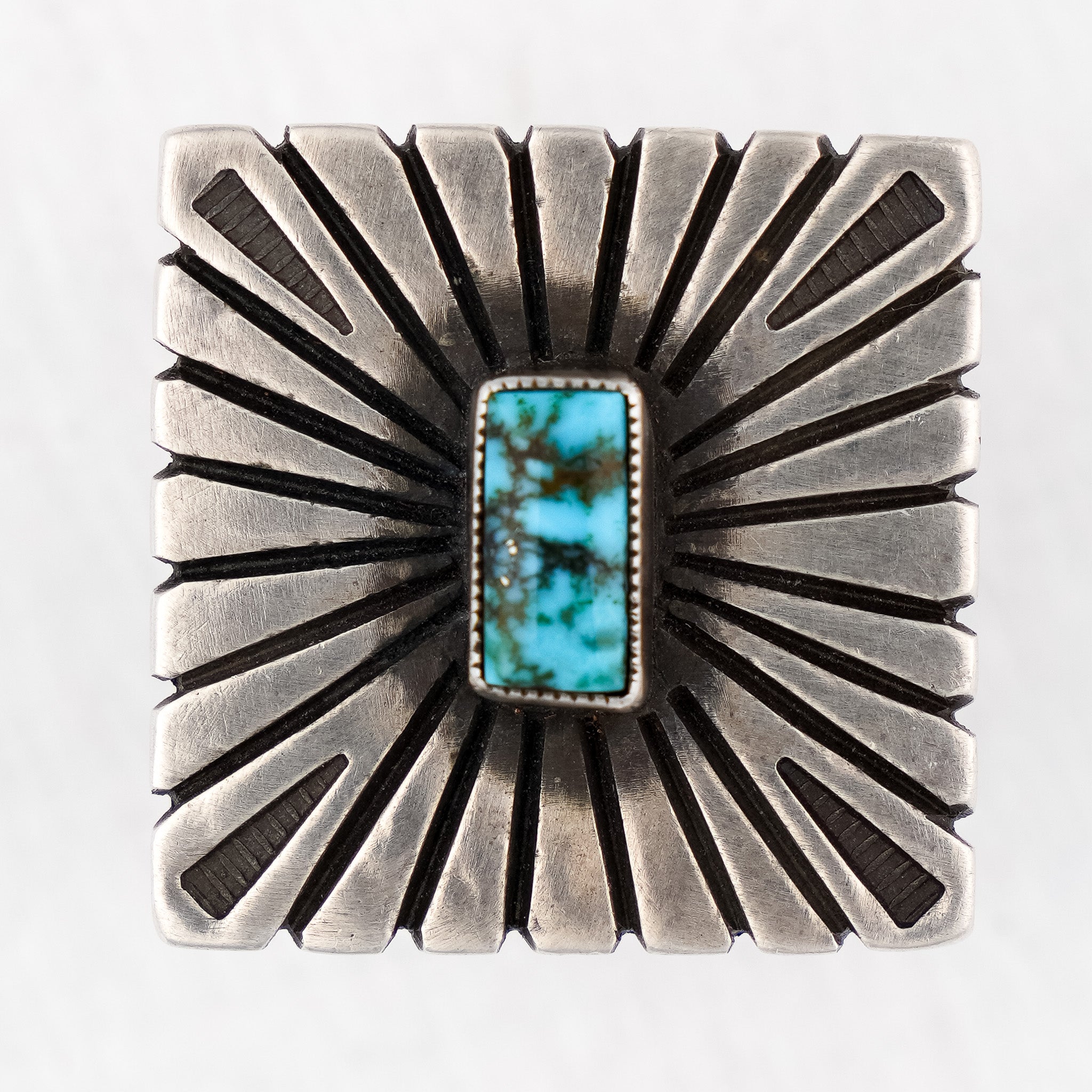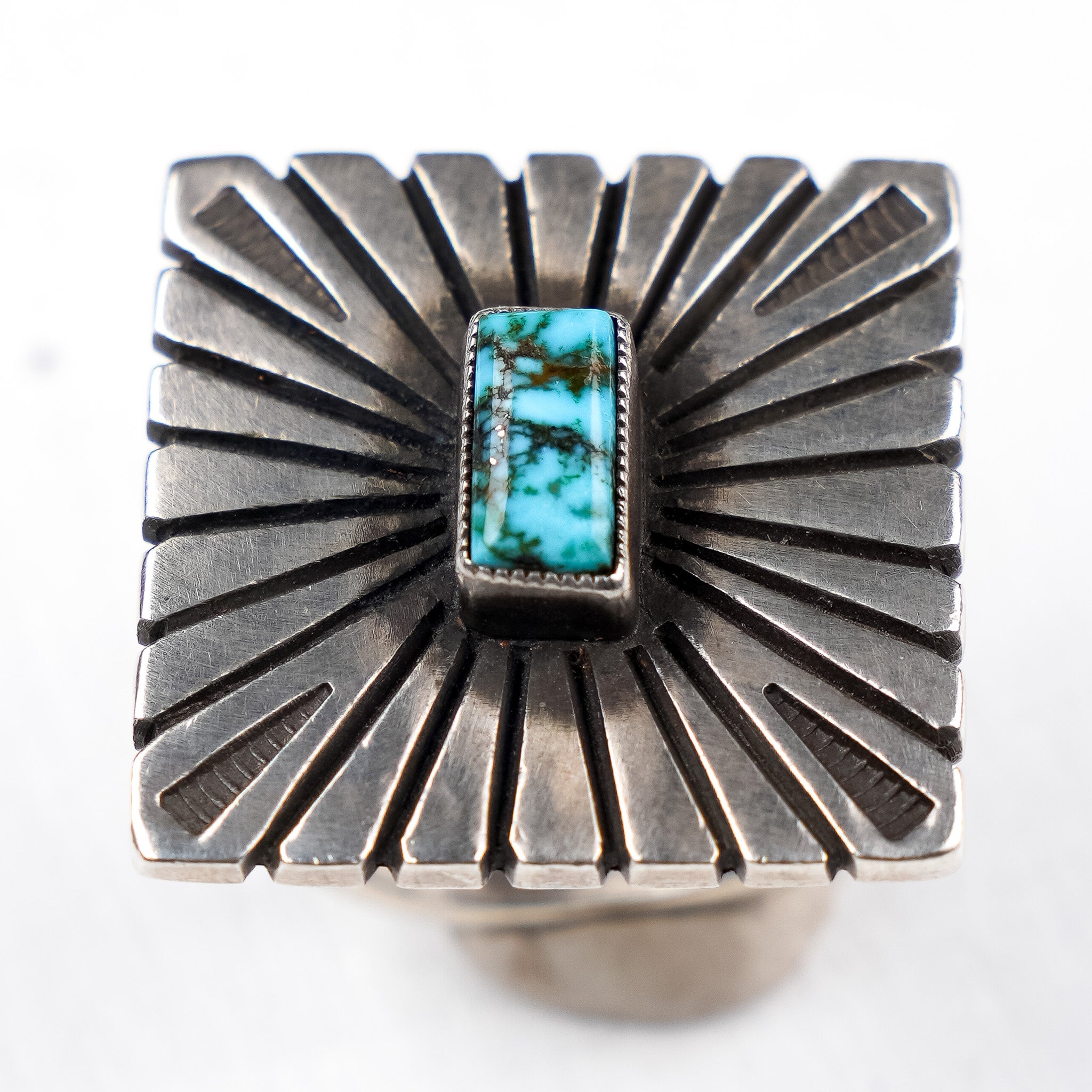 A truly unique piece, this ring was hand-crafted by Calvin Martinez. Geometric hand-stamping and file-work form textured designs behind the vibrant Birdseye Kingman Turquoise stone at the center of this piece. Constructed entirely out of ingot sterling silver and elevated by a hand-stamped bail, this is a one-of-a-kind ring full of detail and visual depth.