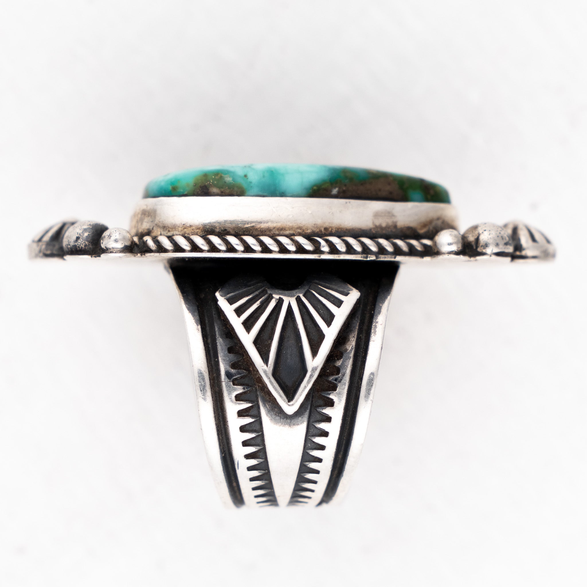 A beautiful Sonoran Turquoise stone shows off green hues with this type of turquoise’s characteristic gleam. Handcrafted by acclaimed artisan Albert Jake, this ring is full of silver-work, including a hand-stamped band, silver drops, silver buttons, and a twisted wire detail.