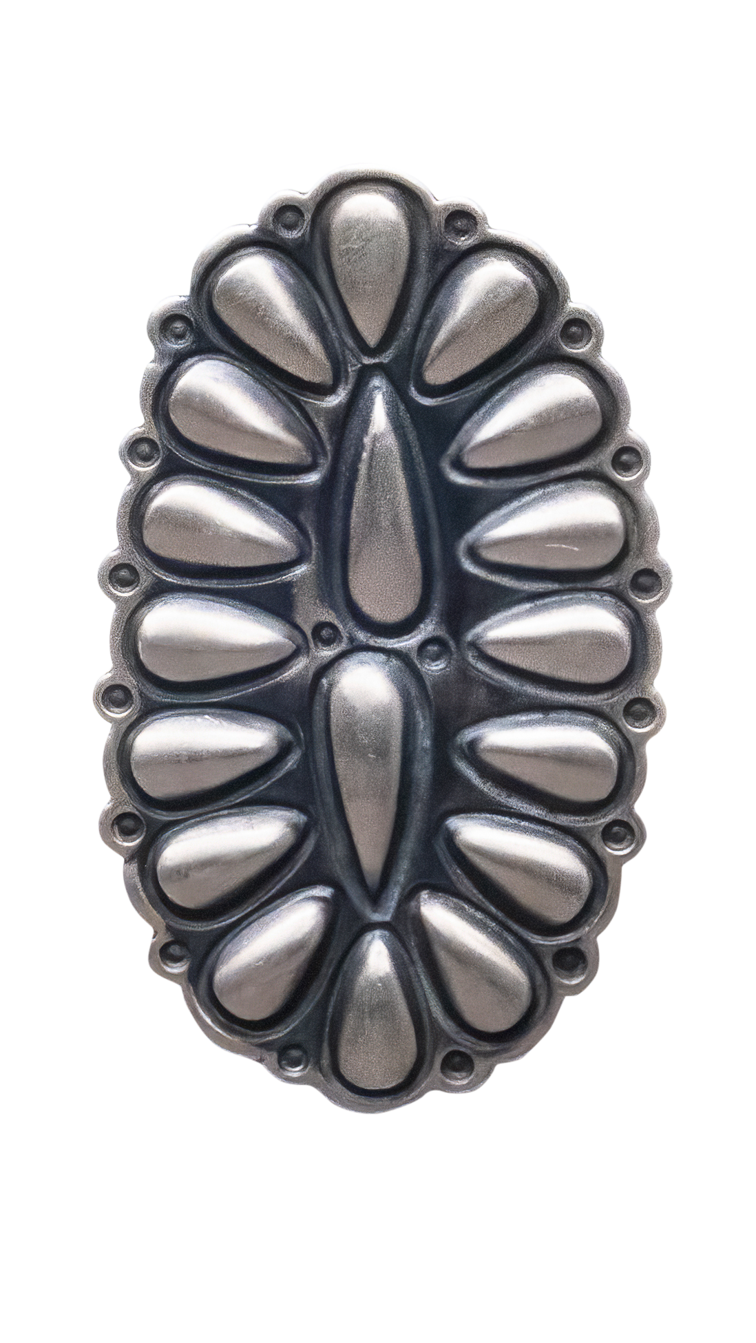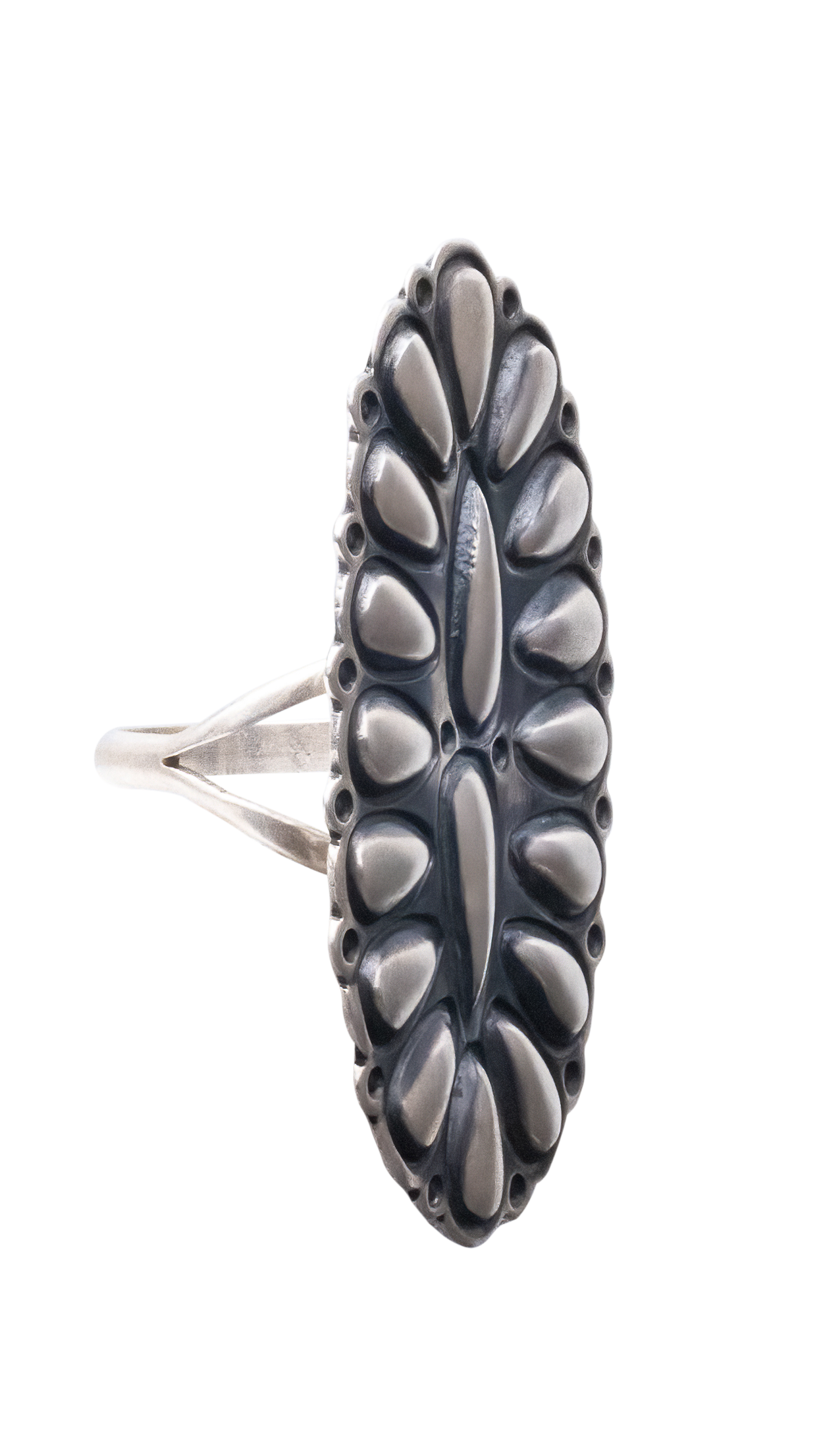 Handcrafted by Navajo artist Charles Johnson, this sterling silver ring boasts hand-stamped, geometric repouseé designs arranged in a cluster style that draws the eye. With sliver drops that lived the edges for additional texture, this is a stunning piece sure to be a welcome addition to any outfit. Simple yet effective, this ring speaks of exemplary silver-work technique and a dedication to intriguing textures.