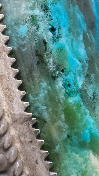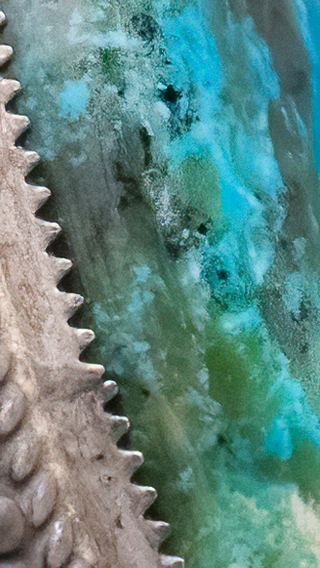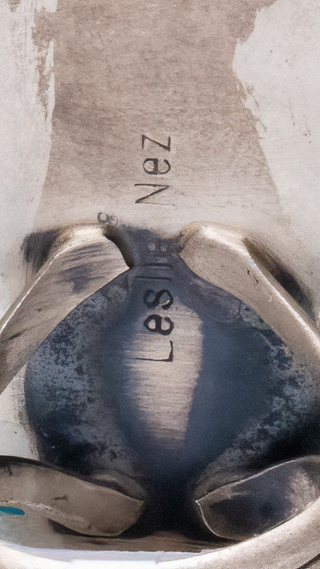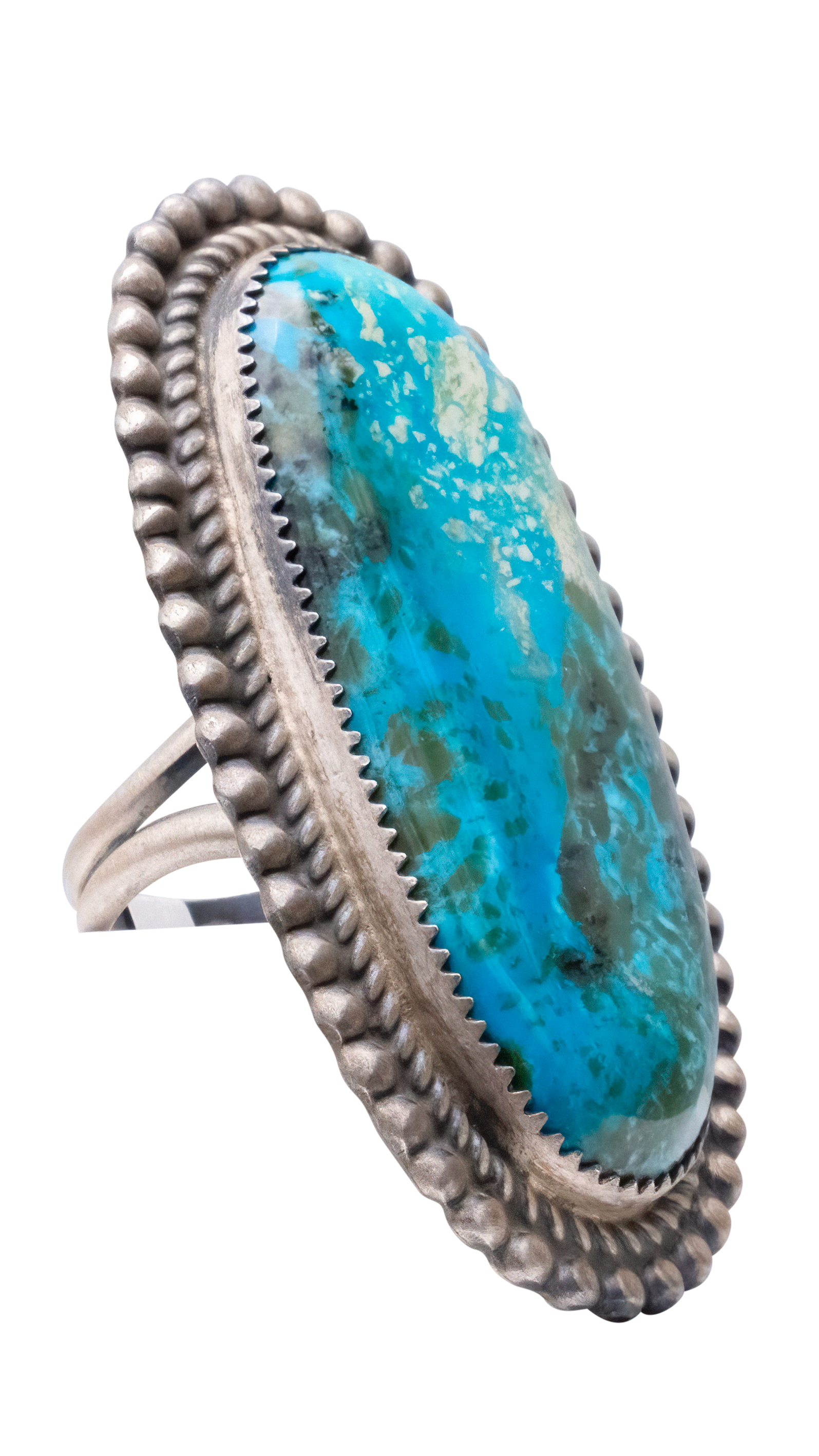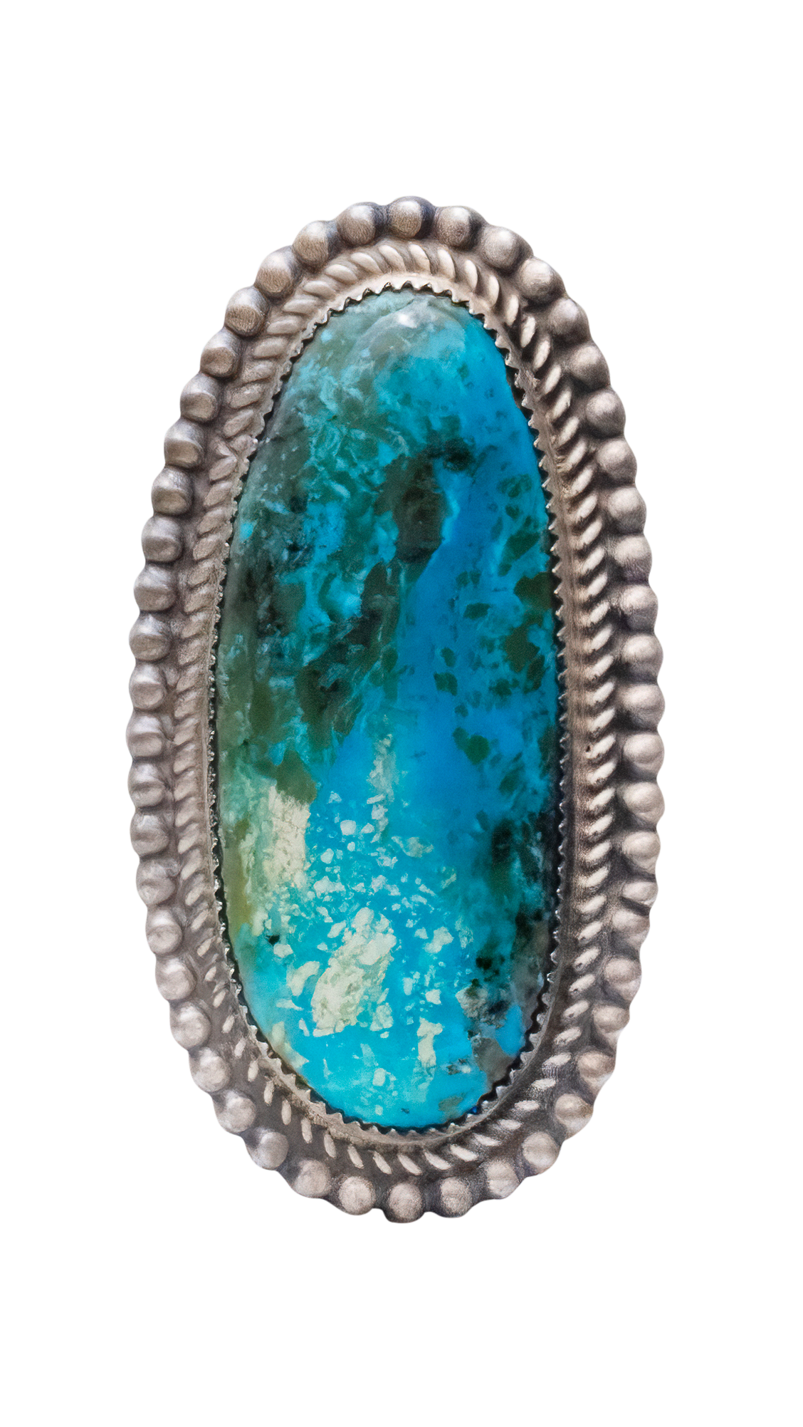 This ring, made by Navajo artist Leslie Nez, features a center stone of Kingman Turquoise. The stone is the shining moment, with it's swirling hues of dark green and blue that resemble rolling ocean water set in a sawtooth bezel and wrapped in twist wire. Flattened silver drops wrap around the sides of the ring, adding yet another bit of texture to this piece.