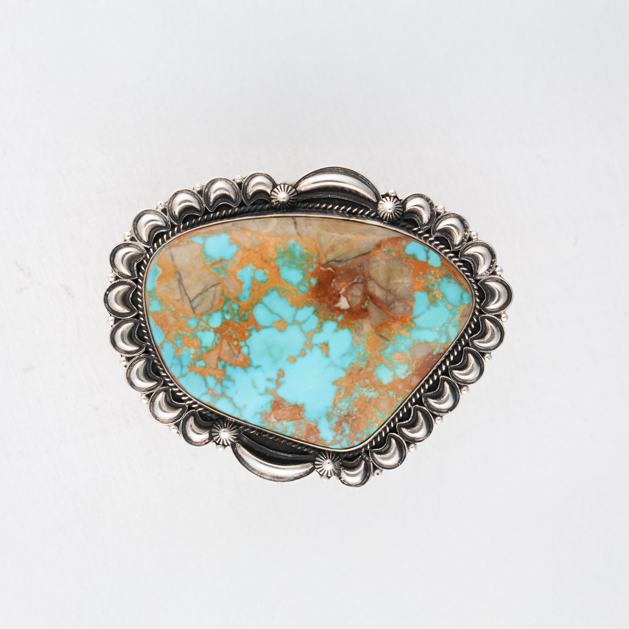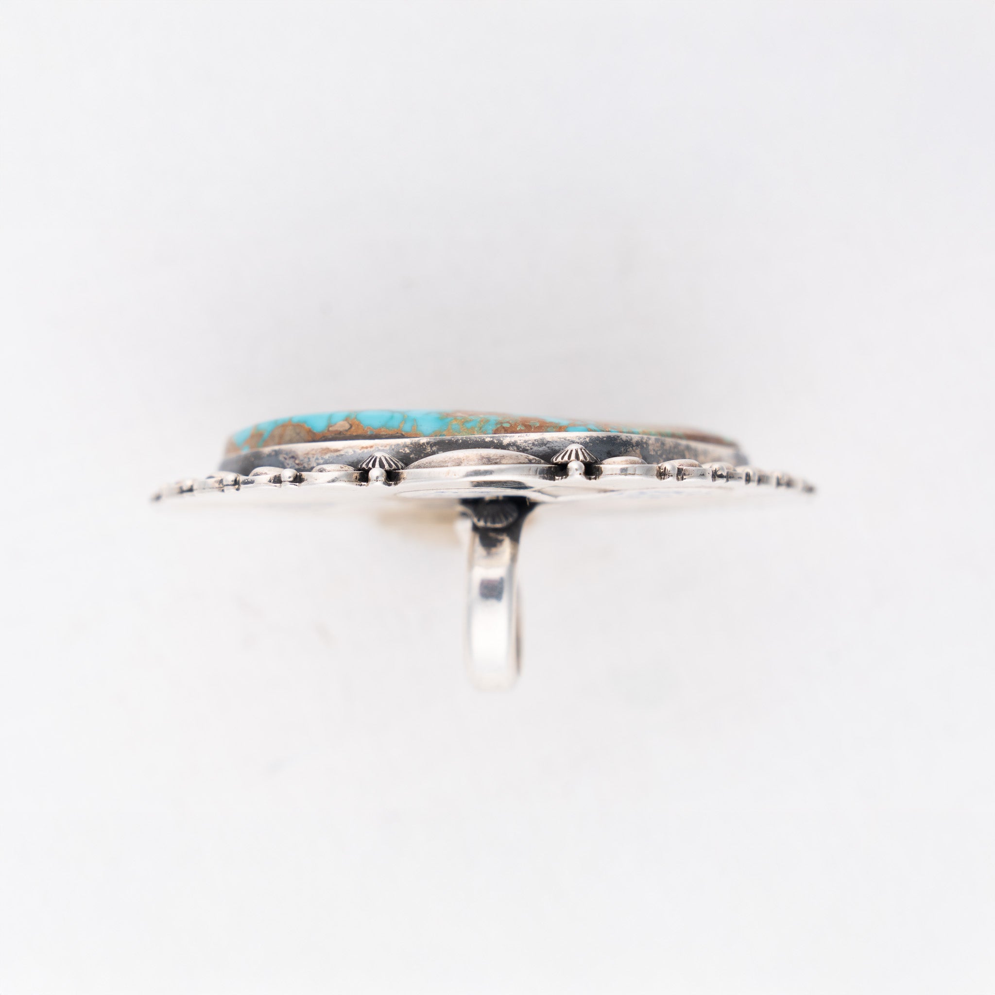 A bold Royston Turquoise stone takes center stage in this beautiful sterling silver ring crafted by accomplished artisan Derrick Gordon. Surrounded by twisted wire detailing and star buttons, the turquoise shows off vibrant blues and a deep brown matrix elevated by the stone’s asymmetrical shape. This is an eye-catching piece!